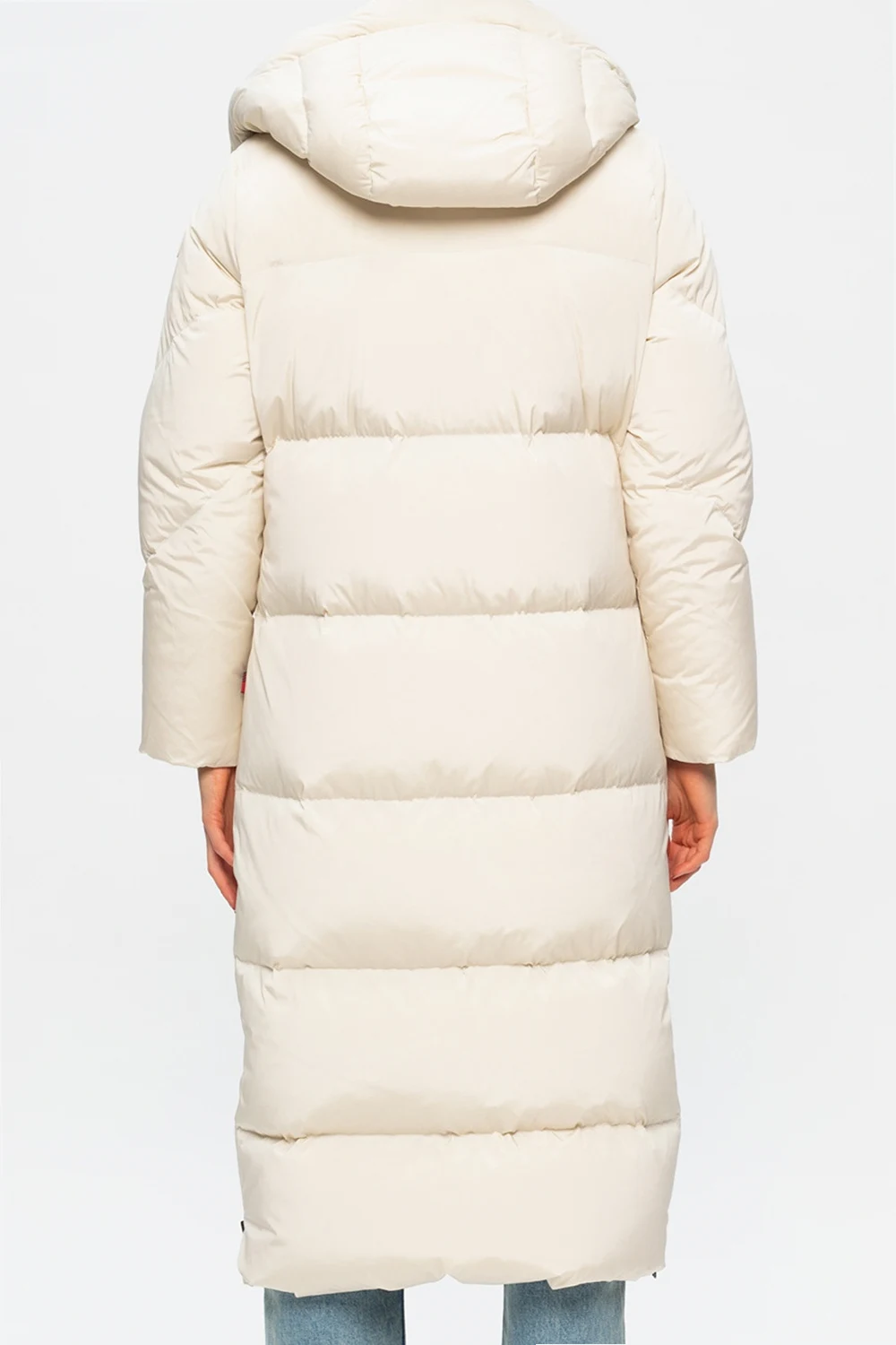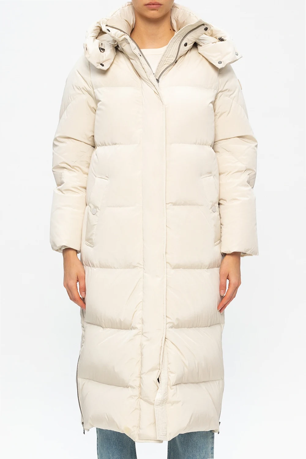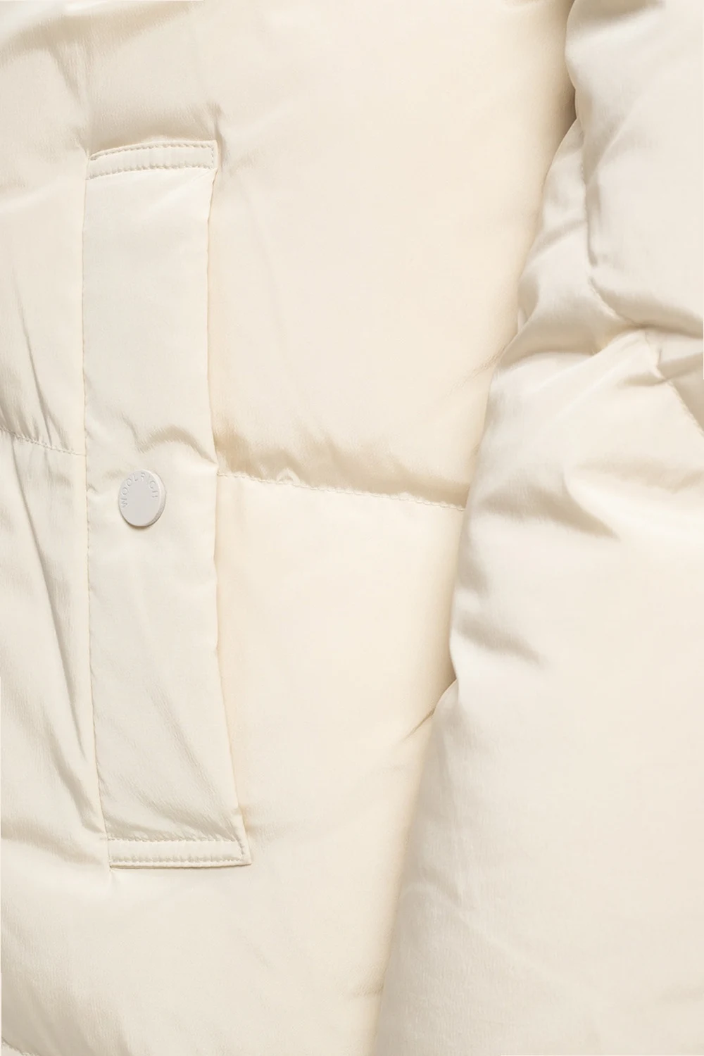Cream coat from Woolrich. Padded with duck down, this wintry design fastens via two-way zip and snap closures and employs detachable drawstring hood with logo print, two snap-fastened pockets on the front, zipped vents on the sides and long sleeves, one of which showcases rubberised logo patch.