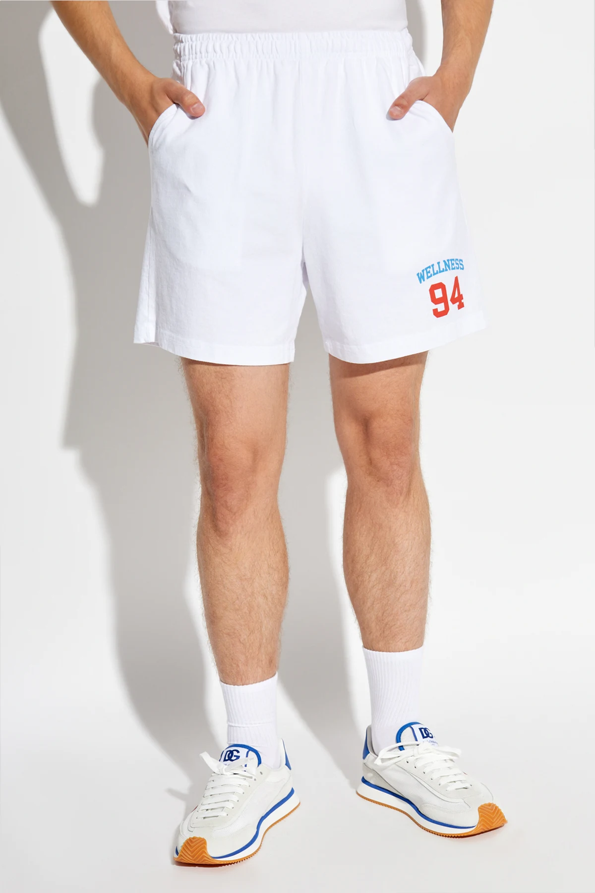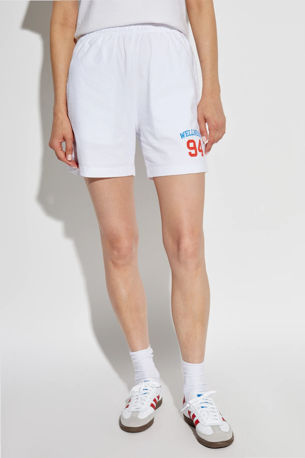 Introducing the epitome of summer comfort and style - the Sporty & Rich Cotton Shorts. Crafted from 100% premium cotton, these white shorts exude a sense of luxury while ensuring breathability and ease on warm days. The relaxed fit promises unrivaled comfort, making them a perfect choice for leisurely days or active afternoons alike. The design boasts an elastic waistband with drawstring closure, allowing for a customizable fit that flatters various body types. A touch of exclusivity is added by the vividly colored \"WELLNESS\" inscription in blue and the striking \"94\" in red on one side, symbolizing the shorts\' connection to the Sporty & Rich ethos of blending wellness with fashion. Additionally, these shorts are not only about style but also functionality, featuring three slip pockets, including a practical rear pocket, for carrying essentials. Why Purchase These Cotton Shorts? Exquisite Material: Made from 100% cotton, offering both comfort and durability. Unique Design: The \"WELLNESS\" and \"94\" details add a distinctive touch, reflecting the shorts\' high-end origins. Versatile Style: The elegant white color and relaxed fit make them a versatile addition to any wardrobe. Practical Features: Equipped with an elastic waistband, drawstring, and three pockets, they combine fashion with functionality.