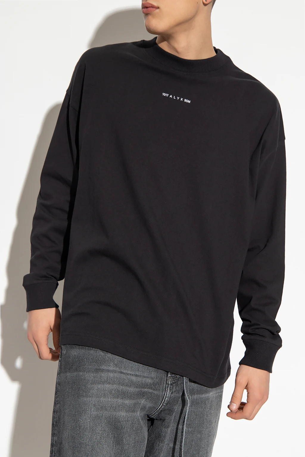 Black T-shirt from 1017 ALYX 9SM. Made of cotton, this long sleeve design features a white logo print and ribbed trims at the crew neck, hem and cuffs.