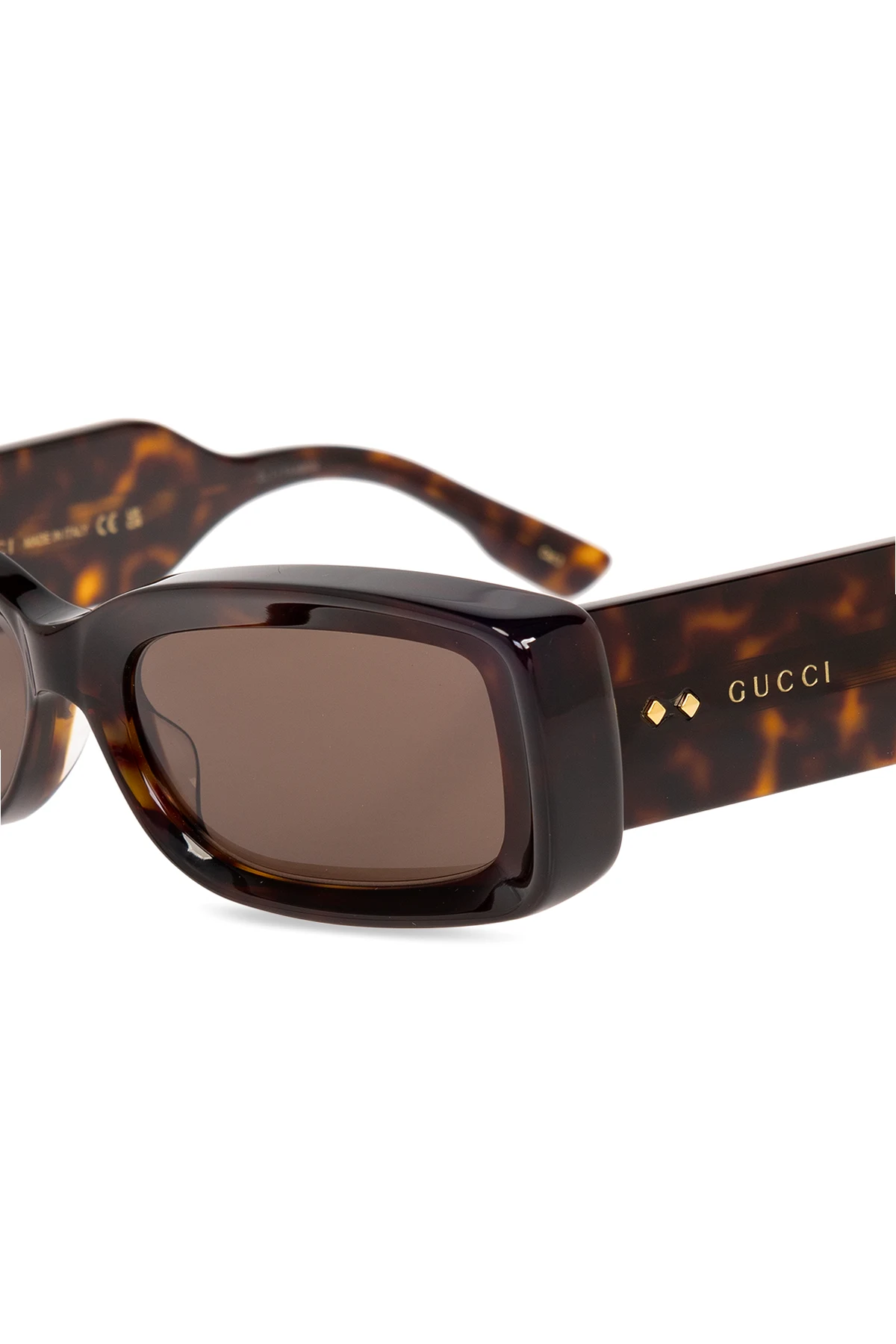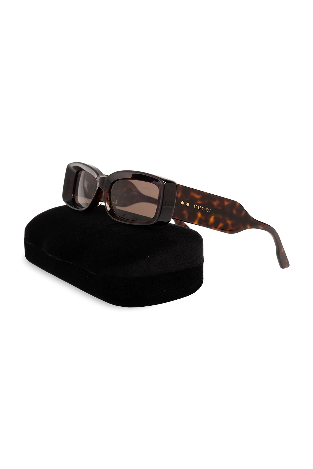 Black, brown and yellow sunglasses from Gucci. Decorated with a gold-tone logo and a tortoiseshell pattern, this rectangular frame pair features brown lenses with 100% UVA/UVB protection. The case colour is individually selected for each pair of glasses.