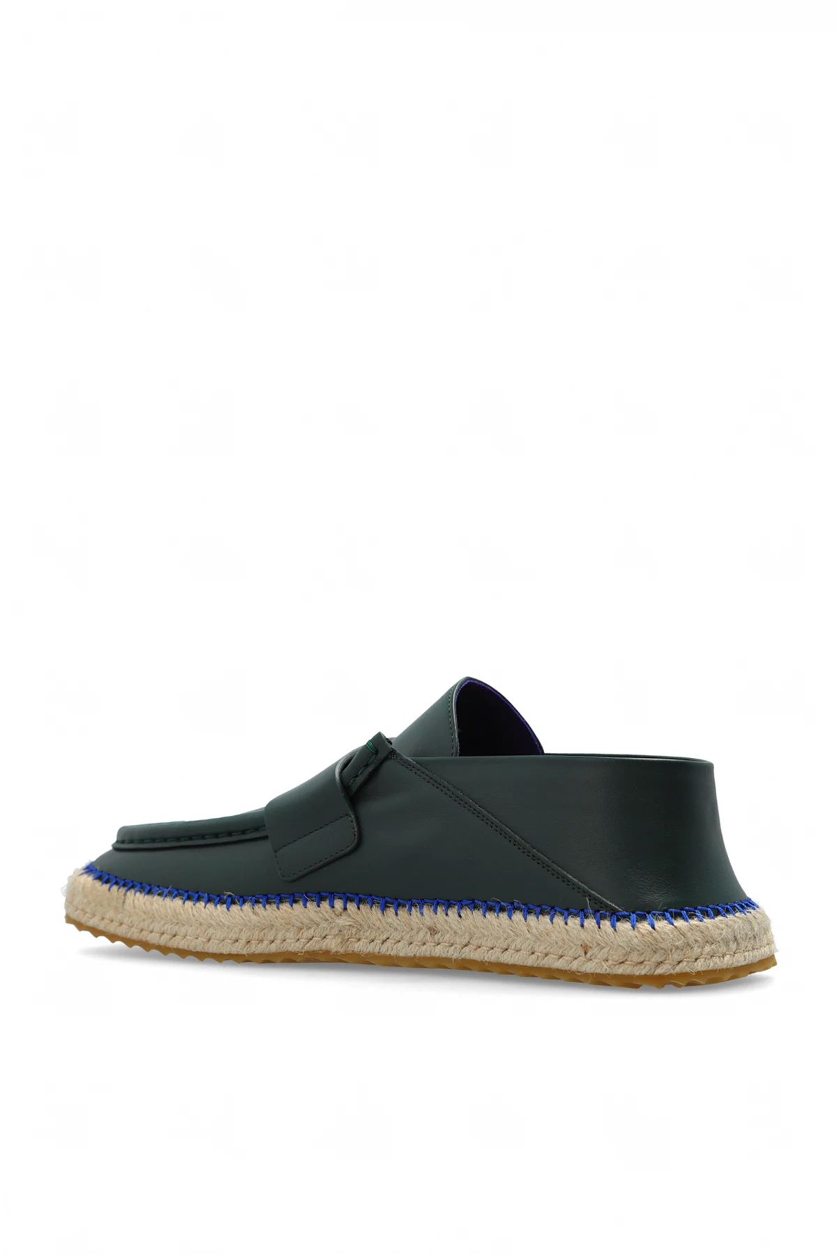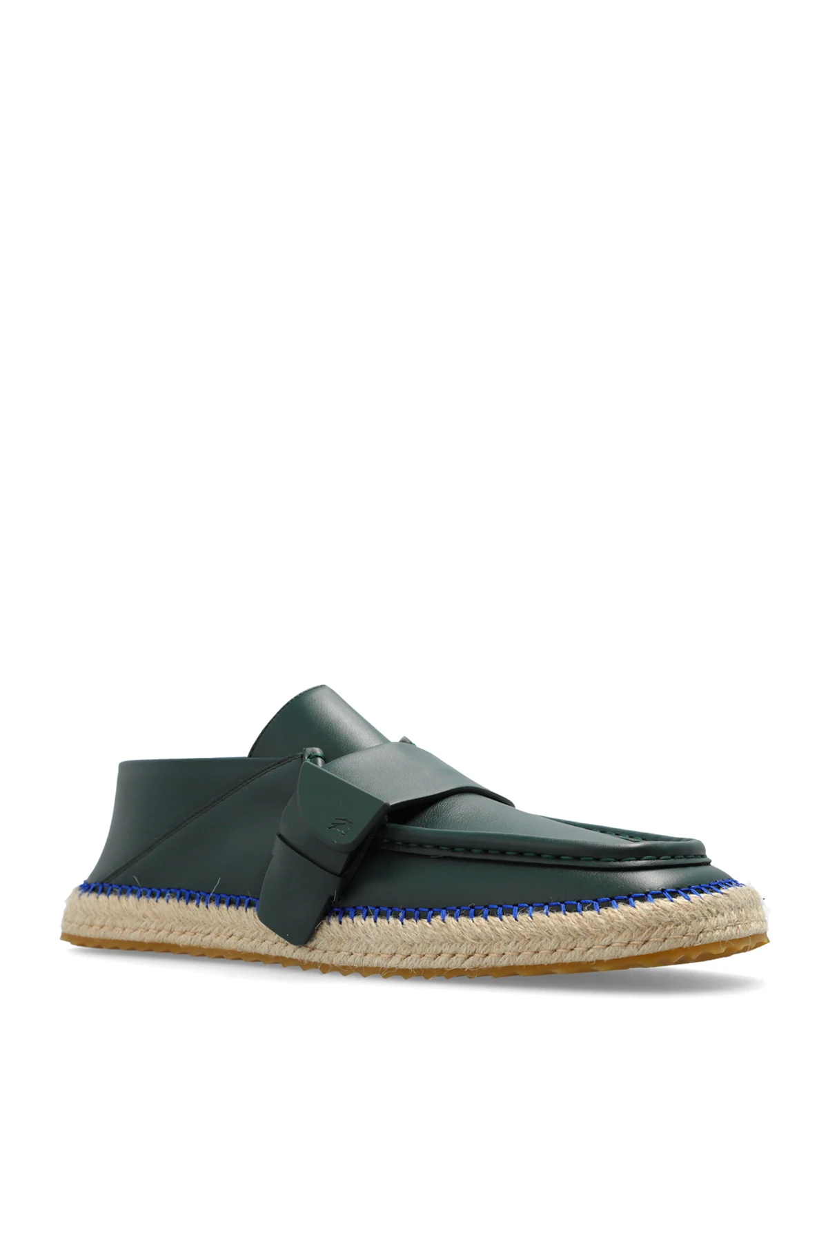 Introducing the ‘Deck Low’ Leather Shoes by Burberry, a quintessence of sophistication and impeccable style. Crafted with precision, these shoes feature a lustrous, dark green leather exterior that speaks volumes of their high quality and durability. The smooth surface of the leather, along with a unicolor finish, enhances the elegant silhouette of these moccasin-style shoes. The design is accentuated with a distinct, wide strap across the vamp, serving as both a decorative element and a testament to the meticulous craftsmanship. The visible stitching around the toe and sides not only underscores the solid construction but also adds a touch of classic charm. Despite their initial appearance, these shoes boast a low-profile construction, seamlessly blending the sleek allure of espadrilles with the sturdy flat sole made of jute rope, ensuring comfort and stability with every step. The interior bears the signature Burberry logo on the insole, a mark of authenticity and luxury. The outer and inner layers of the shoe are made of premium leather, with a durable rubber sole, guaranteeing both comfort and longevity. Why Purchase This Product? Elegant dark green color, perfect for versatile styling. Exquisite leather material offering durability and a smooth finish. Classic, low-profile design with a unique jute rope sole for added uniqueness. Signature Burberry authenticity with the interior logo detailing. Ideal combination of style, comfort, and stability.
