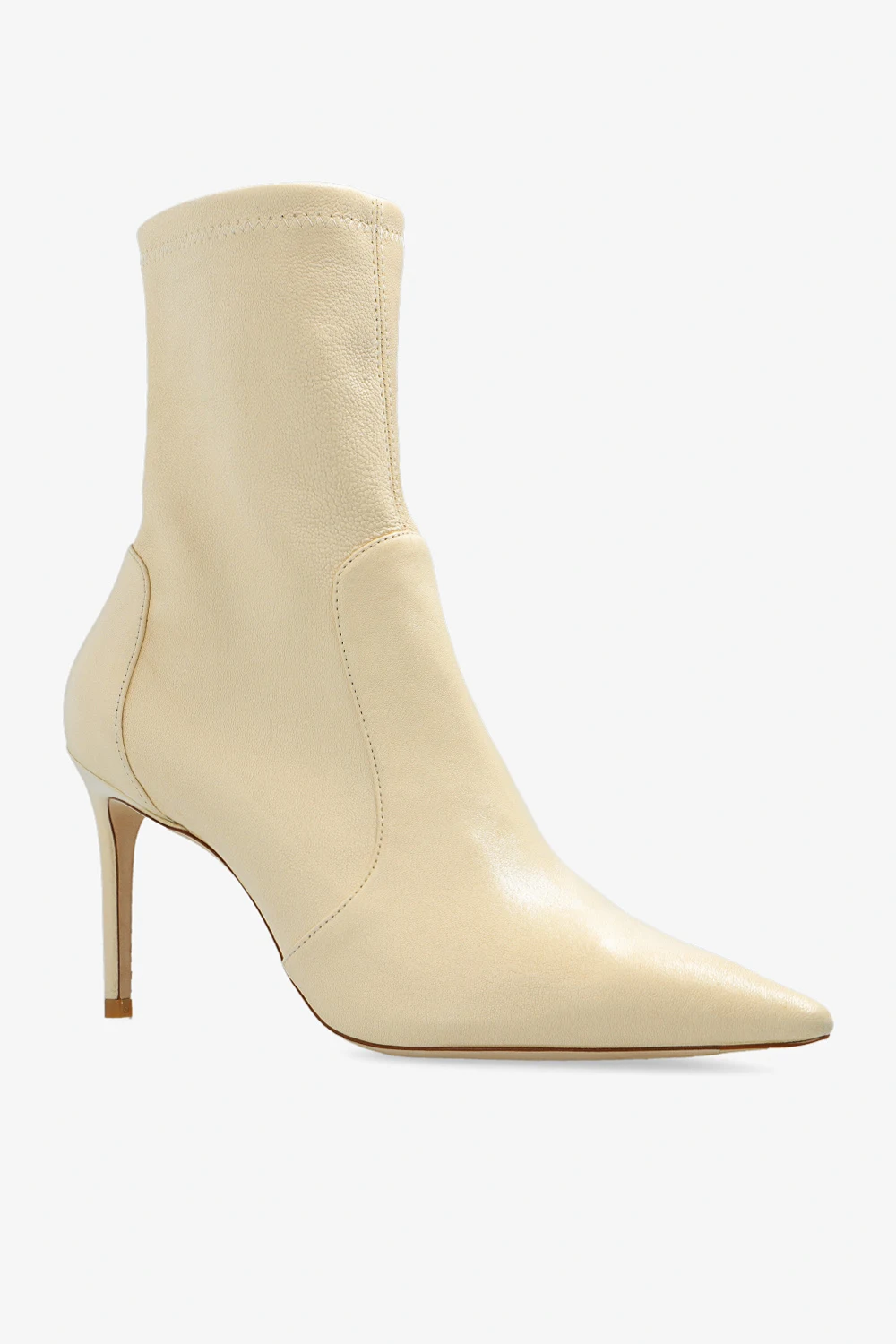 Cream ‘Stuart’ heeled ankle boots from Stuart Weitzman. Crafted from leather with a slip-on silhouette, this model features a pointed toe and a cream leather sole.