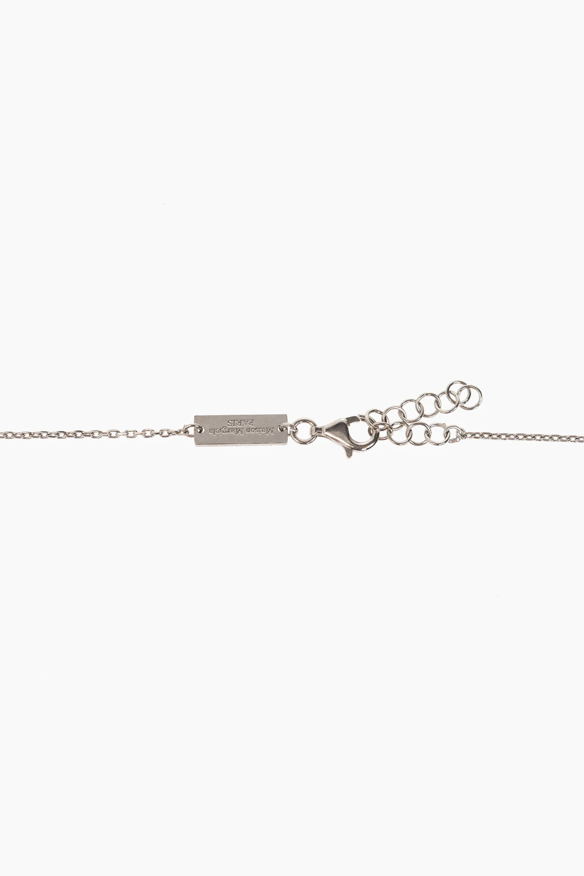 Silver-tone necklace from Maison Margiela. Made of sterling silver, this item adjusts via a lobster clasp and features a logo-engraved pendant.