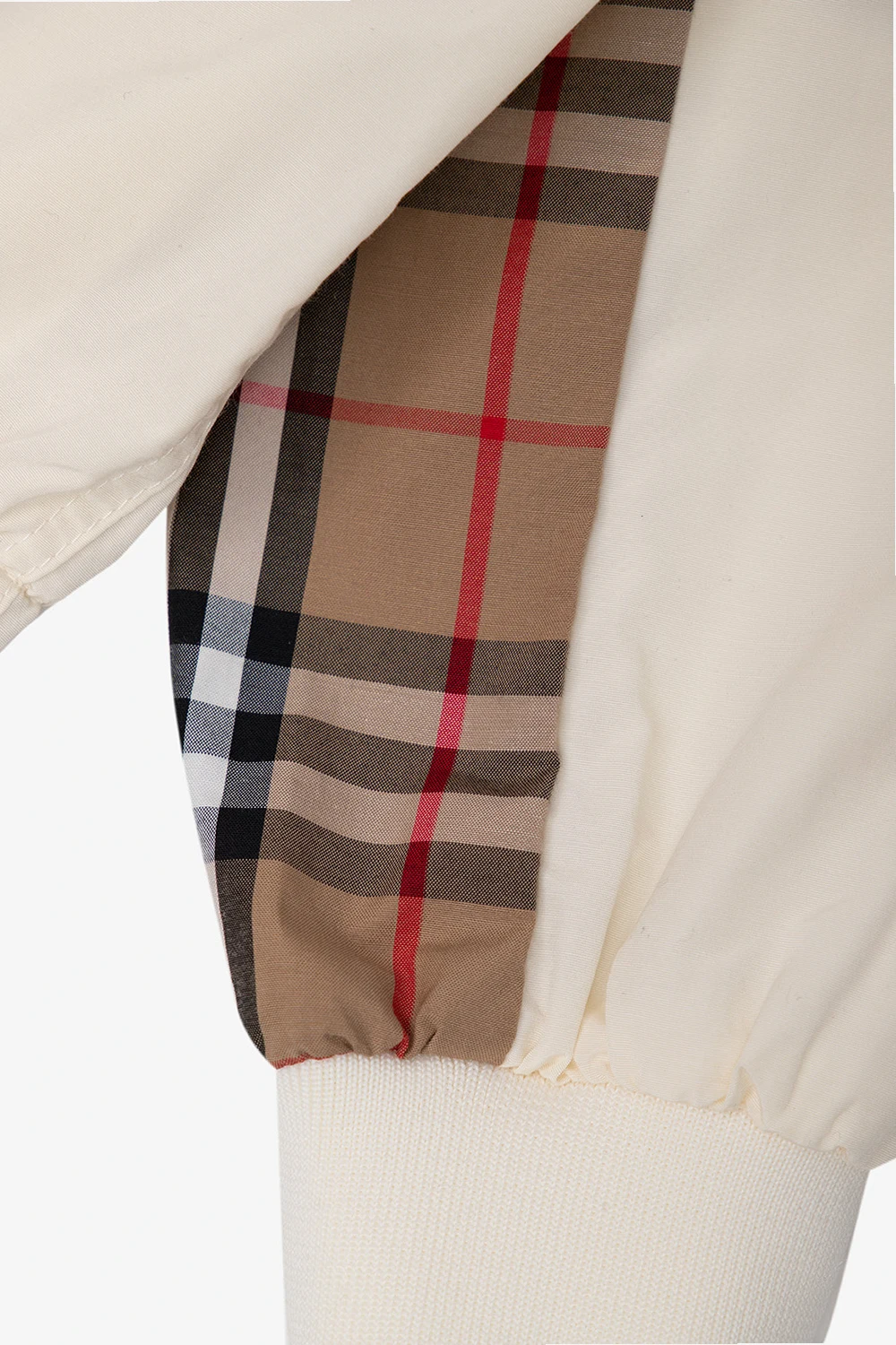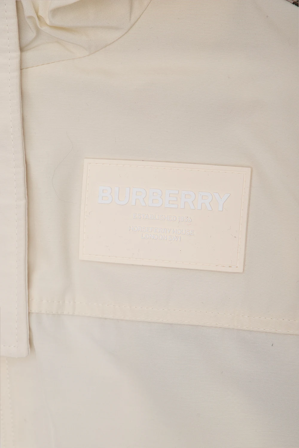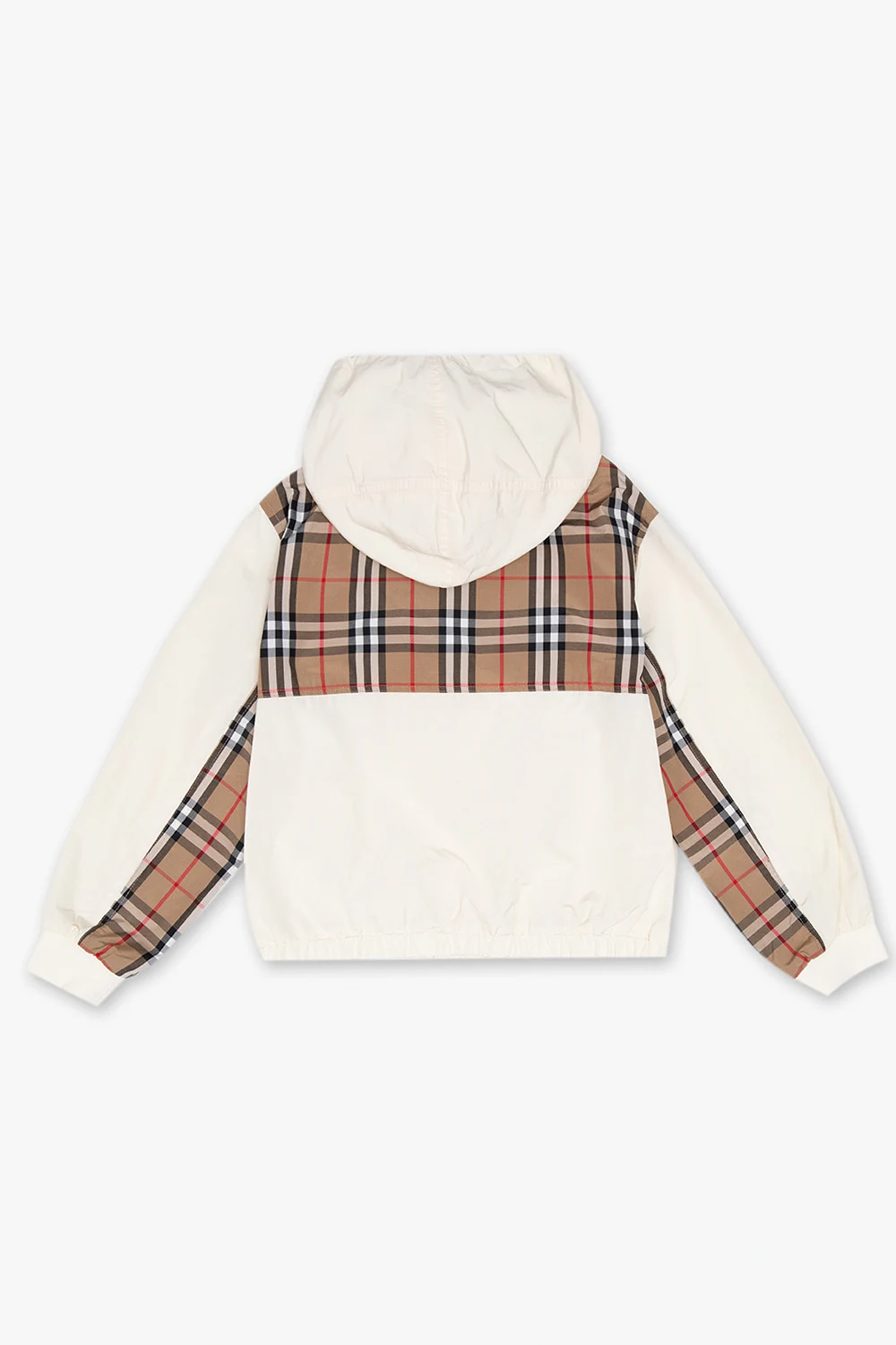 Cream ‘Marina’ hooded jacket from Burberry Kids. Fastened with a zip and snaps, this garment features a logo patch, brown fabric inserts with the brand’s signature multicolored check, two snap-fastened flap pockets, mesh lining and long sleeves with ribbed cuffs.