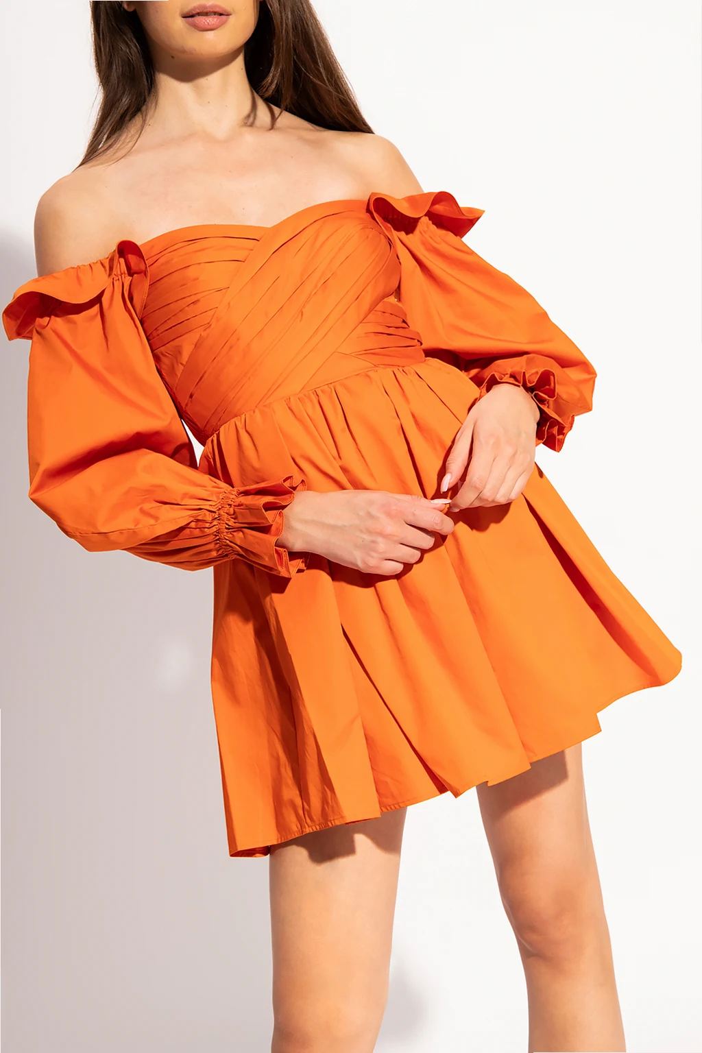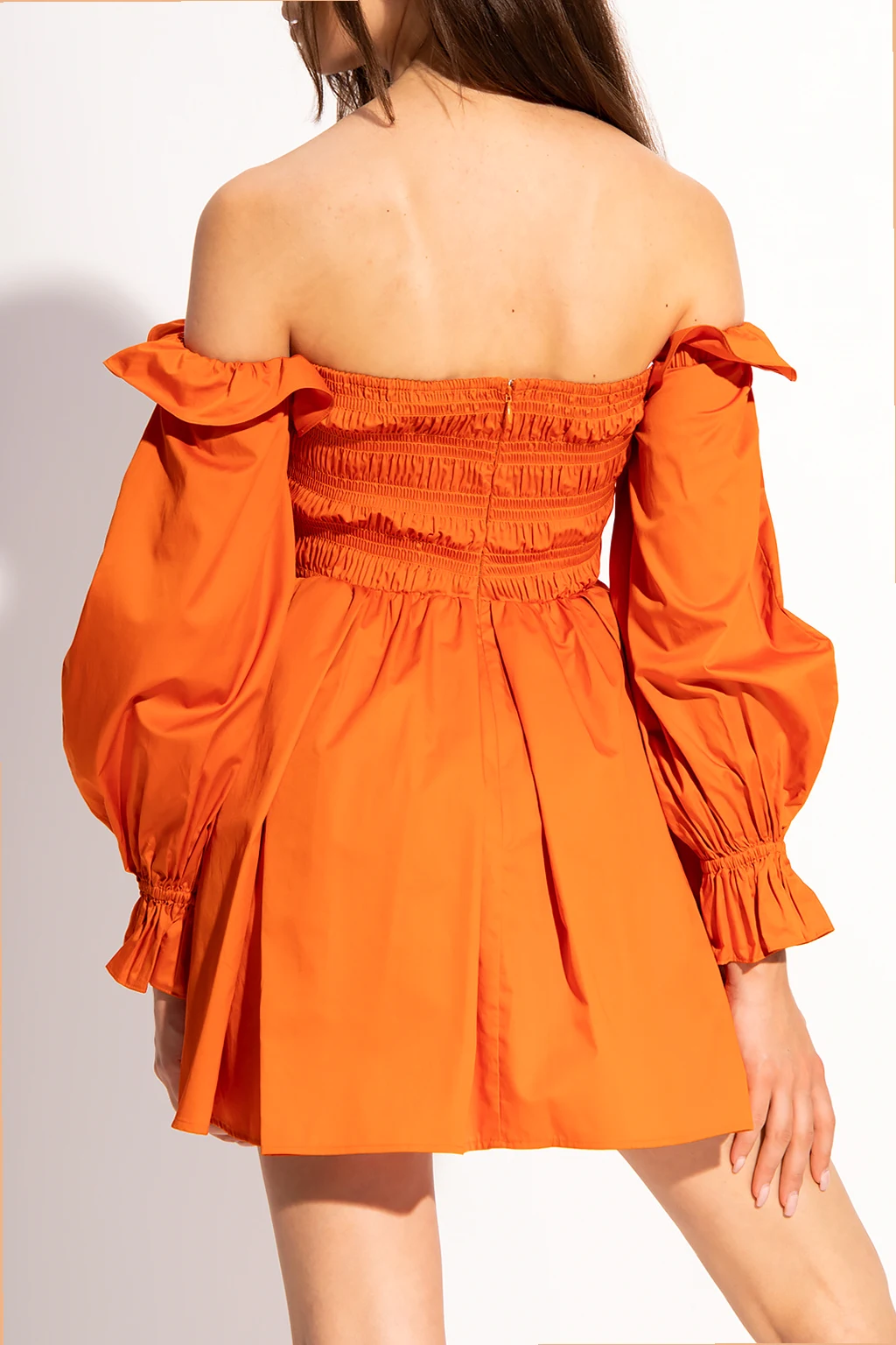 Orange dress from Self-Portrait. Crafted from cotton, this style features a zip and a hook & eye closure on the back, denuded shoulders, a shirred waist, slip pockets on the sides and wide, long sleeves with ruffled cuffs.