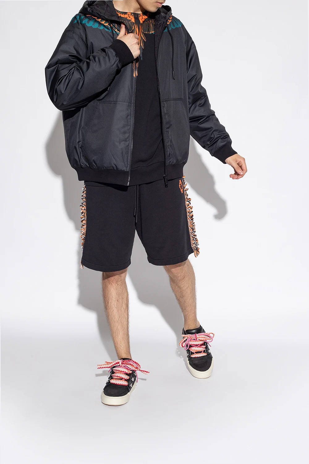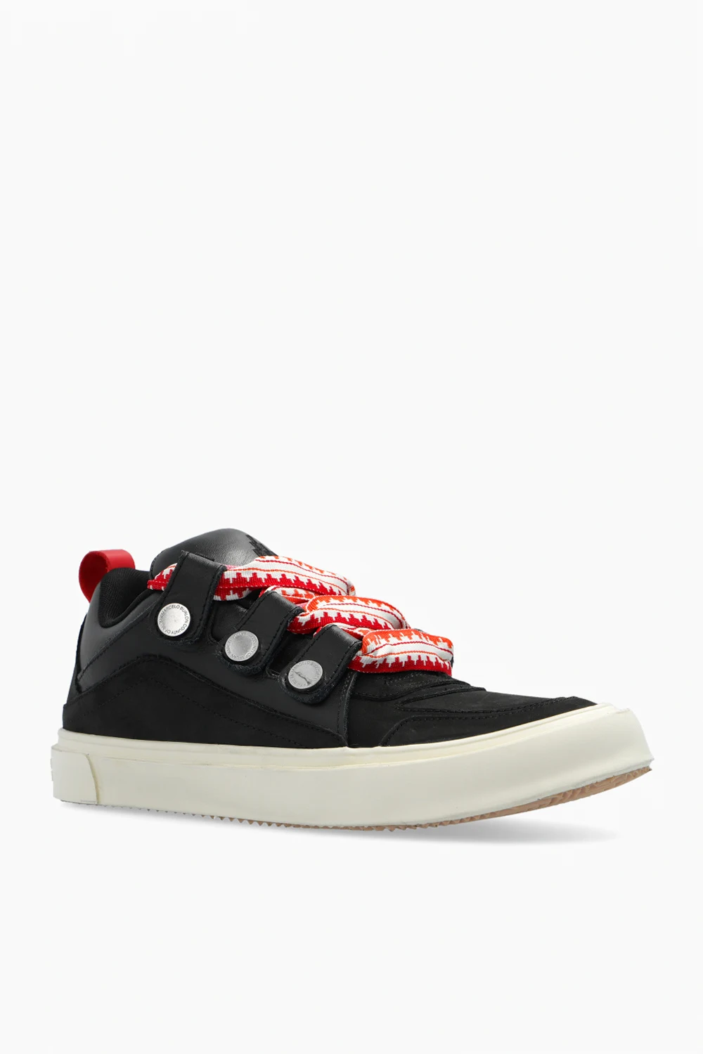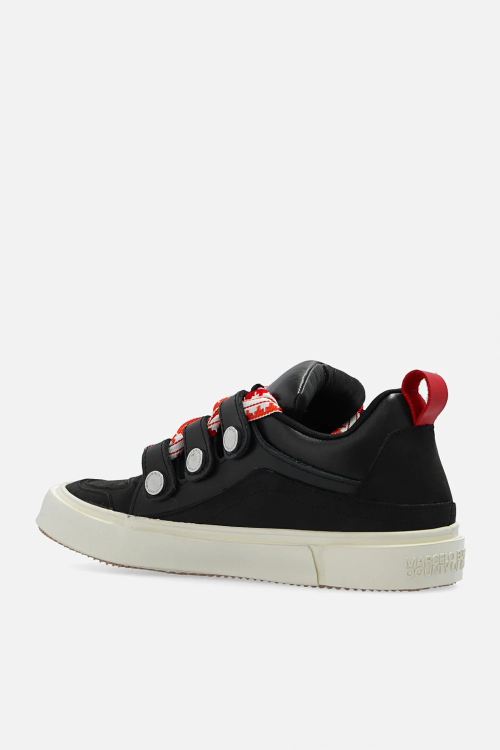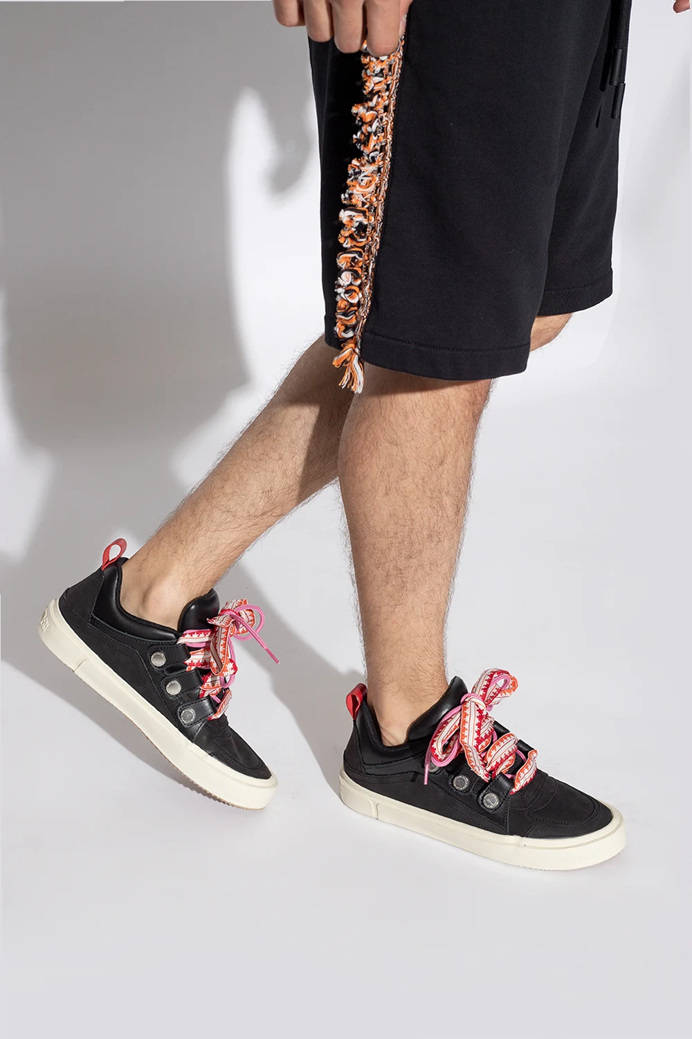 Black ‘Ticinella’ sneakers from Marcelo Burlon. Crafted from leather and fabric, this lace-up model sits on a pink rubber sole and features thick, colourful laces and an embroidered logo pattern.