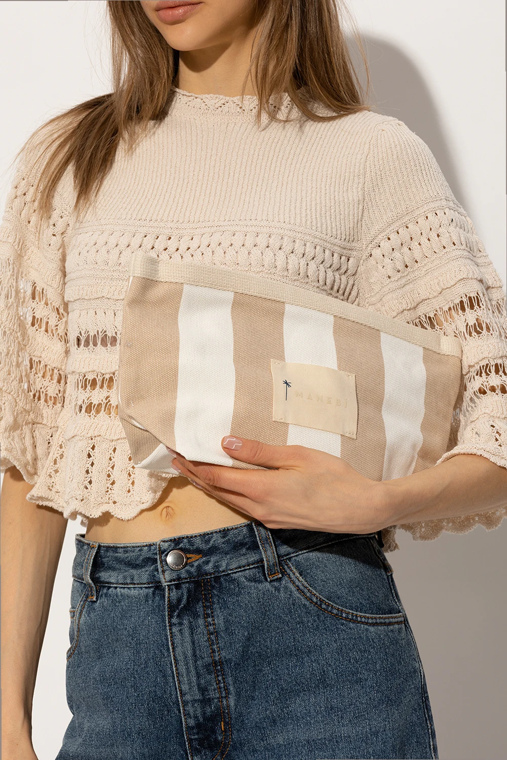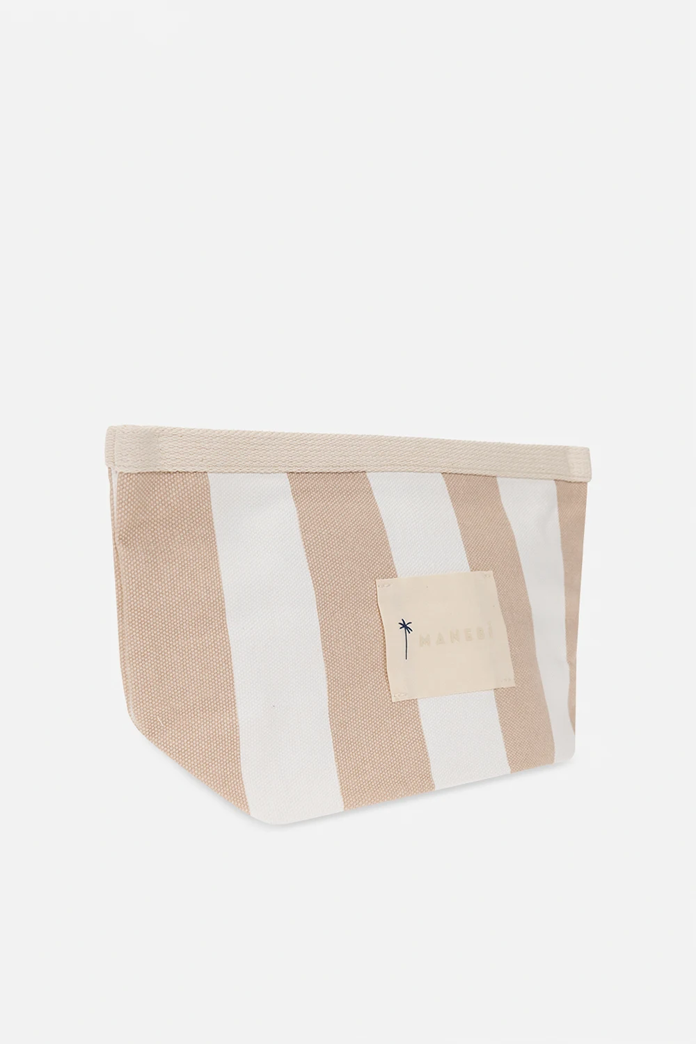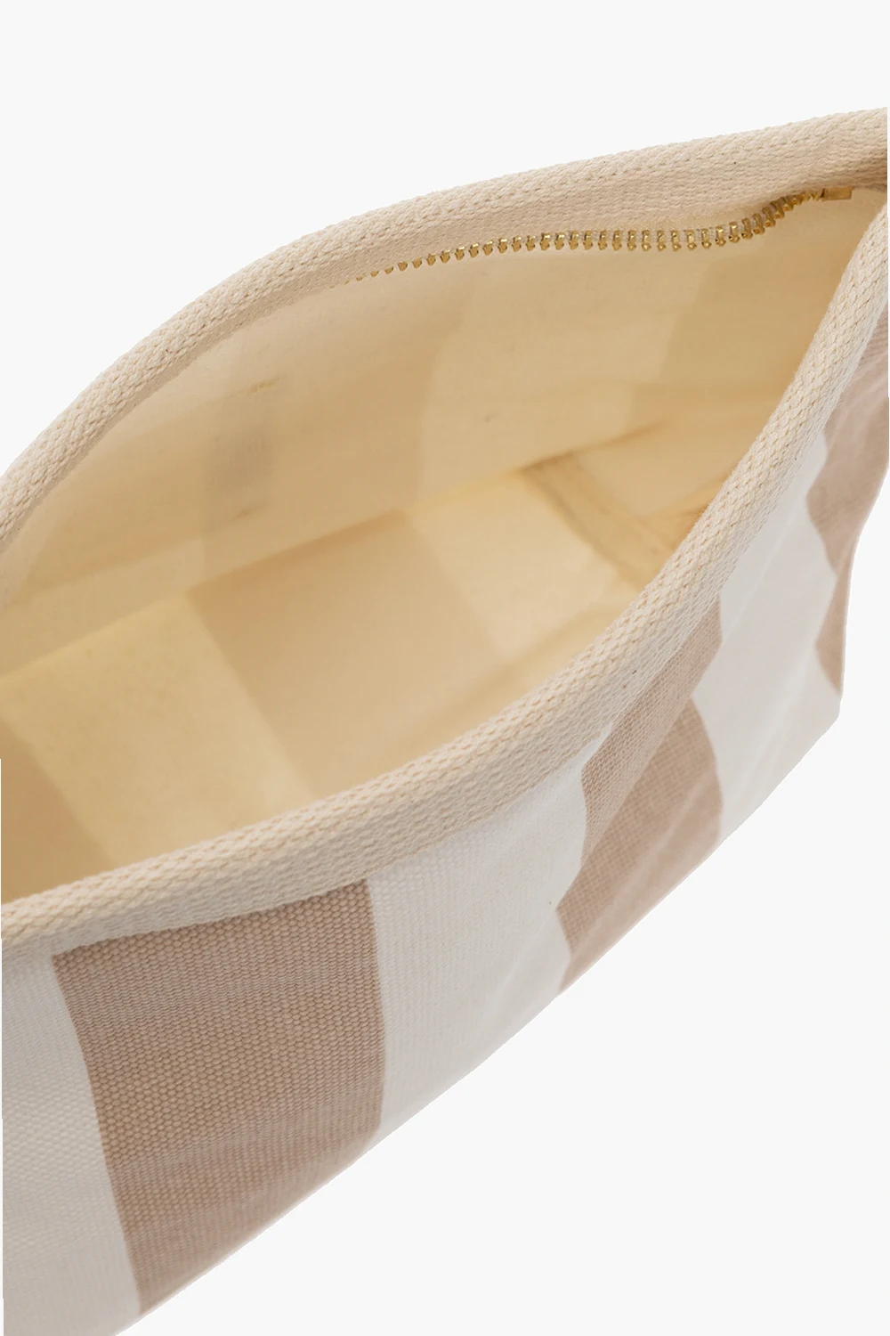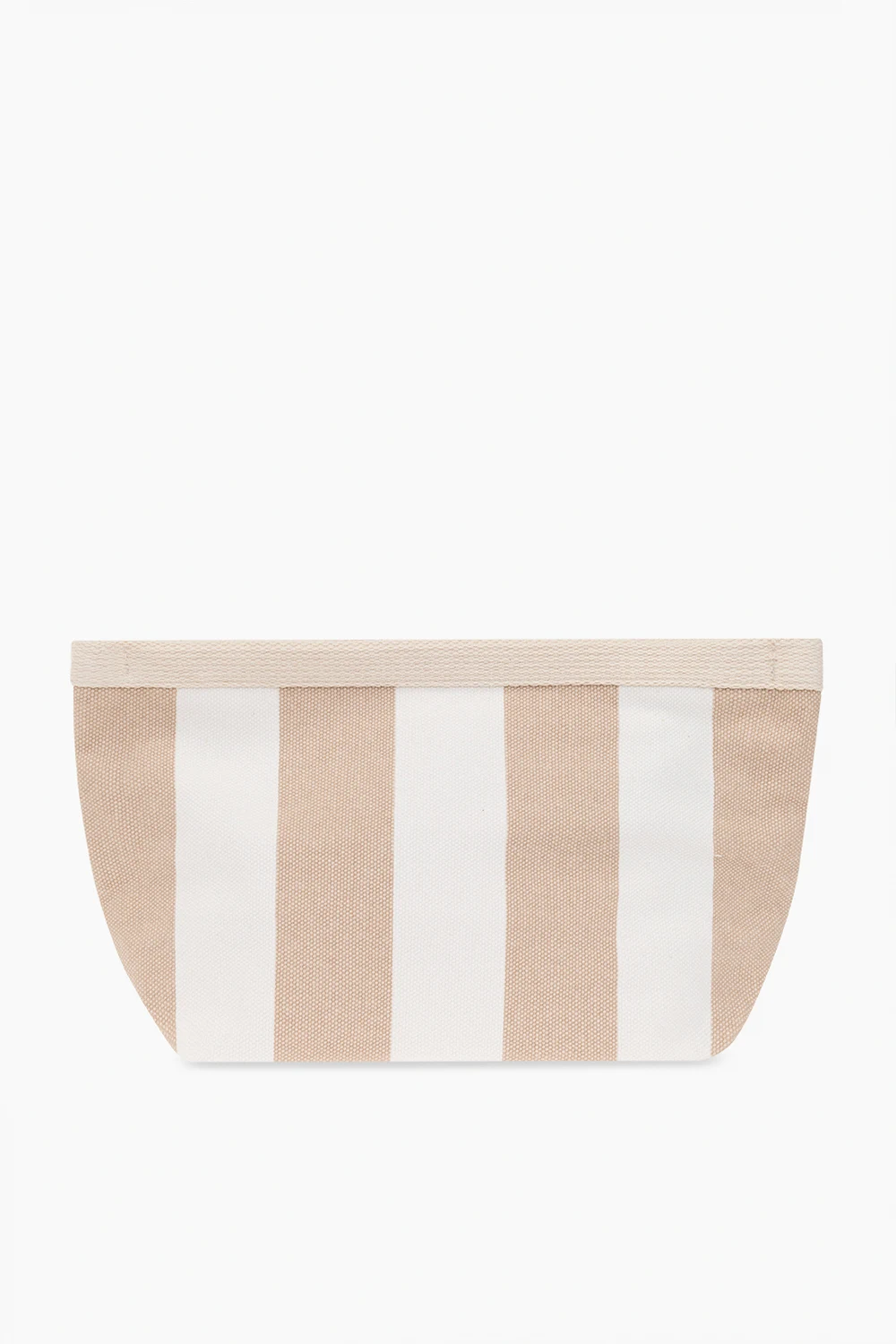 Cream and beige wash bag from Manebi. Made of cotton, this design fastens with a zipper and showcases a stripe pattern and logo patch. It is complete with gold-tone metal hardware and one internal compartment.