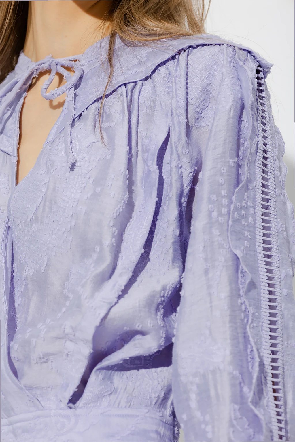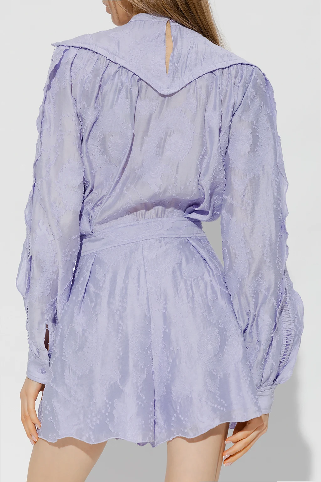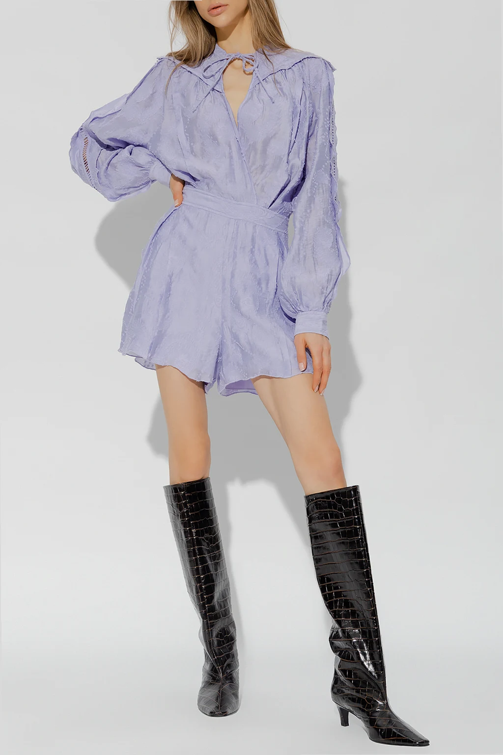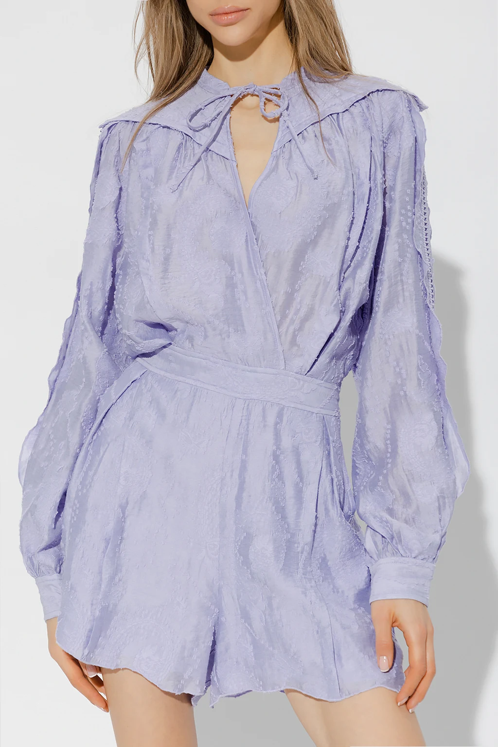 Light purple ‘Keano’ jumpsuit from Iro. Crafted in jacquard fabric, this style features a wrap neckline, a back button closure, openwork inserts on the shoulders a hidden side zipper, two slip pockets, a drawstring front and blouson sleeves with ruffle trims and button cuffs.