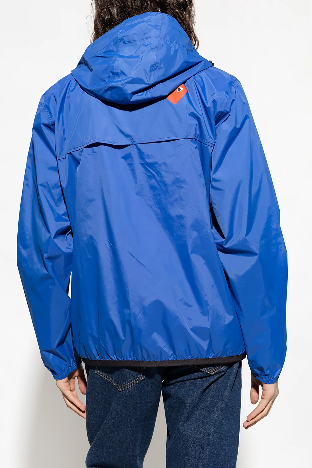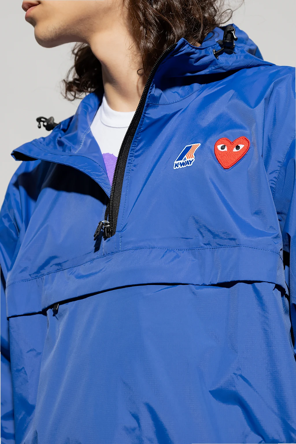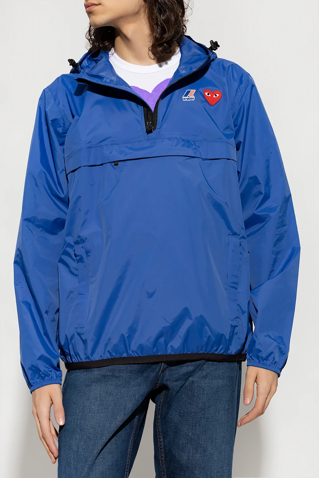 Dark blue rain jacket from Comme Des Garcons Play x K-Way. Printed with the brand\'s logo, this style features a half-zip fastening, a drawcord-adjustable hood and hem, a patch, three zip pockets on the front and long sleeves with elasticated cuffs.