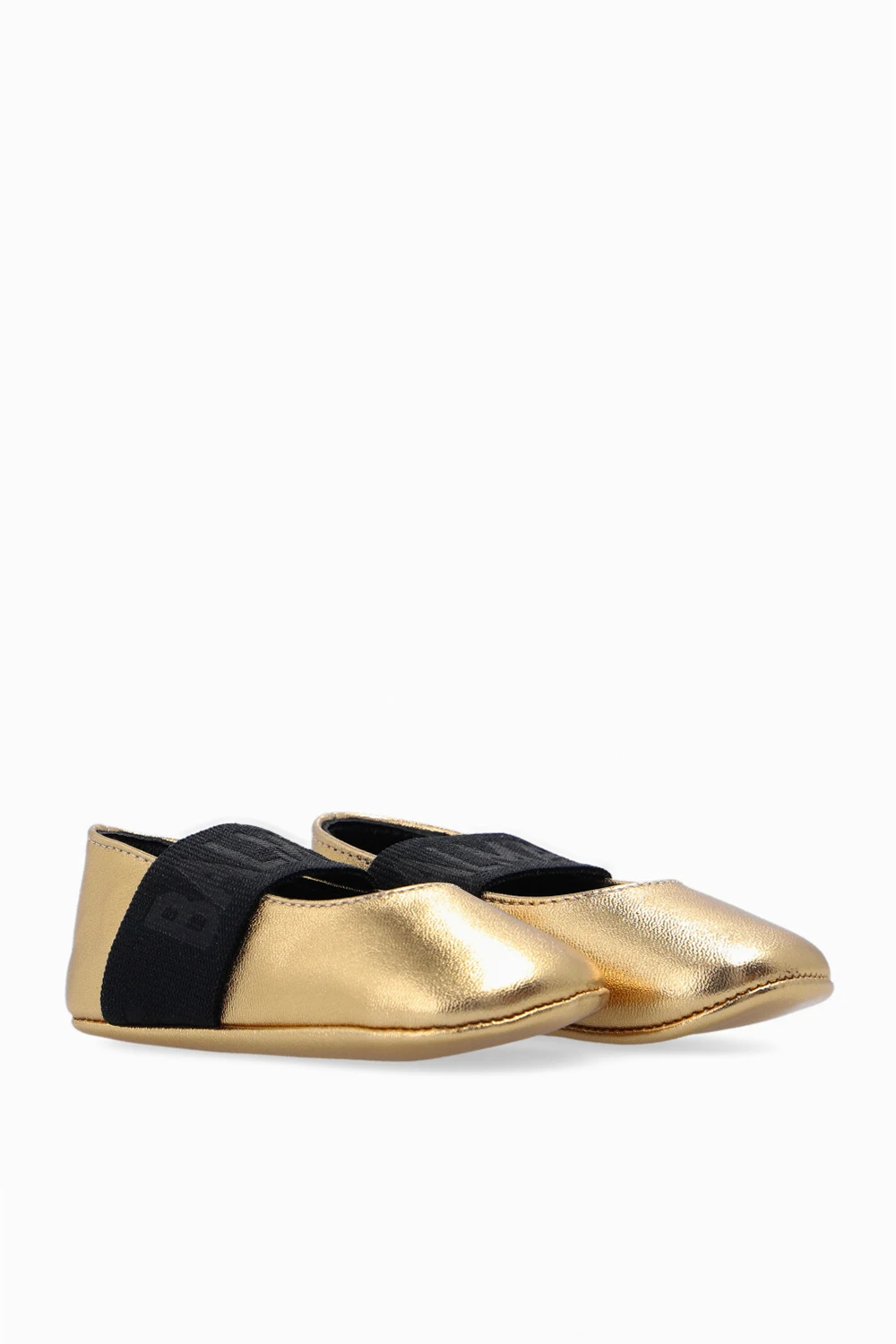 Gold-tone shoes from Balmain Kids. Made of leather, this pair features an elastic strap in black with a logo and rests on a silver-tone leather sole.