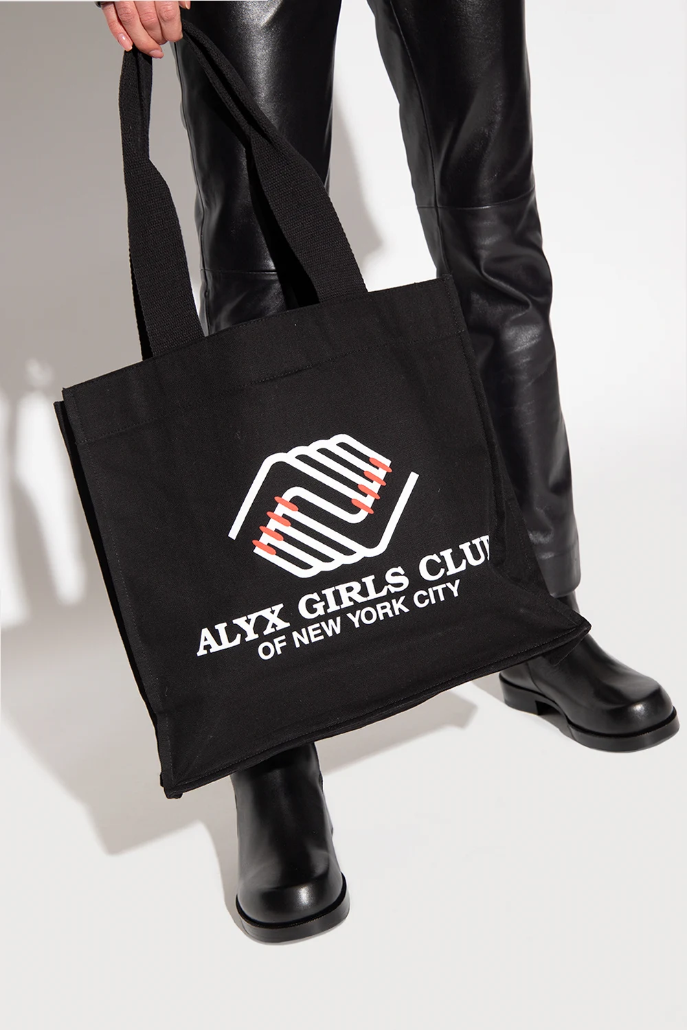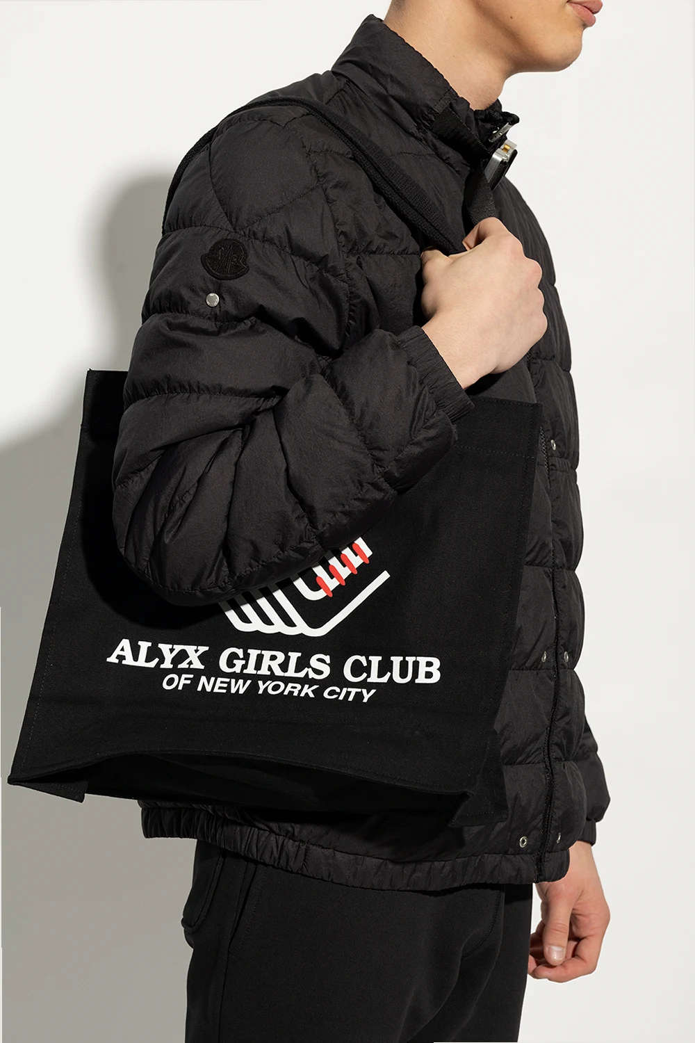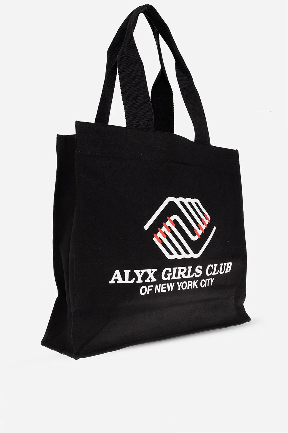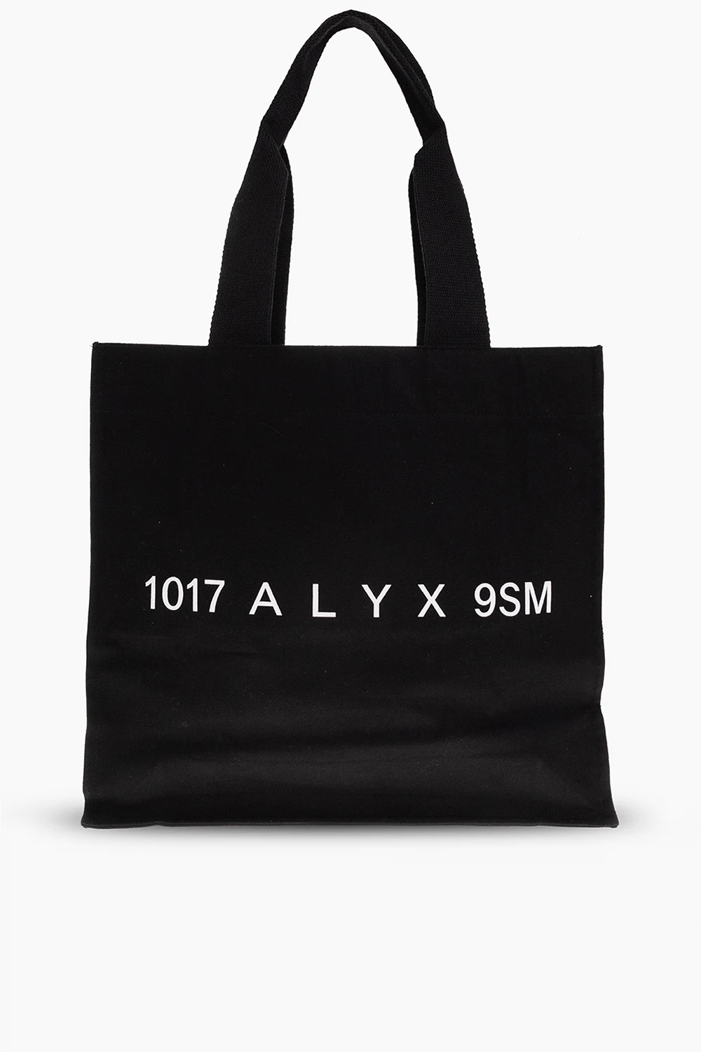 Black shopper bag from 1017 ALYX 9SM. Made of cotton, this model features a white and red logo print, two half-round handles and one internal compartment.