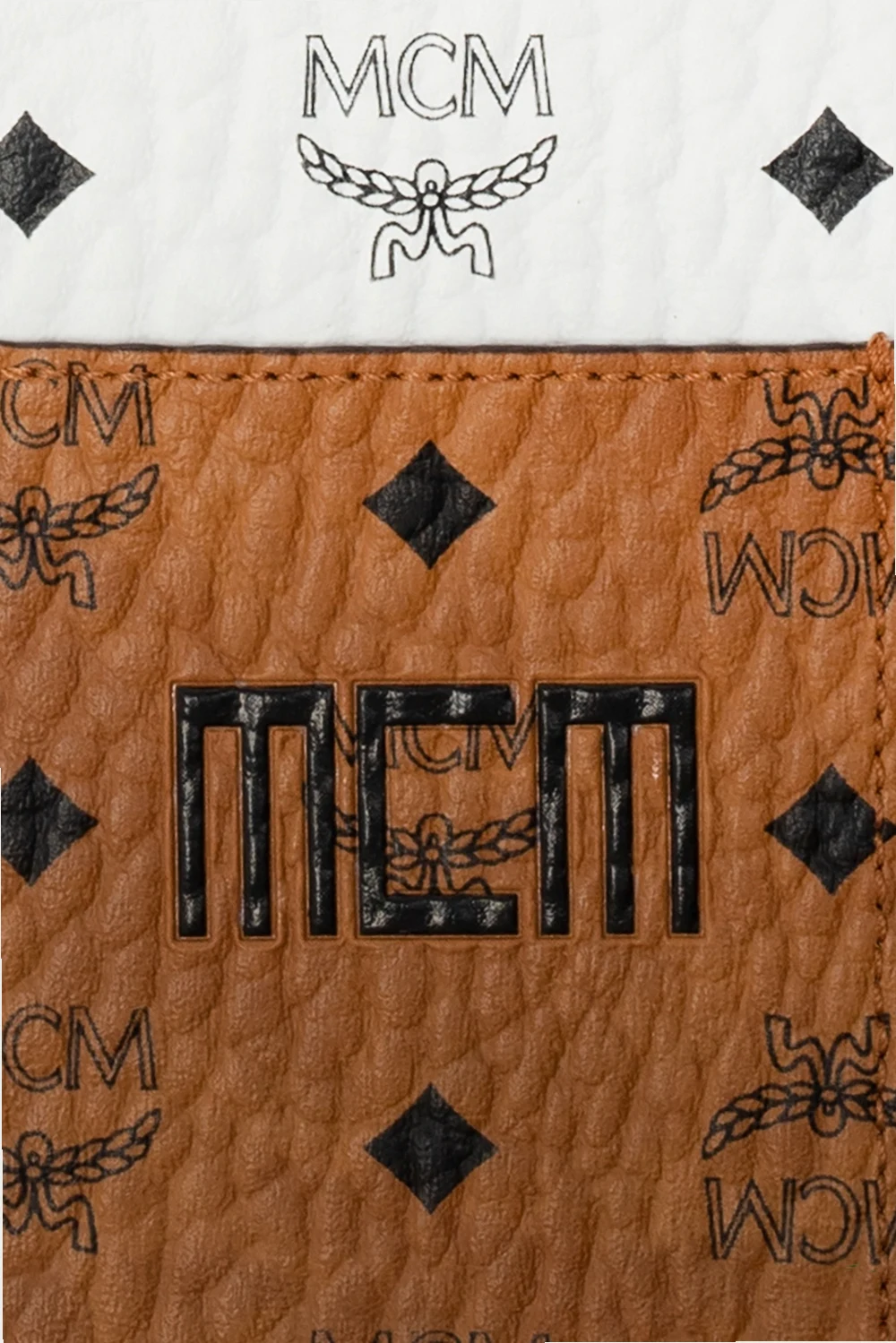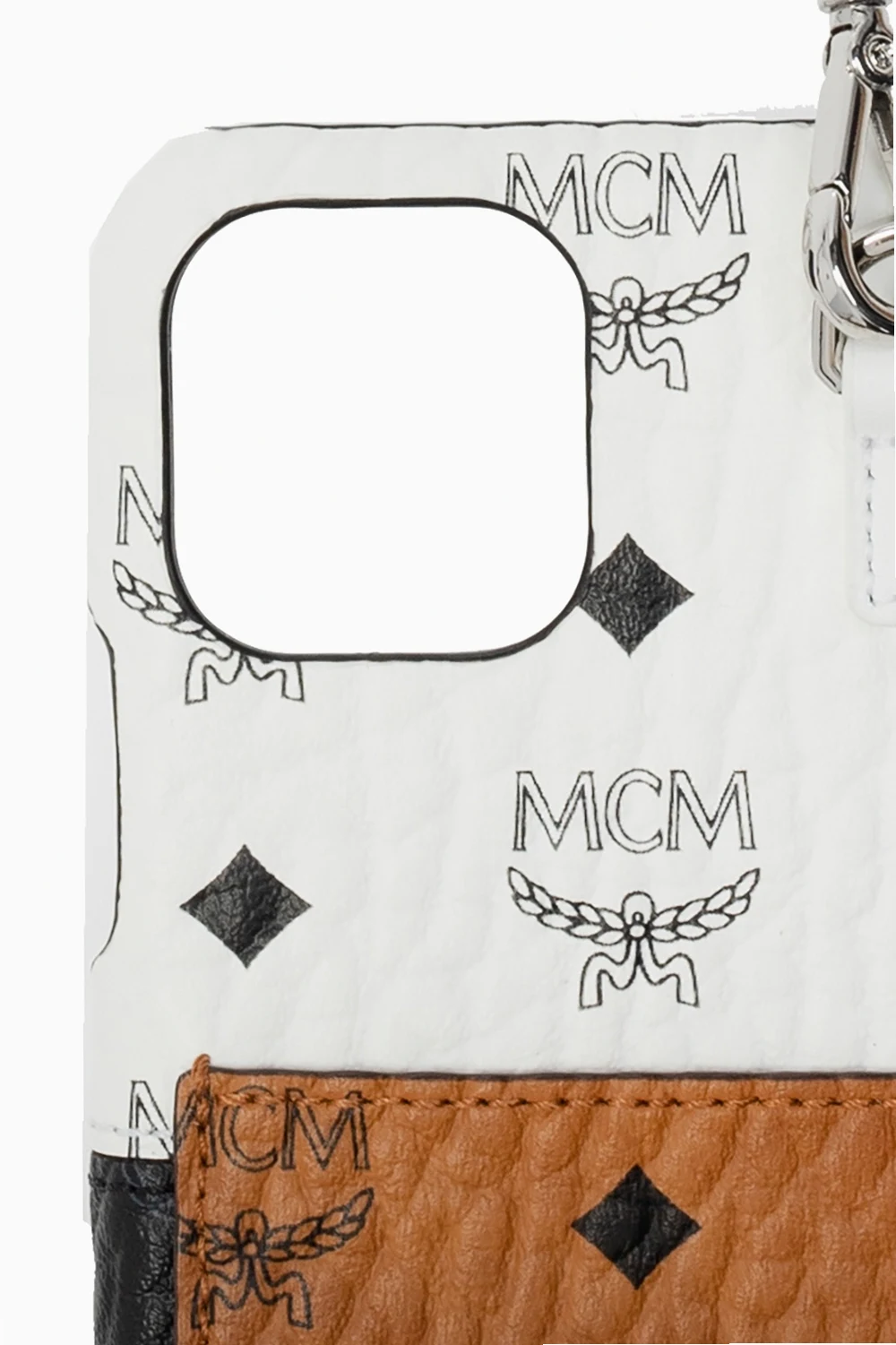 White, black and brown iPhone 11 Pro case from MCM. Crafted from the brand’s signature canvas, this design features a black logo pattern, card slot with a logo and a removable strap.
