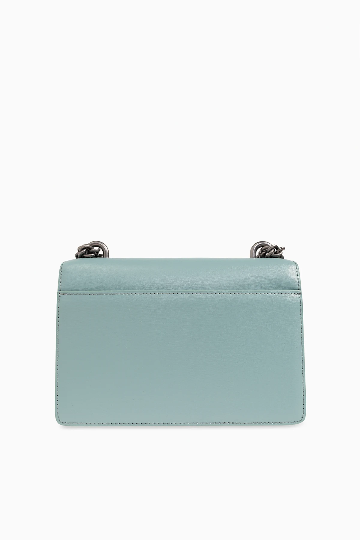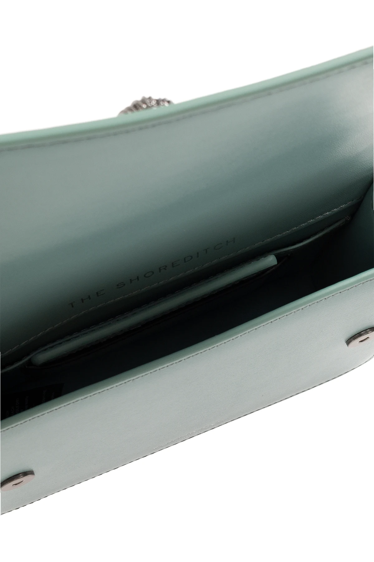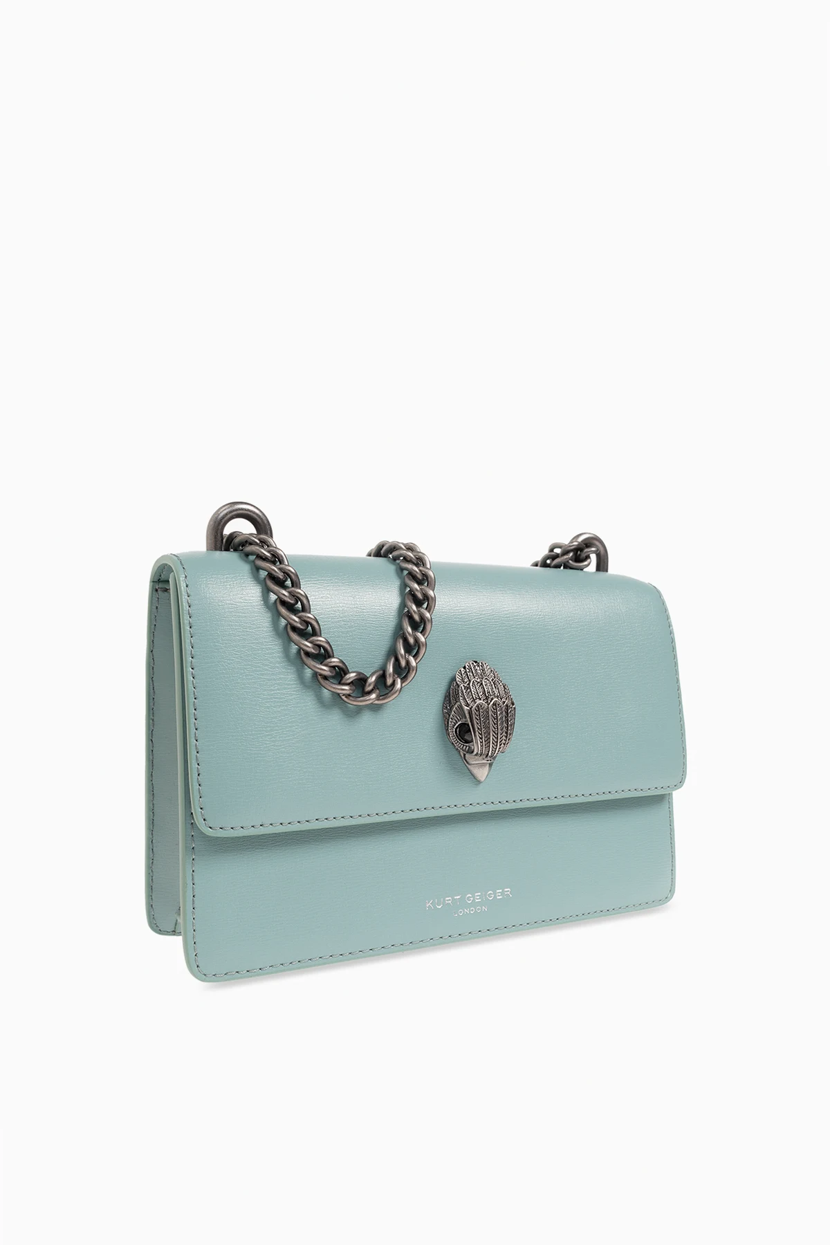 Blue ‘Shoreditch Small’ shoulder bag from Kurt Geiger. Made from leather, this design secures via magnetic snap and showcases a silver-tone logo print accompanied by crystal-bejewelled Eagle head hardware. It is complete with a chain shoulder strap, one back slip pocket, antiqued silver-tone metal elements and one internal compartment with a slip pocket.
