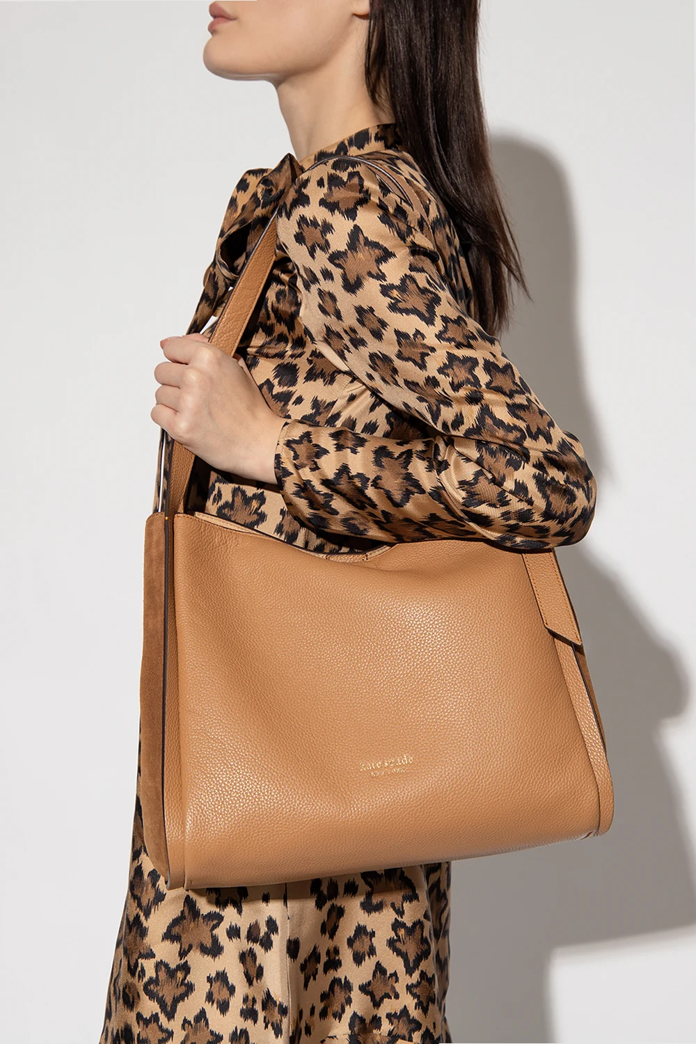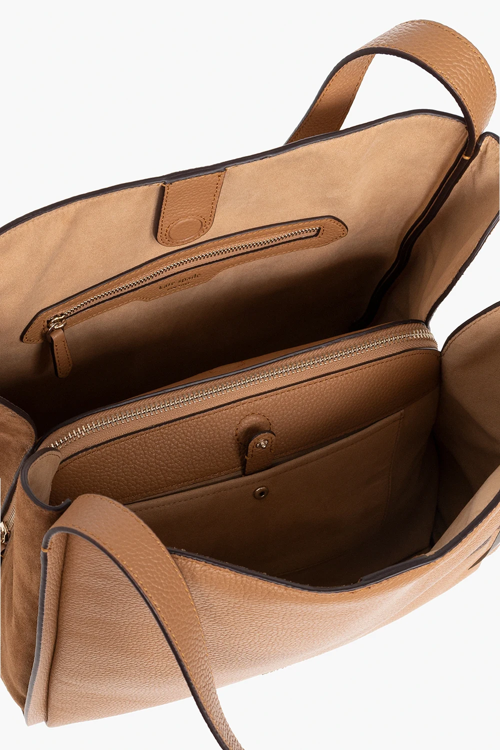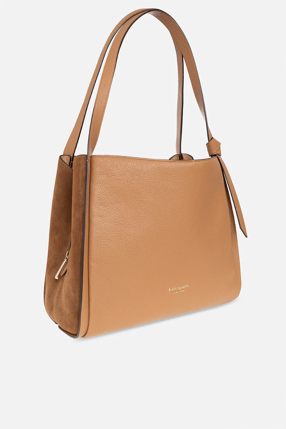 Beige and brown \'Knott\' shoulder bag from Kate Spade. Crafted from cow leather, this design secures with a magnetic fastening and features a logo application, two half-round handles, gold-tone metal hardware and two compartments, one slip pocket and one zip pocket inside.