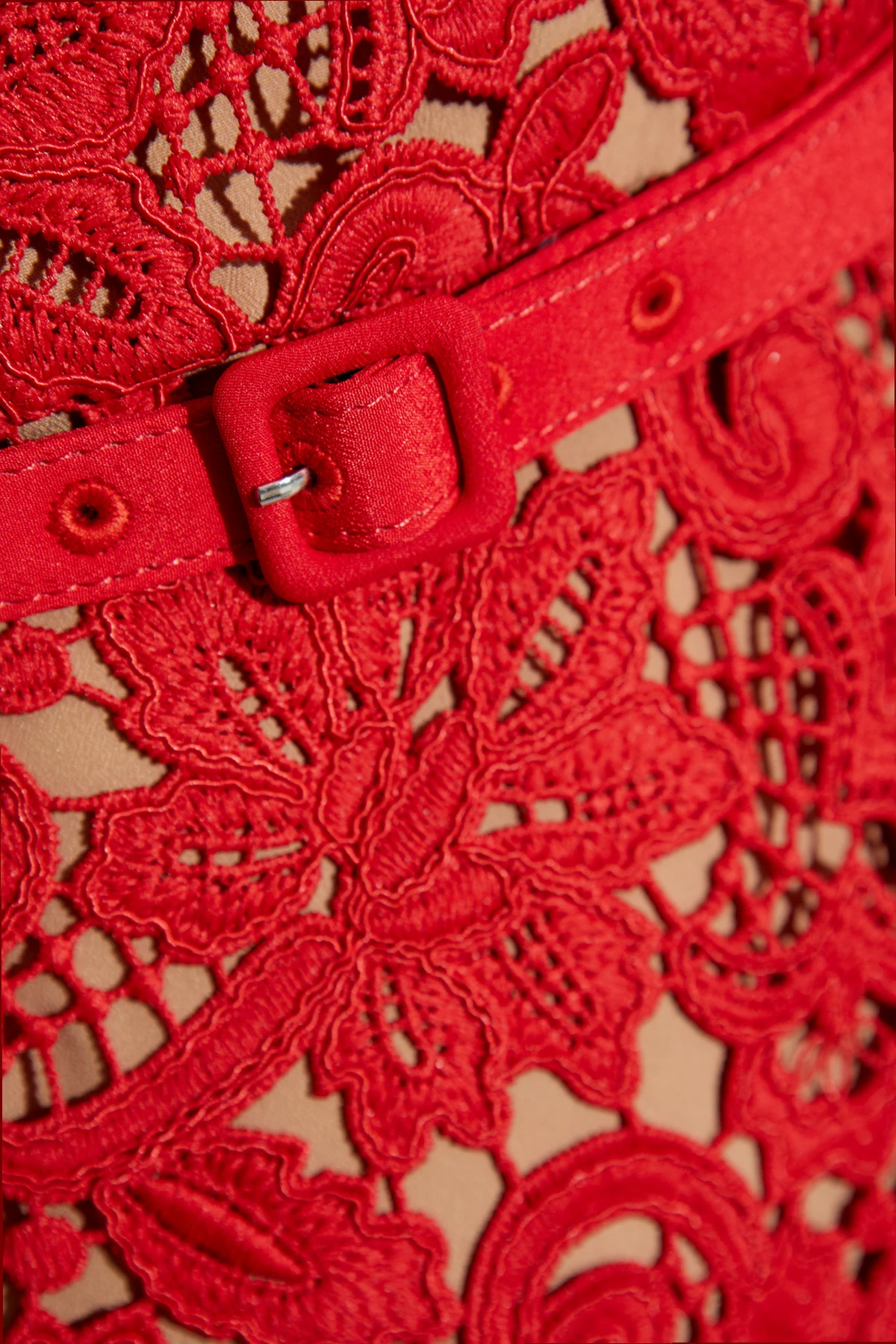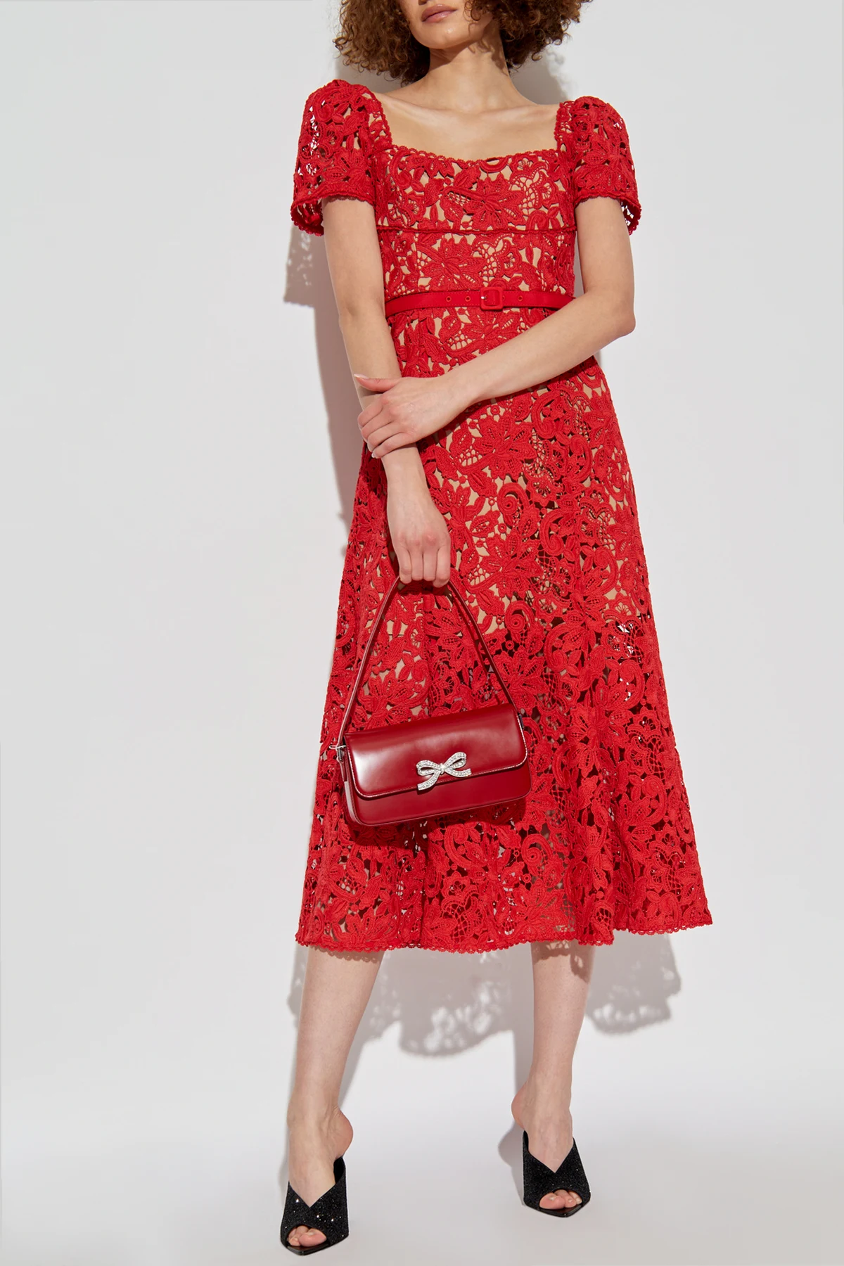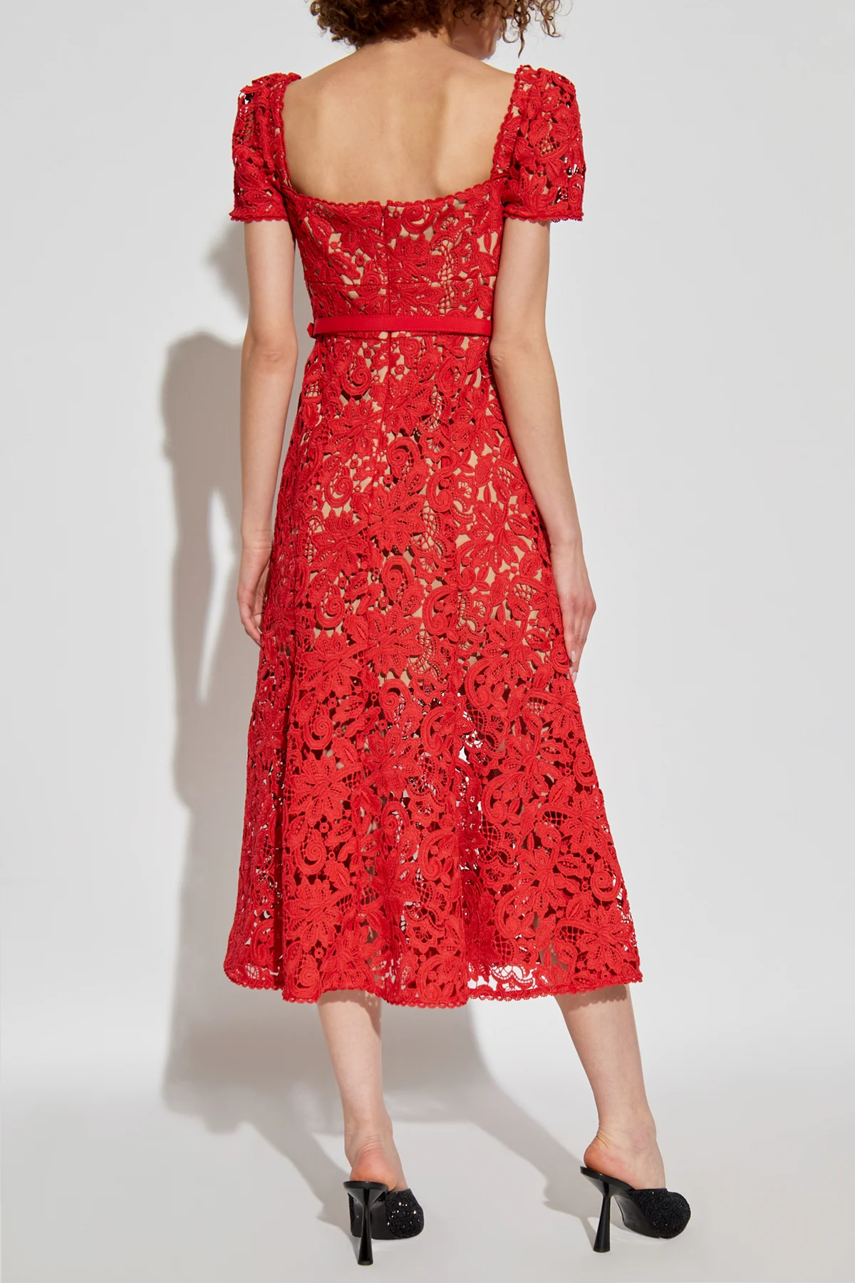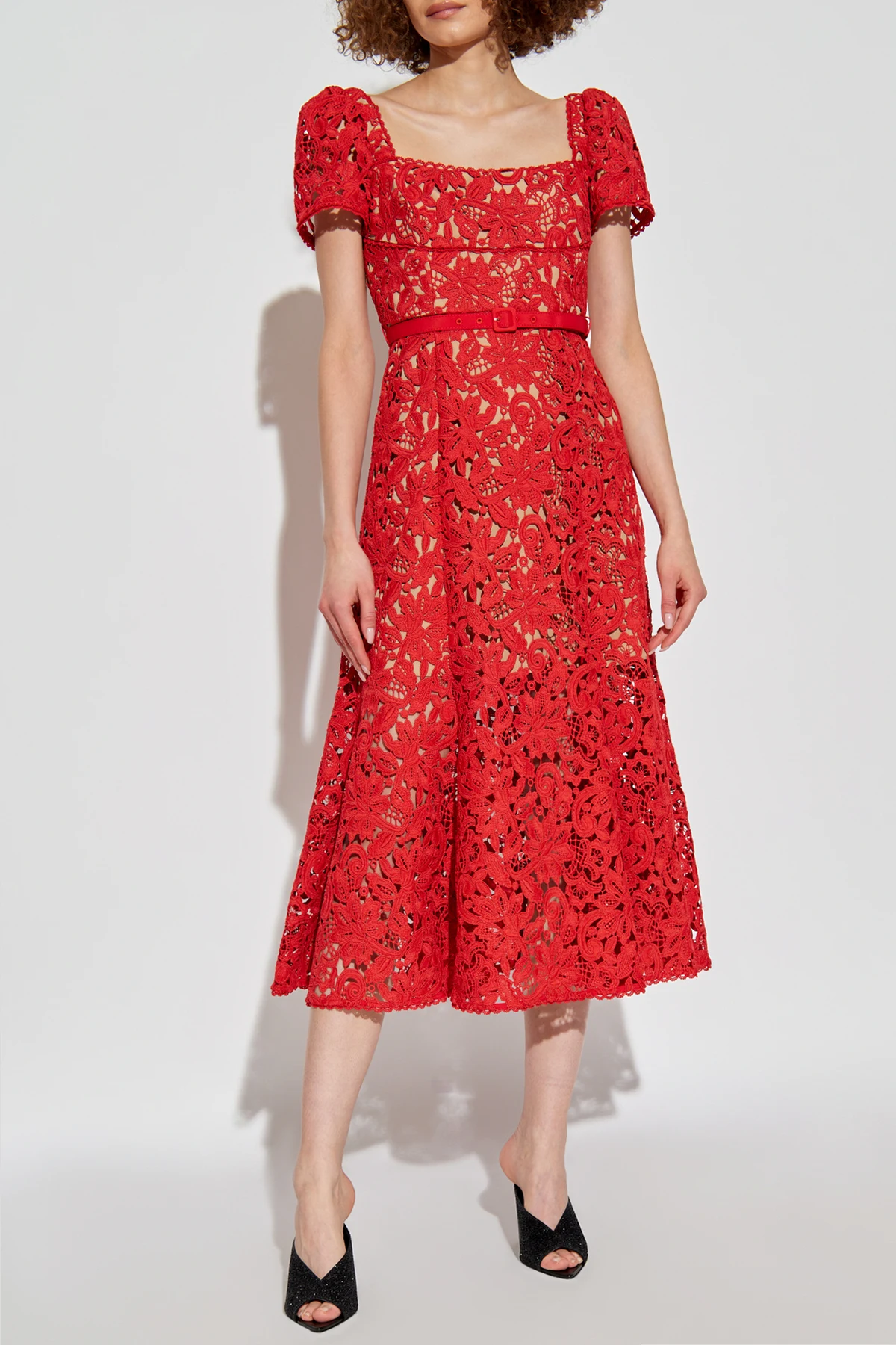 Introducing the epitome of sophistication and romantic allure: the Self Portrait Ażurowa Dress. Crafted with meticulous attention to detail, this red lace dress boasts an intricate, multi-dimensional pattern that elegantly intertwines floral and botanical motifs, rendering a texture that is both rich and visually captivating. The dress features a midi length that gracefully falls just below the knee, complemented by a fitted waist and a flared skirt that together sculpt a silhouette of timeless elegance. The round neckline and short, puff sleeves add a touch of demure charm, while the inclusion of a thin, fabric belt with a discreet buckle, fashioned from the same exquisite material, accentuates the waistline, enhancing the overall feminine allure. Drenched in a vibrant, intense red hue, this dress exudes confidence and grace. Its elegant, yet romantic style makes it a perfect choice for special occasions, where its lace detailing promises to add a subtle sensuality and class to your presence. Why Choose This Dress? Exquisite lace craftsmanship featuring detailed floral and botanical patterns for a luxurious texture. Elegant midi length with a flattering silhouette, perfect for various body types. Includes a coordinating fabric belt with a discreet buckle for a cinched waist effect. Striking intense red color that captivates attention and makes a bold statement. Secured with a hidden zipper and hook for a seamless and sophisticated look.