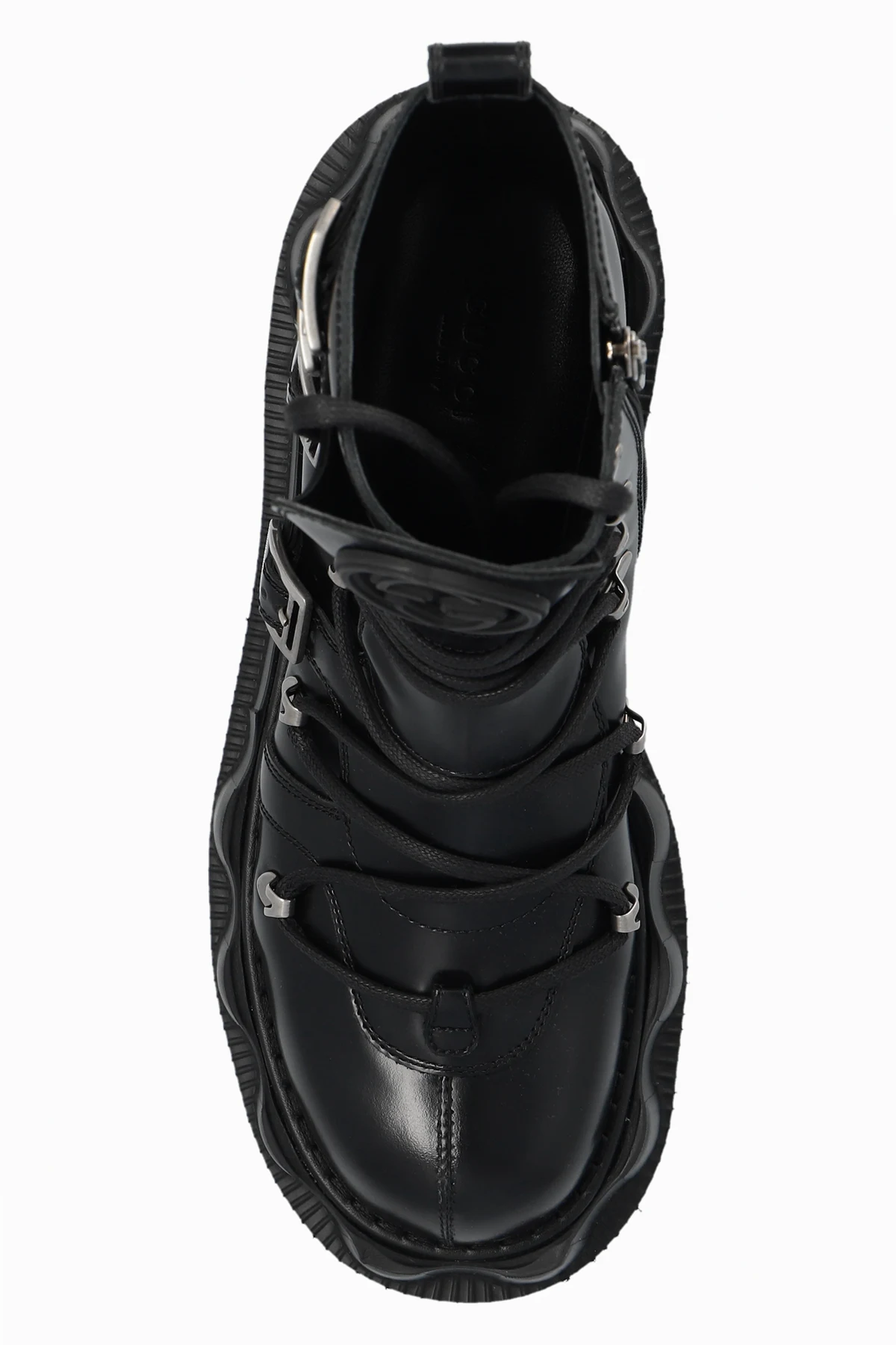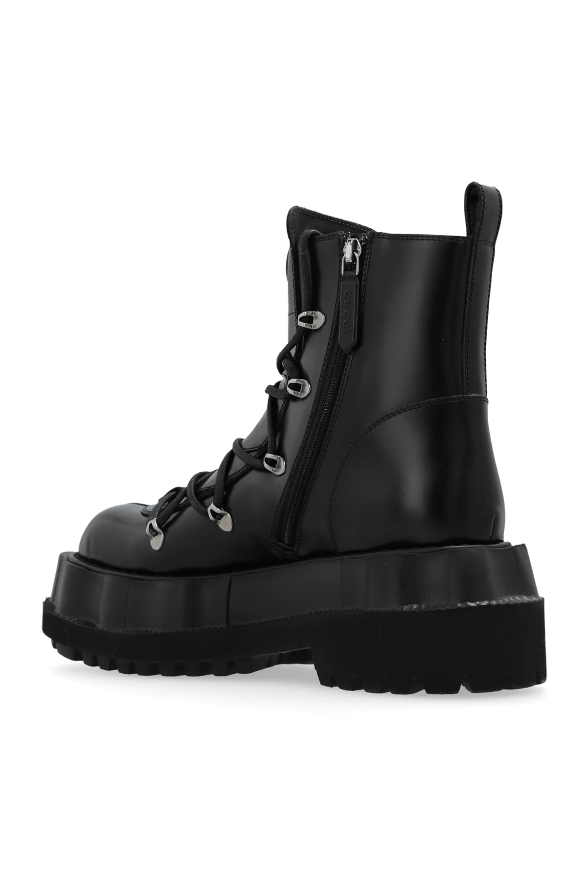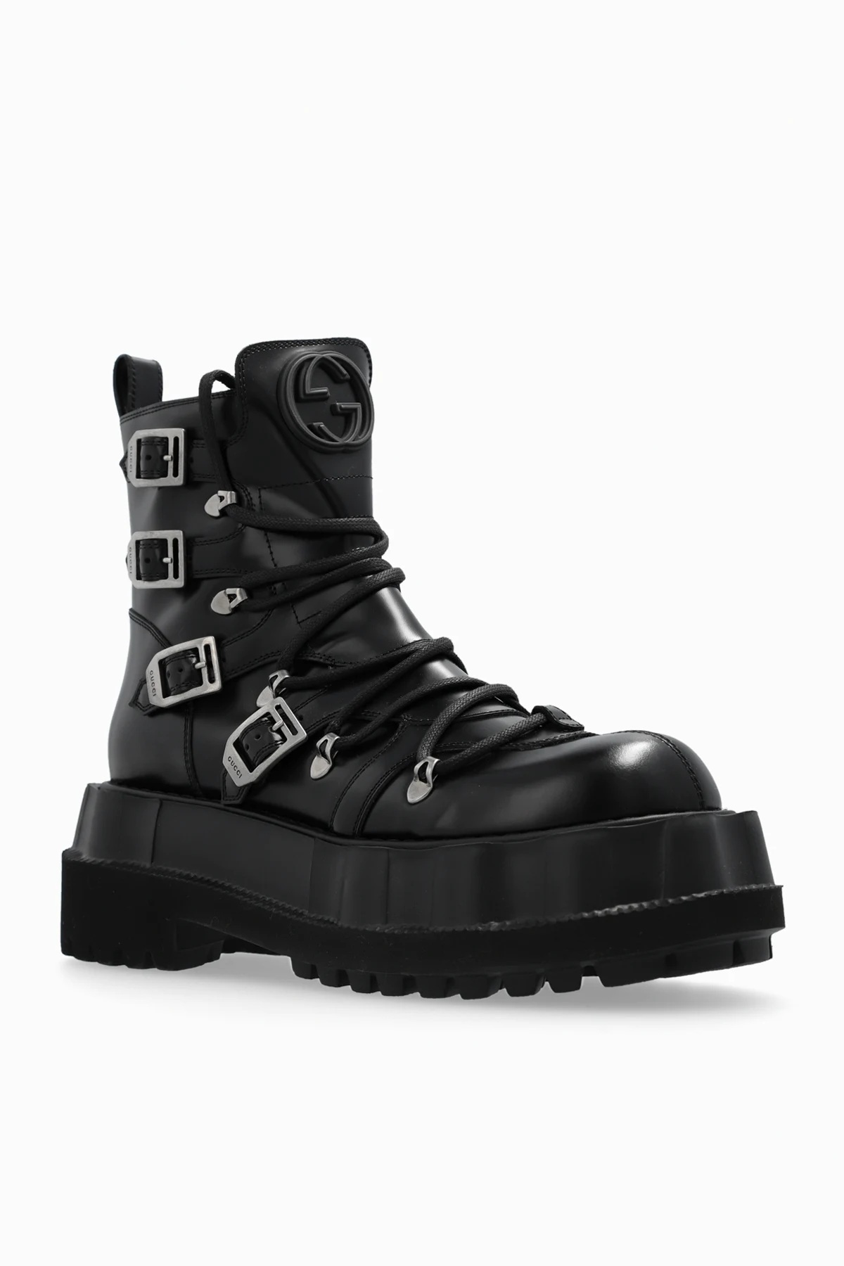 Black platform boots from Gucci. Fastened with a shoelaces and adjustable buckle straps, this pair features a zip fastening, rubber logo detail on the tongue and a black rubber sole.