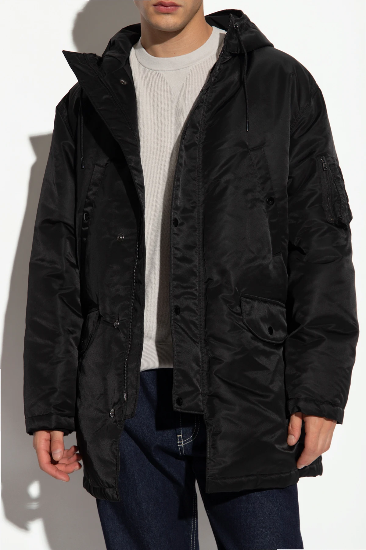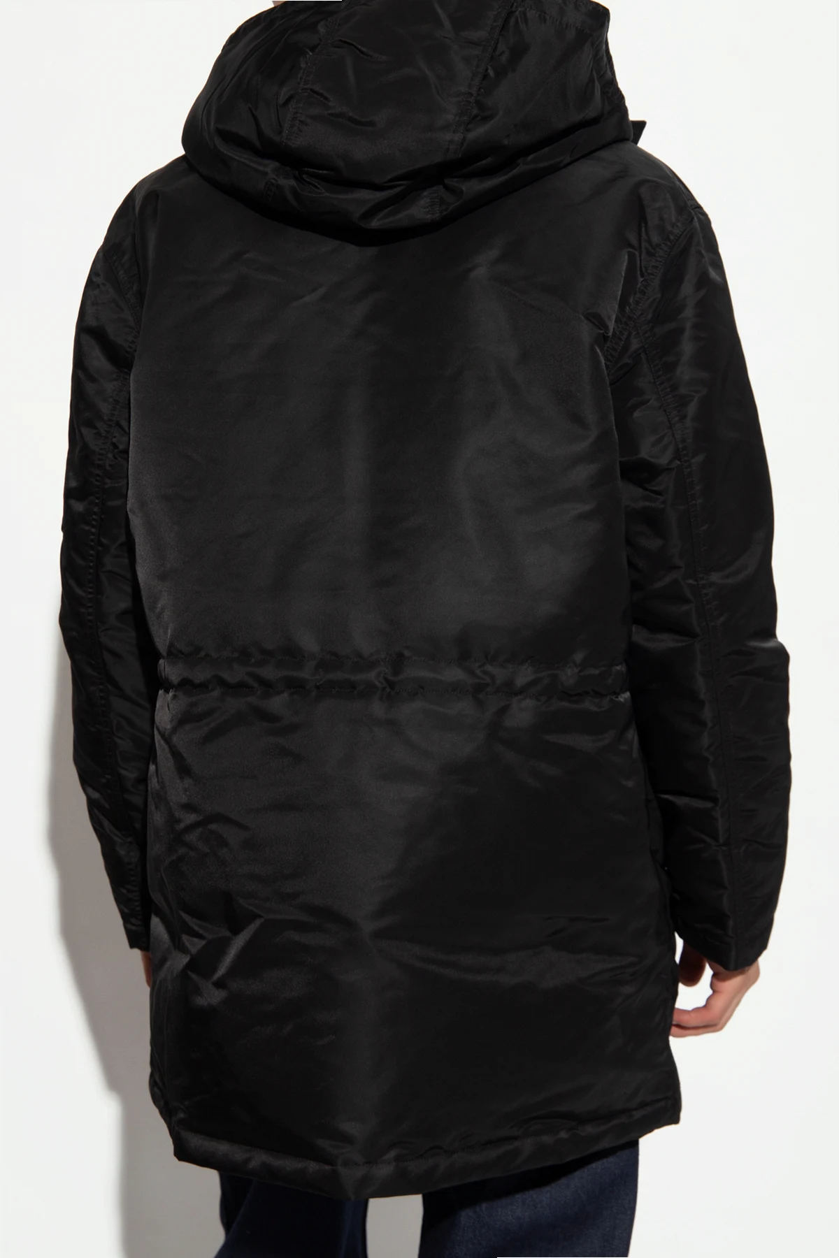 Black jacket from Theory. Fastened with a two-way zip and snaps, this style features a drawcord-adjustable hood, two snap-fastened pockets and two flapped pockets with snaps on the front, and long sleeves with elasticized cuffs.