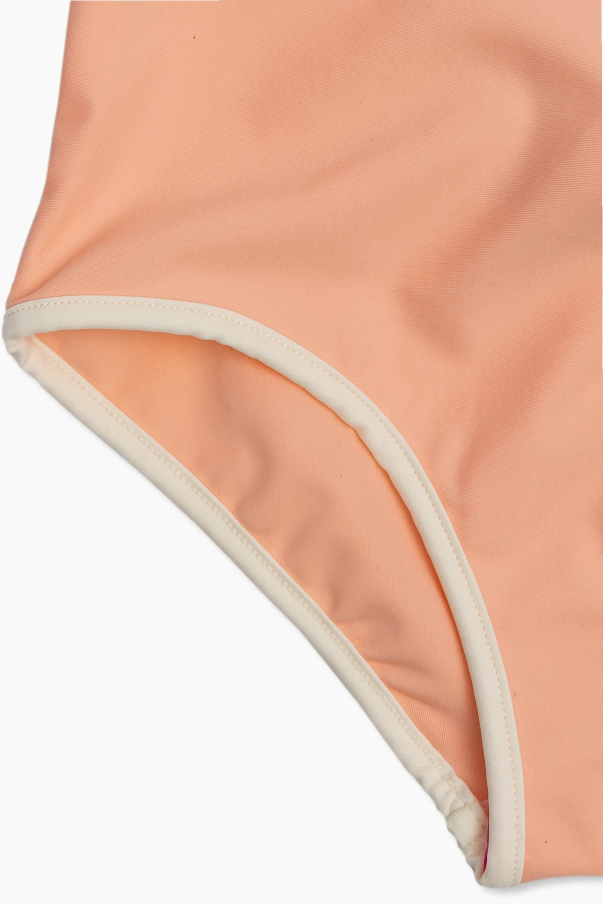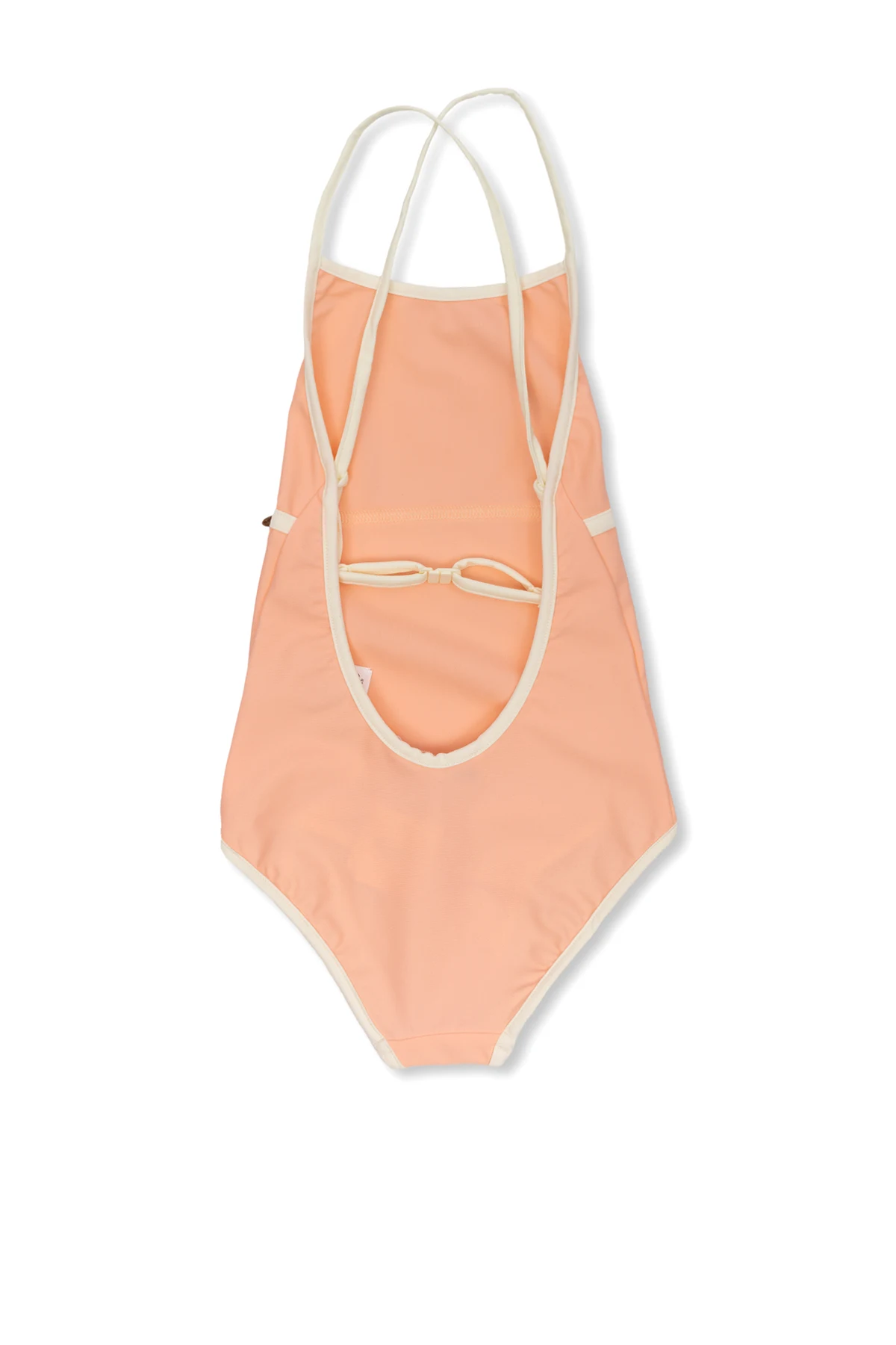 Pink ‘Altamura’ one-piece swimsuit from Bonpoint. Embellished with a pearly logo pendant on the front, this style features an open back with a snap belt and adjustable shoulder straps.