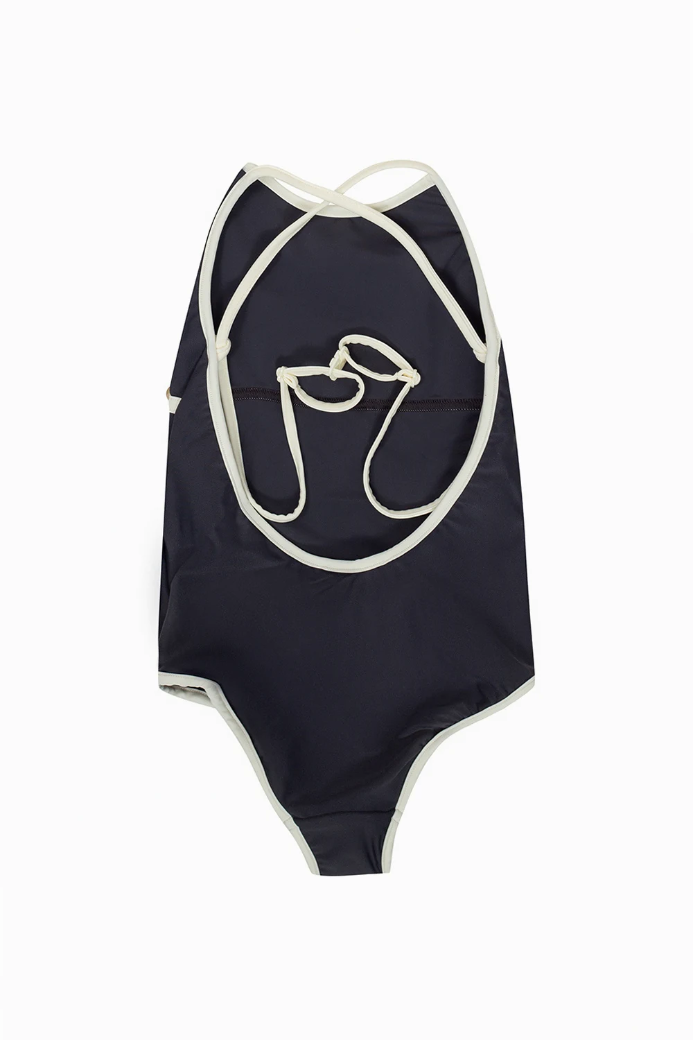 Grey and white one-piece swimsuit from Bonpoint. Crafted from a stretch knit, this style features adjustable shoulder straps and a cut-out back.