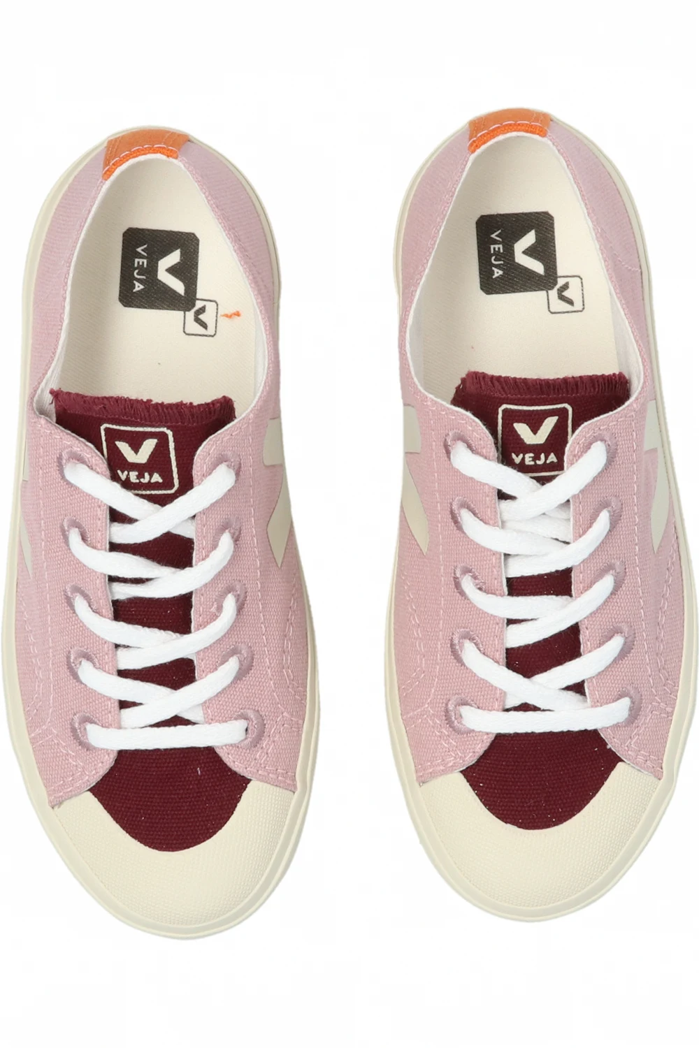 Pink and cream ‘Small Flip’ sneakers from Veja Kids. Crafted from cotton, this lace-up model features a cream logo print, purple and orange inserts and a cream rubber sole made of organic and recycled materials.