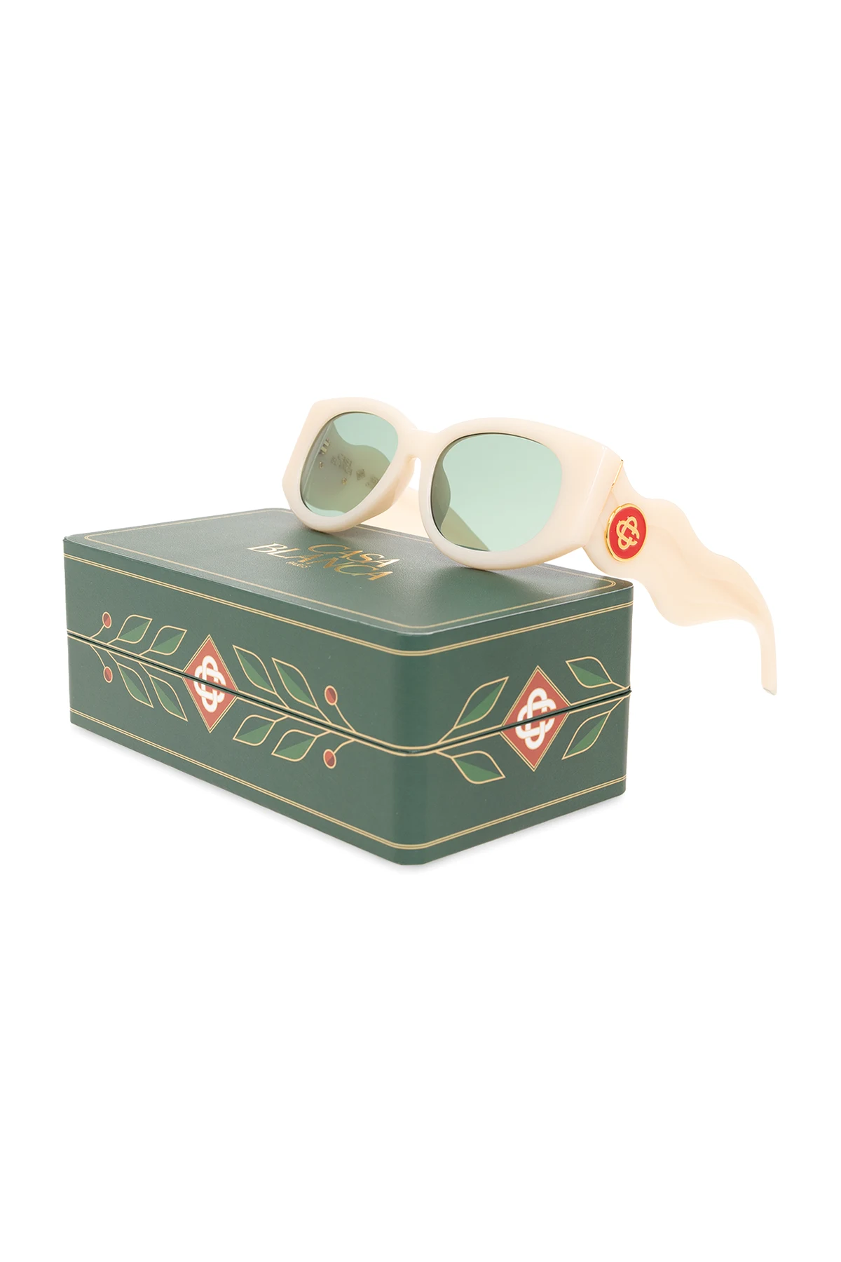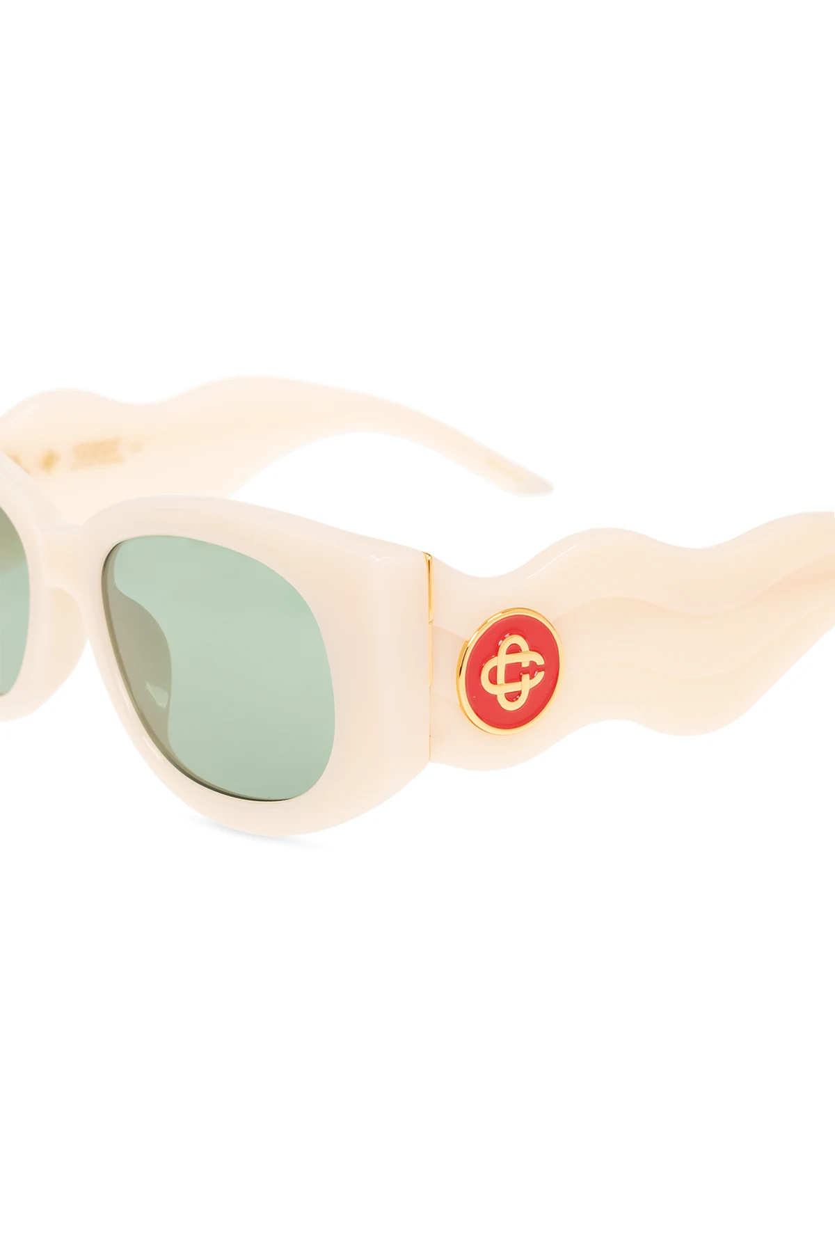 Cream ‘The Memphis’ sunglasses from Casablanca. This pair features a rectangular frame, logo at the temples, gold-tone metal hardware and green lenses with 100% UV protection. Case included.