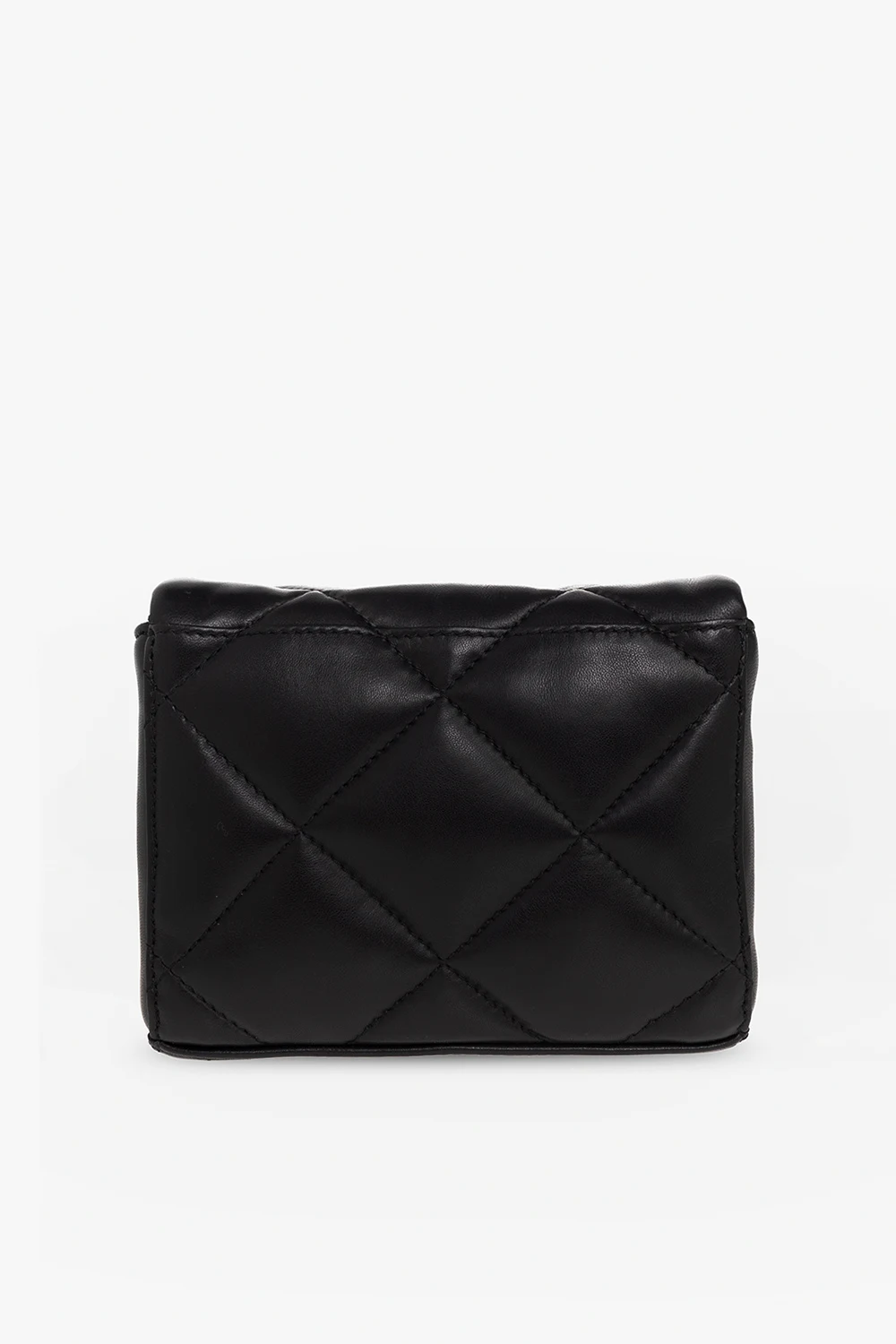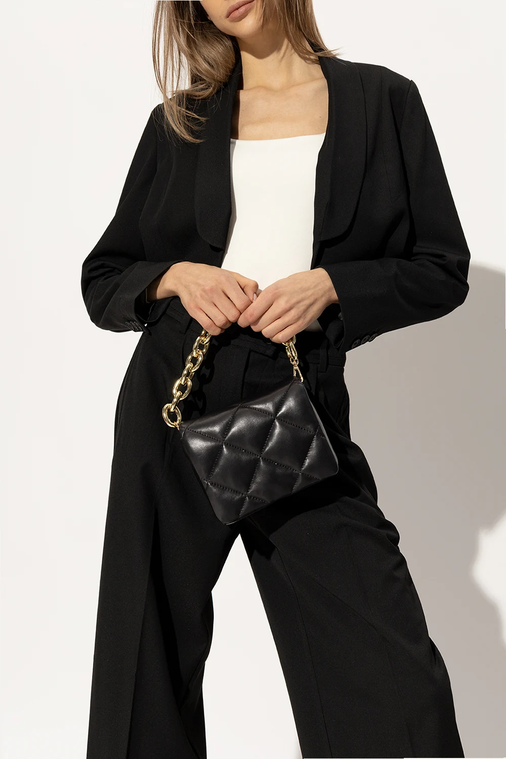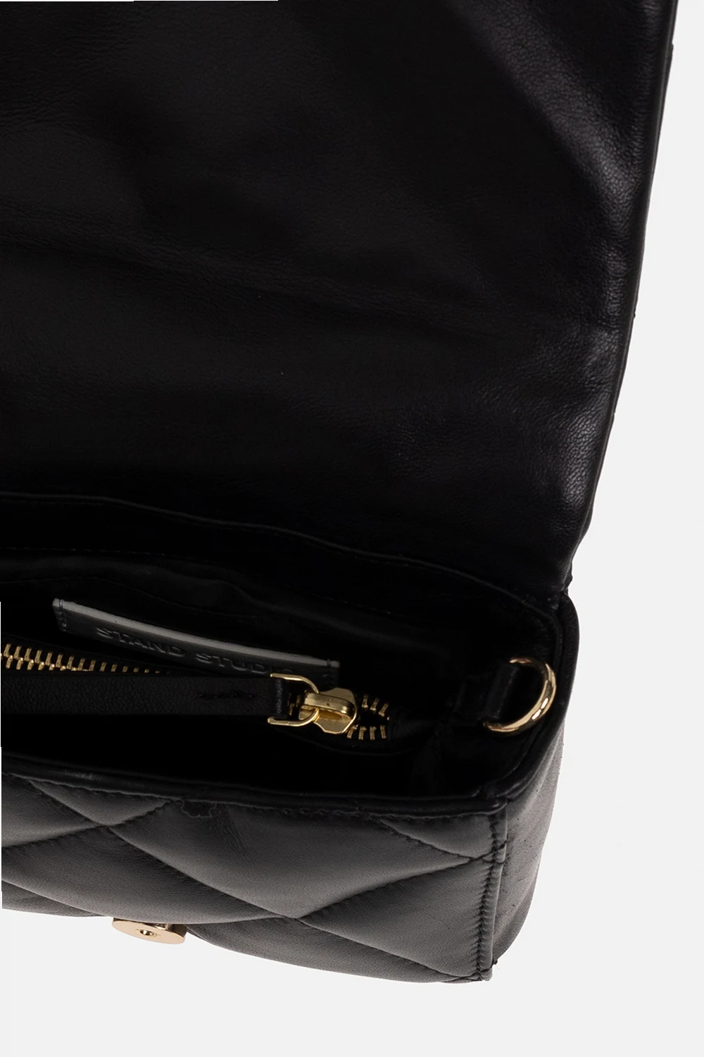 Black ‘Hestia’ quilted shoulder bag from Stand Studio. Made of lamb leather, this model secures with a magnetic snap and is complete with a half-round chain handle, detachable, adjustable strap, gold-tone metal hardware and two separate internal compartments with one zip pocket.