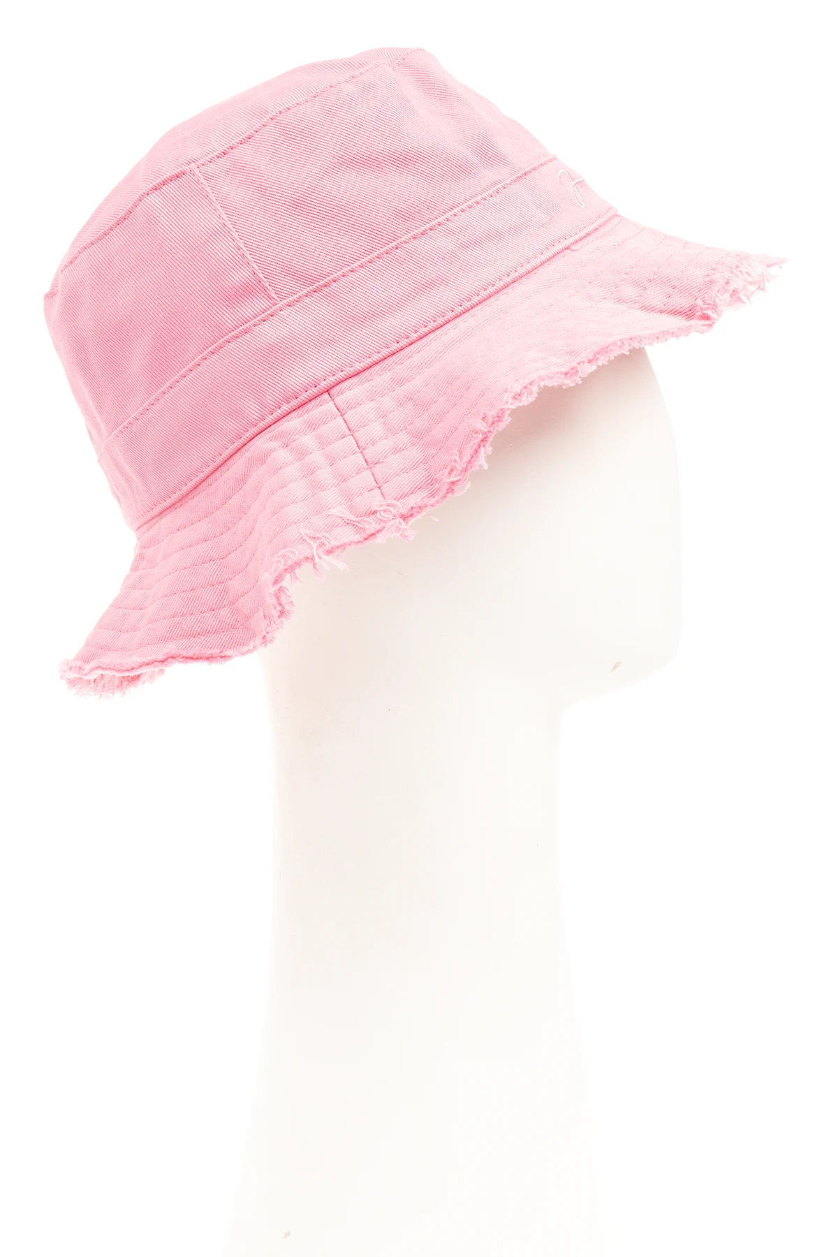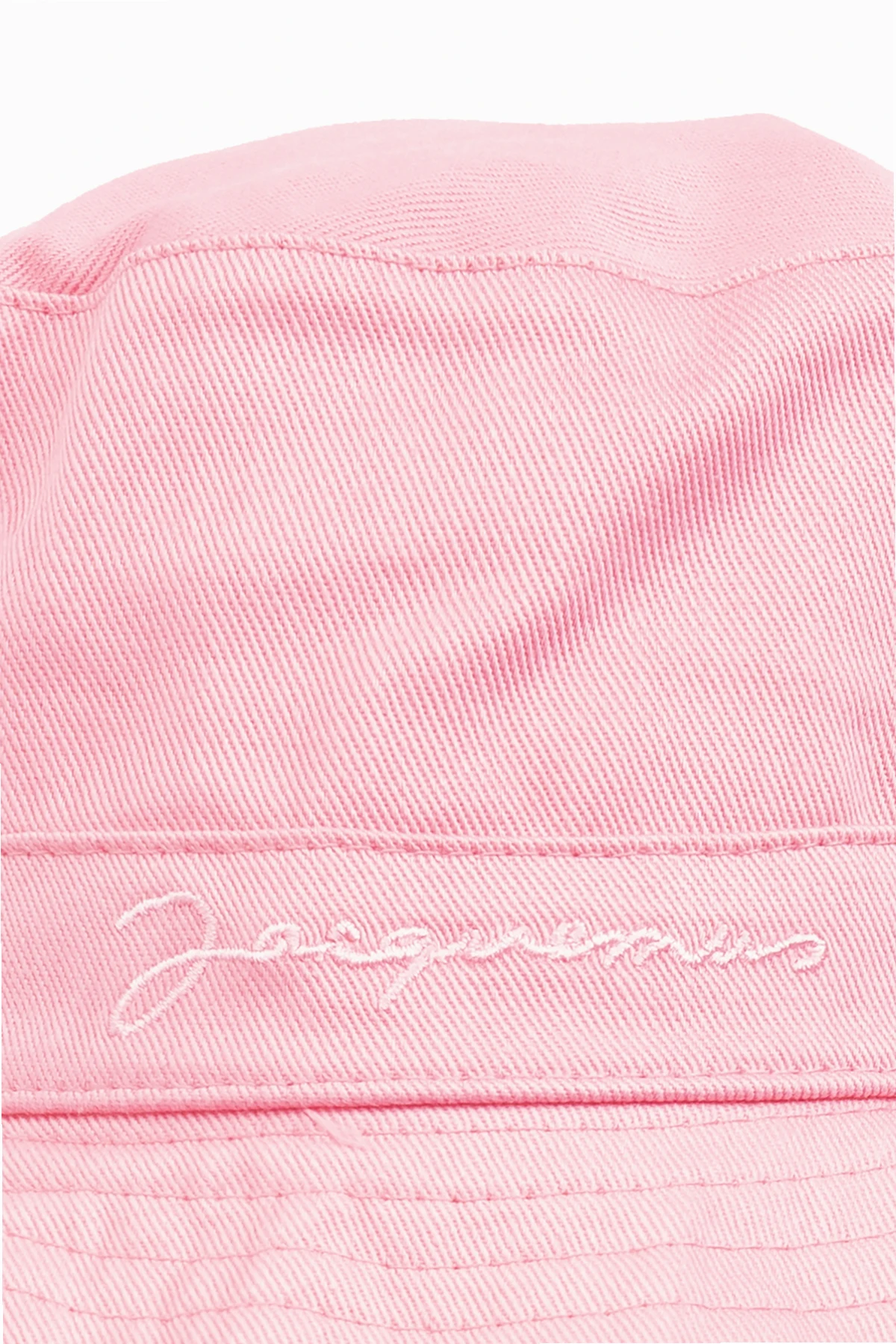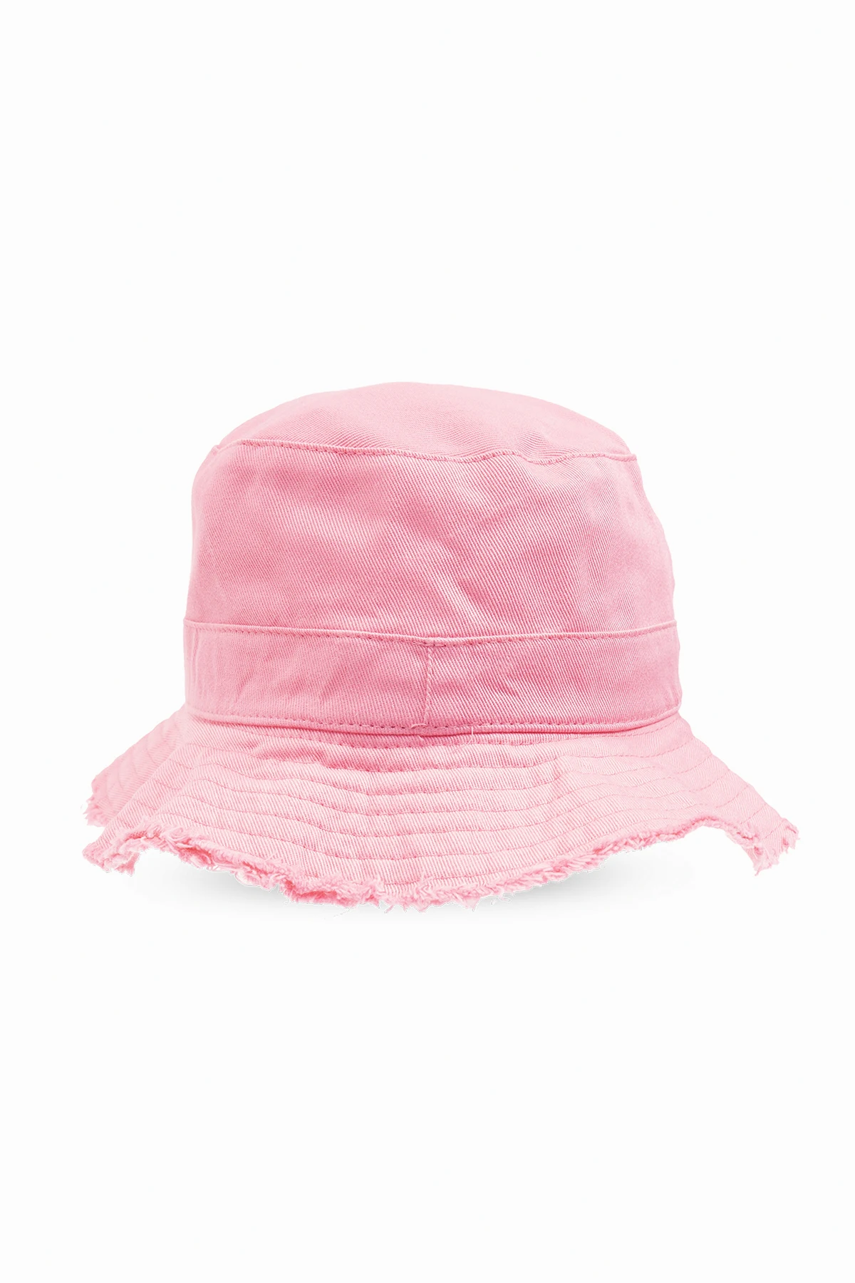 Pink bucket hat from Jacquemus Kids. Made of cotton, this item showcases frayed edges and an embroidered pink logo on the front.