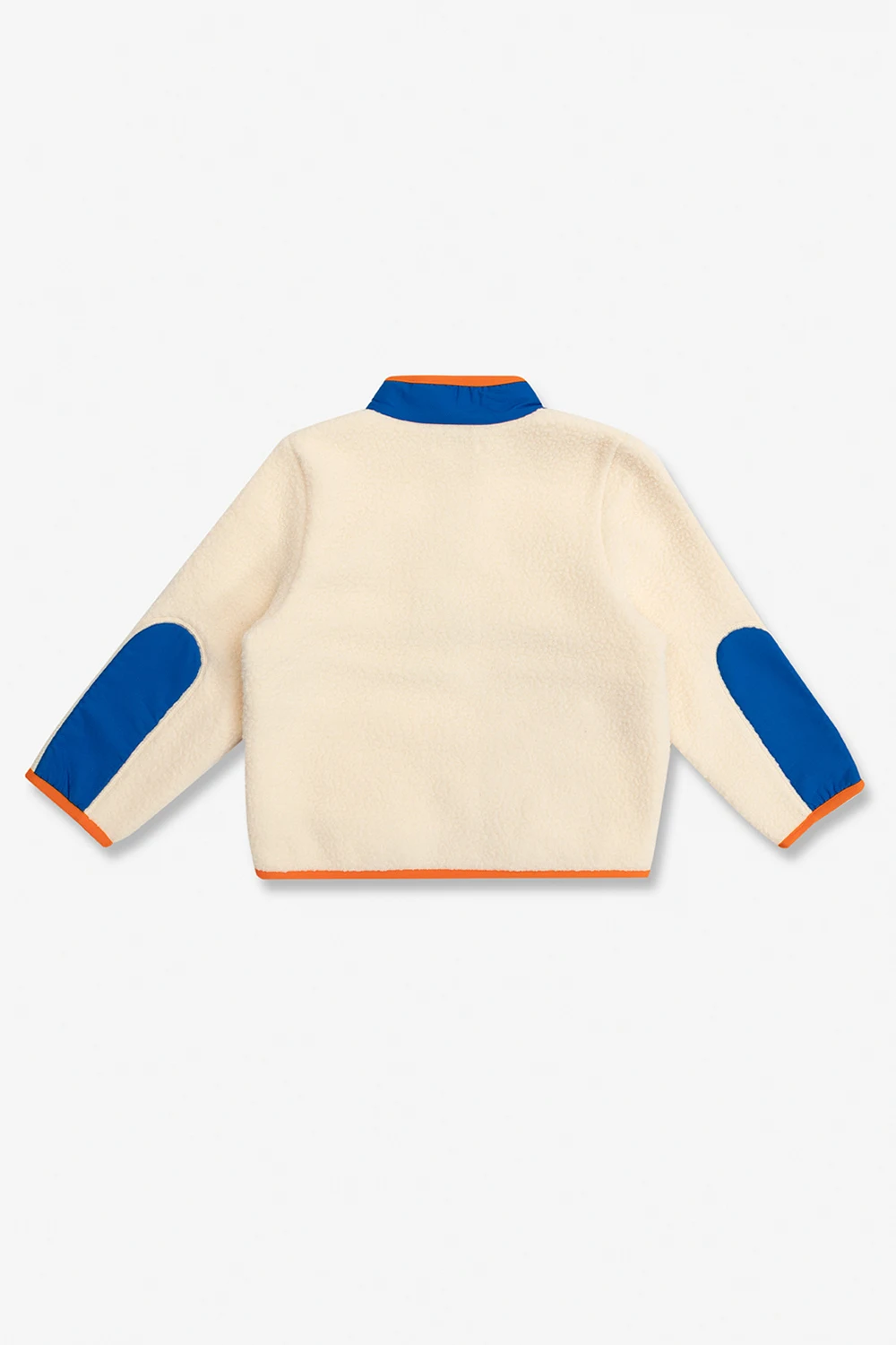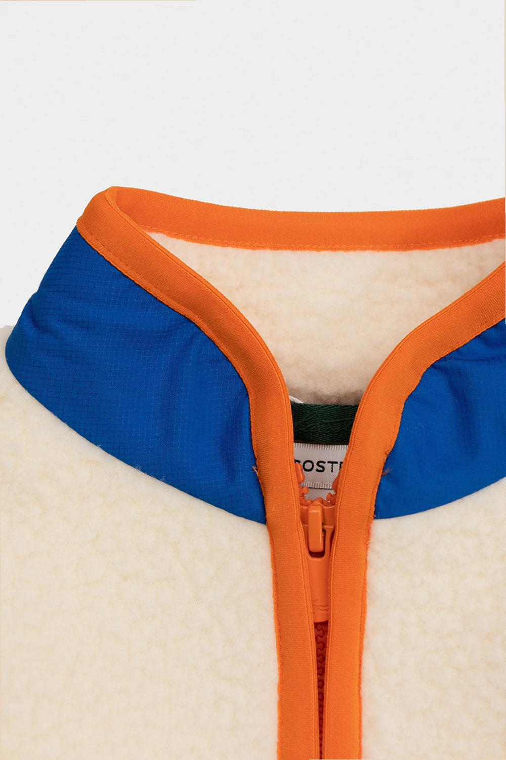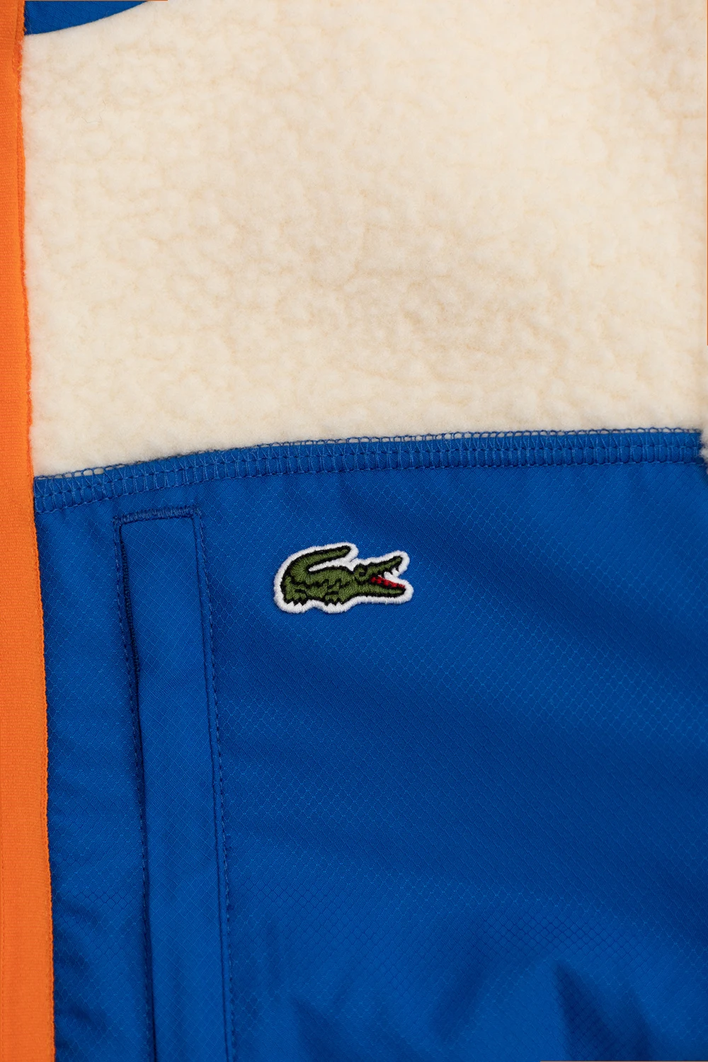 Cream, blue and orange jacket from Lacoste Kids. Crafted in faux-fur fleece, this style features a standing collar, a zip fastening, the brand\'s signature colourful logo patch and three frontal pockets – one is zipped.