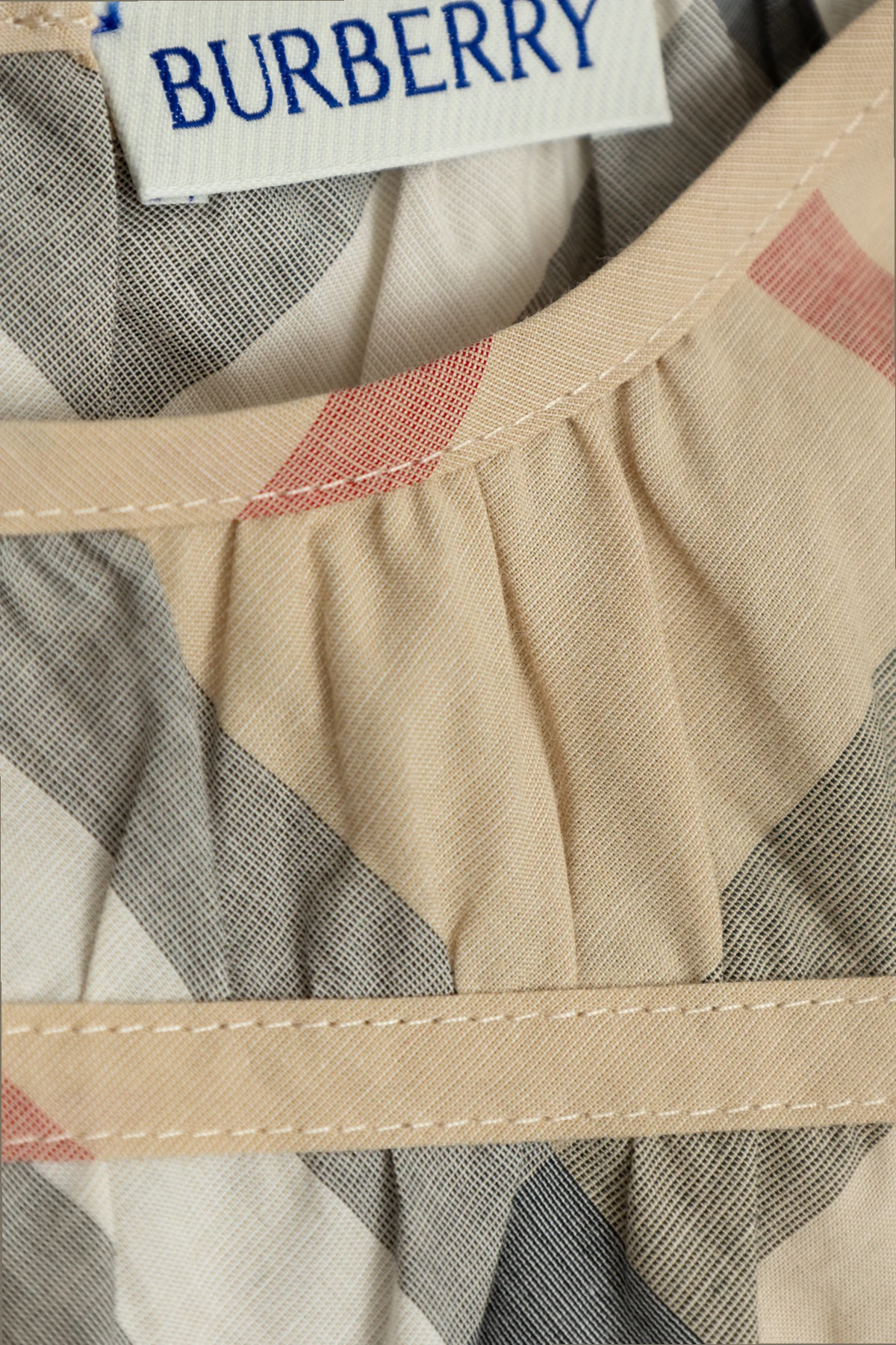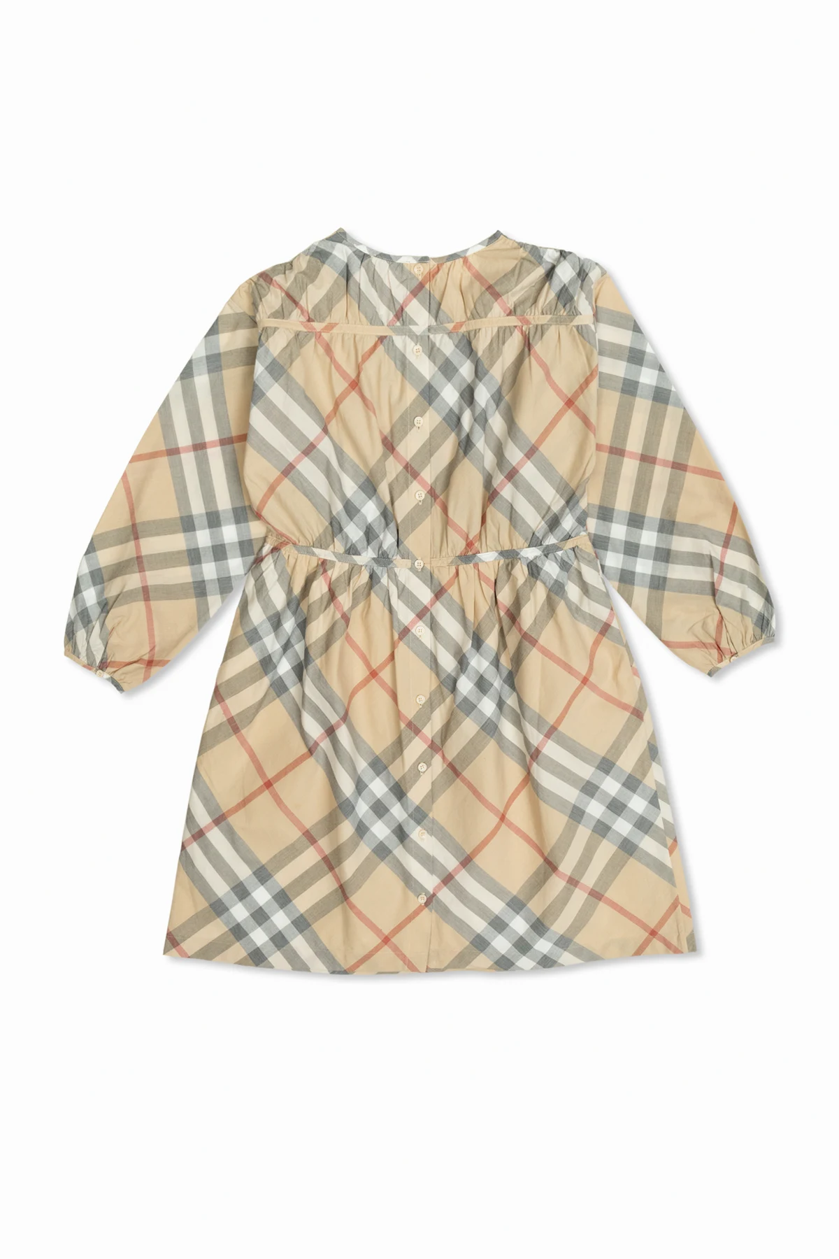 Presenting the Burberry Kids Checkered Dress, an exquisite piece from the exclusive collection of the renowned designer Burberry. This dress epitomizes the brand\'s timeless elegance and superior craftsmanship, making it a quintessential addition to any young girl\'s wardrobe. The dress showcases Burberry\'s iconic tartan pattern, featuring a beige backdrop adorned with grey, white, and red stripes. Its classic silhouette is enhanced by long sleeves and a gentle gathering at the waist, creating a flattering and refined look. Crafted from 100% cotton, the material feels light and delicate, ensuring the utmost comfort. The sleeves are finished with subtle cuffs, and the round neckline, along with the delicate pleating at the front and back, adds a touch of sophistication. Authenticity is guaranteed with the visible Burberry label, affirming the exclusivity of this luxurious piece. The dress is completed with a button closure at the back, making it both practical and stylish. Why Choose This Product? Iconic Design: Features Burberry\'s signature tartan pattern. Superior Comfort: Made from lightweight and breathable 100% cotton. Elegant Details: Includes delicate pleating, round neckline, and subtle sleeve cuffs. Authentic and Exclusive: Comes with a Burberry label, ensuring originality.