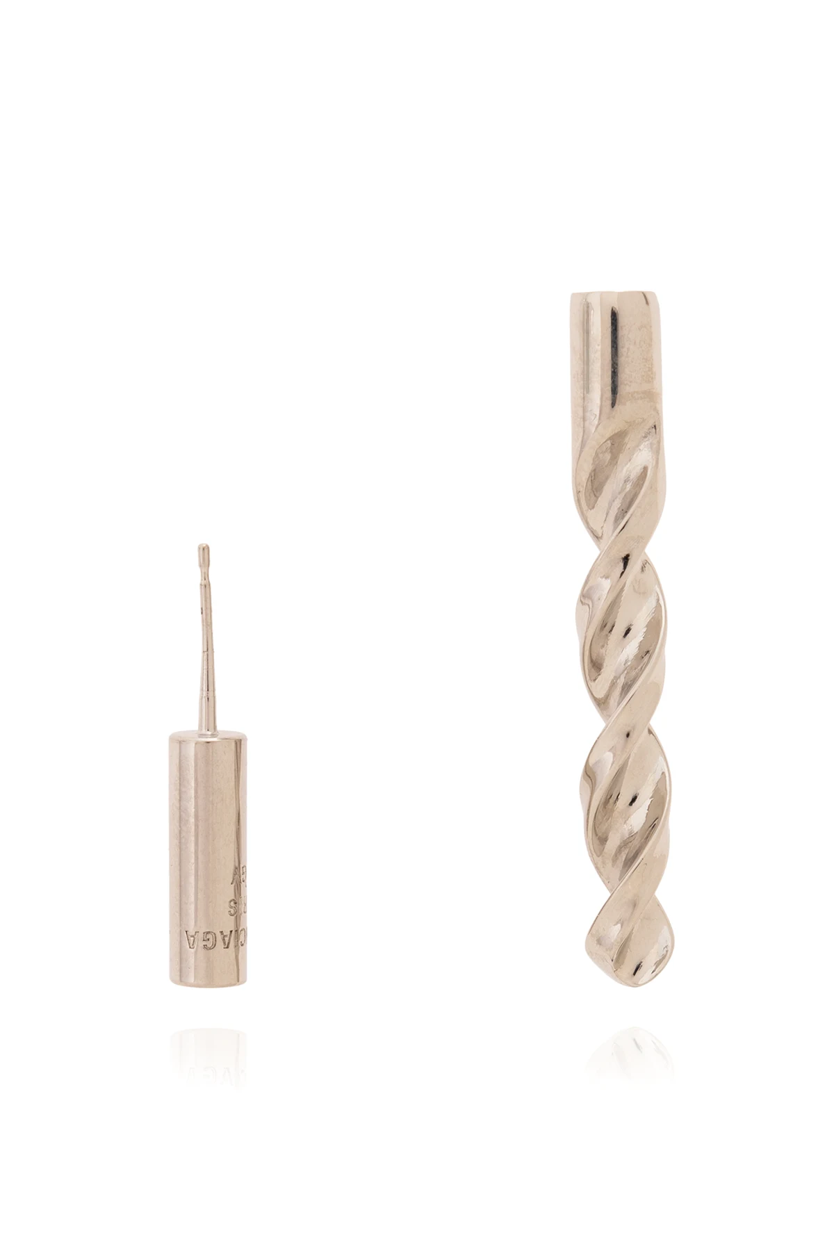 Introducing the quintessence of modern elegance and avant-garde design: the Balenciaga Single Long Earring. This exquisite piece, with its dominant silver hue, is crafted from the finest 100% brass, ensuring both durability and a luxurious sheen. The earring\'s distinctive spiral shape, reminiscent of a twisted ribbon, exudes sophistication and a sense of dynamism, making it a statement piece par excellence. The surface of the earring is meticulously polished, reflecting light in a way that accentuates its intricate form and the precision of its design. At the apex of this spiraling marvel, the designer\'s signature is delicately engraved, a hallmark of Balenciaga\'s commitment to quality and exclusivity. When worn, this singular accessory cascades elegantly, likely reaching the shoulder, akin to the unconventional categorization of \"long sleeve\" in its length, presenting a silhouette that is both striking and flattering. Additional imagery showcases the earring from various angles, offering a comprehensive view of its three-dimensional shape and the exquisite detailing of the designer\'s inscription. Whether viewed up close or from afar, the Balenciaga Single Long Earring is a testament to the artistry and vision of its creator, making it a must-have for those who covet fashion-forward accessories. Why Purchase This Product? Exclusive Design: A unique, spiral silhouette that stands out in any ensemble. High-Quality Materials: Made from 100% brass for lasting shine and durability. Luxurious Detail: Features the engraved Balenciaga logo, symbolizing designer quality. Versatile Elegance: Perfect for adding a touch of sophistication to both day and evening wear.
