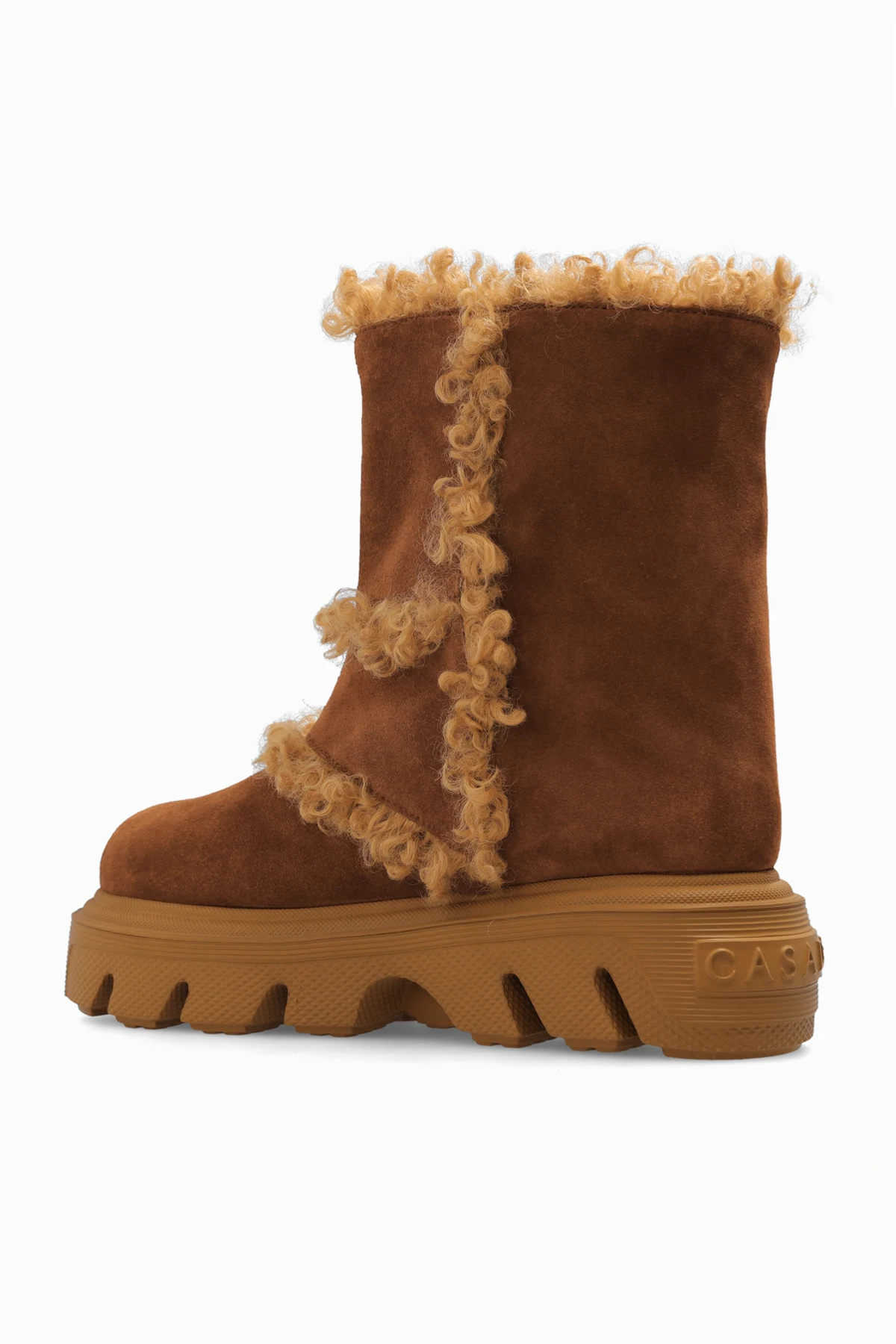 Dark brown ‘Marika’ slip-on boots from Casadei. Crafted from suede with fur trims, this pair sits on a light brown rubber sole.