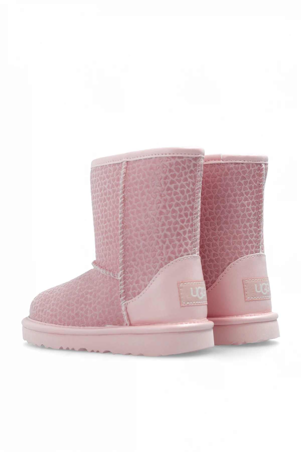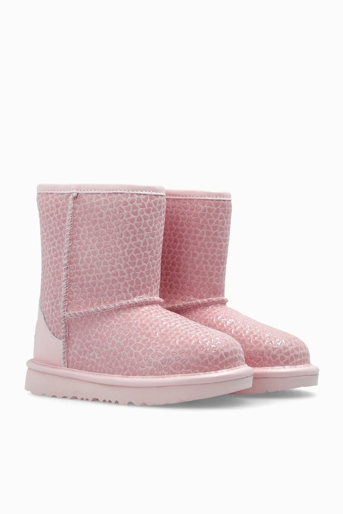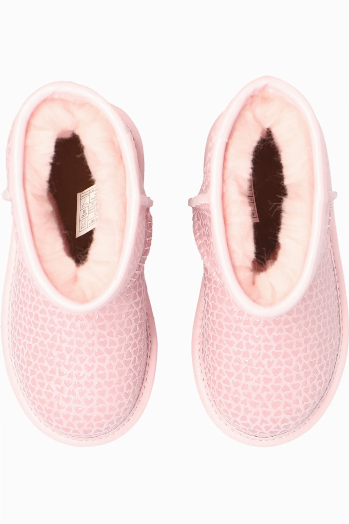 Light pink ‘T Classic II Gel Hearts’ snow boots from UGG. Made of suede and lined with a soft UGGplush™ wool-blend material, this model showcases tiny gel hearts all over the upper and a logo patch on the back. The pink sole is crafted from renewable, rainwater-nourished sugarcane instead of petroleum-based EVA.