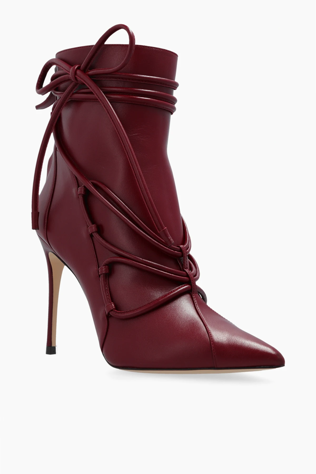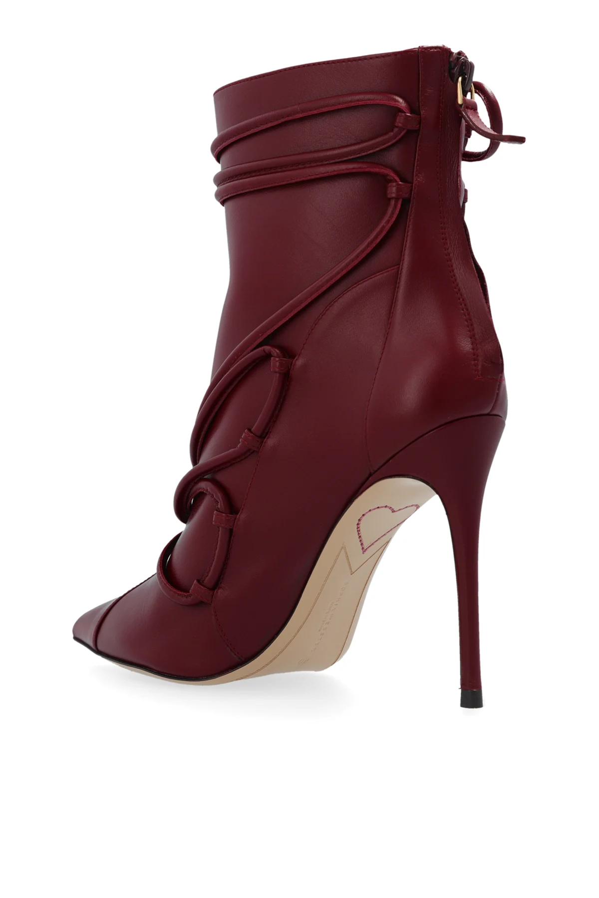 Introducing the Havanna Heeled Booties by Sophia Webster, an epitome of elegance and sophistication. These exclusive booties, crafted from premium leather, boast a deep burgundy hue, exuding a refined and luxurious charm. The Havanna booties feature a high shaft that extends just above the ankle, coupled with a pointed toe for a sleek and timeless silhouette. The high, slender stiletto heel accentuates their feminine allure, making them a perfect choice for both casual and formal occasions. Designed with meticulous attention to detail, these booties are adorned with decorative laces artfully intertwined along the shaft and front, adding a unique and artistic touch. The rear zipper ensures ease of wear, while the light-colored sole, embellished with a subtle pattern around the heel, provides a striking contrast and additional sophistication. Why Choose These Booties? Exclusive design by renowned designer Sophia Webster Crafted from high-quality leather for durability and comfort Elegant burgundy color that enhances any outfit High stiletto heel for a chic and feminine look Unique decorative laces for a distinctive style Convenient rear zipper for easy wear