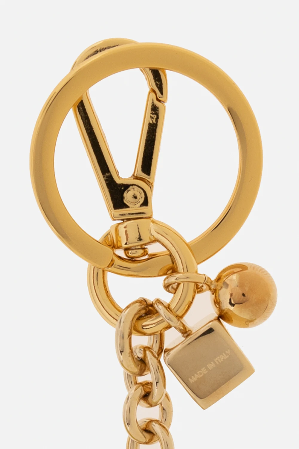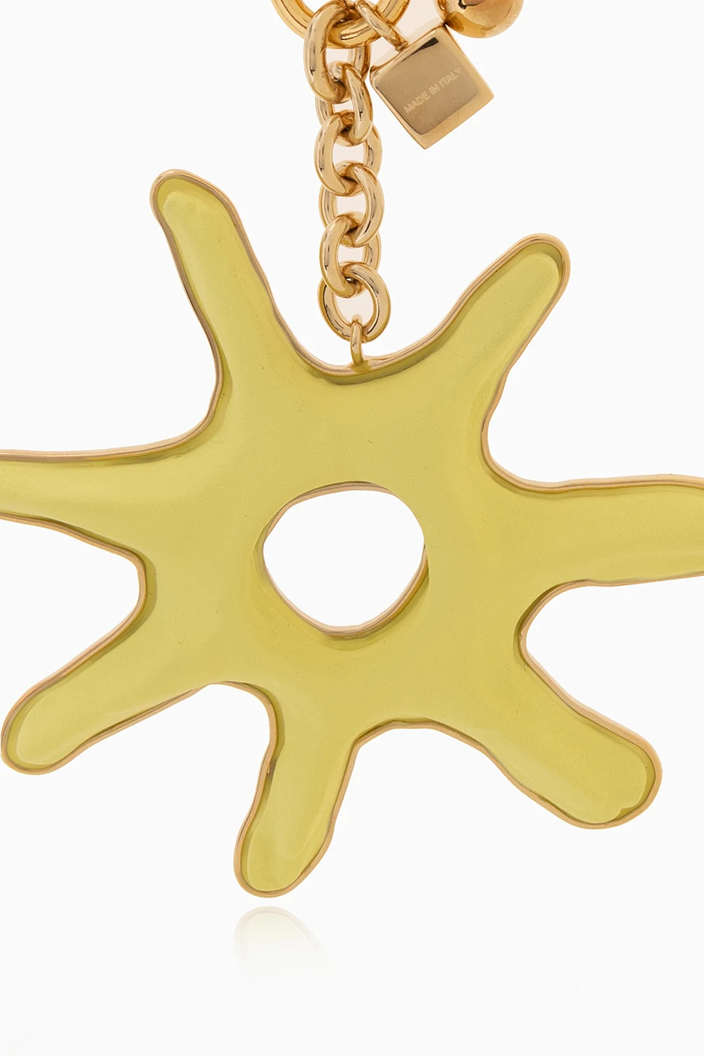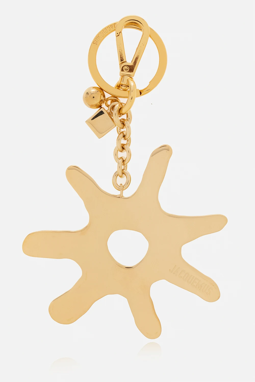 Gold-tone and yellow keyring from Jacquemus. Crafted from brass, this item secures with a lobster clasp fastening and features two small pendants with an engraved logo and a big sun-shaped one made of clay-effect plaster.
