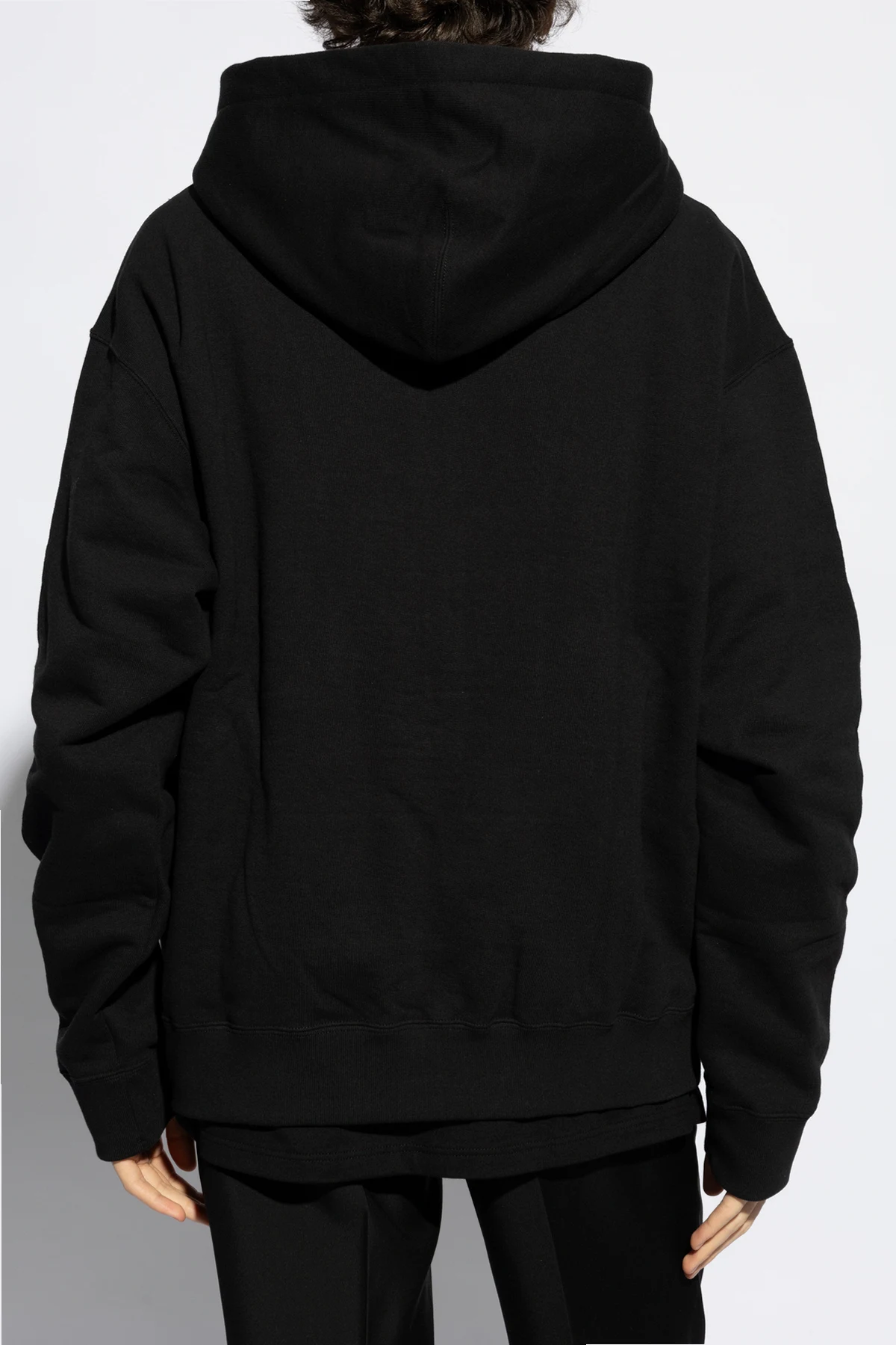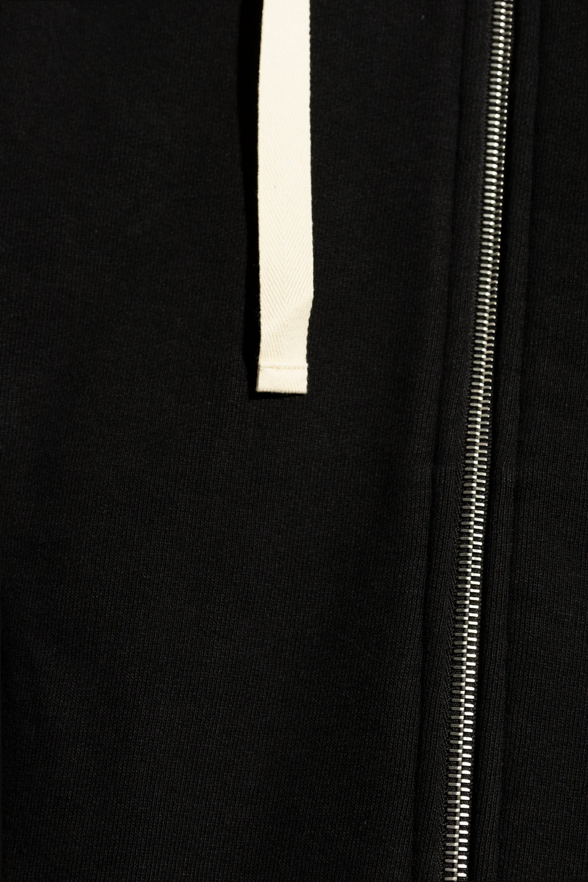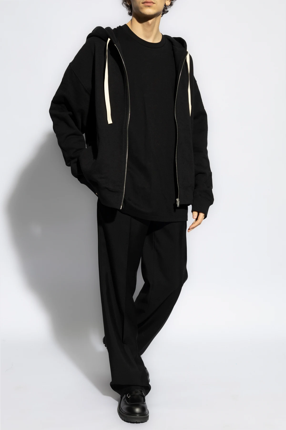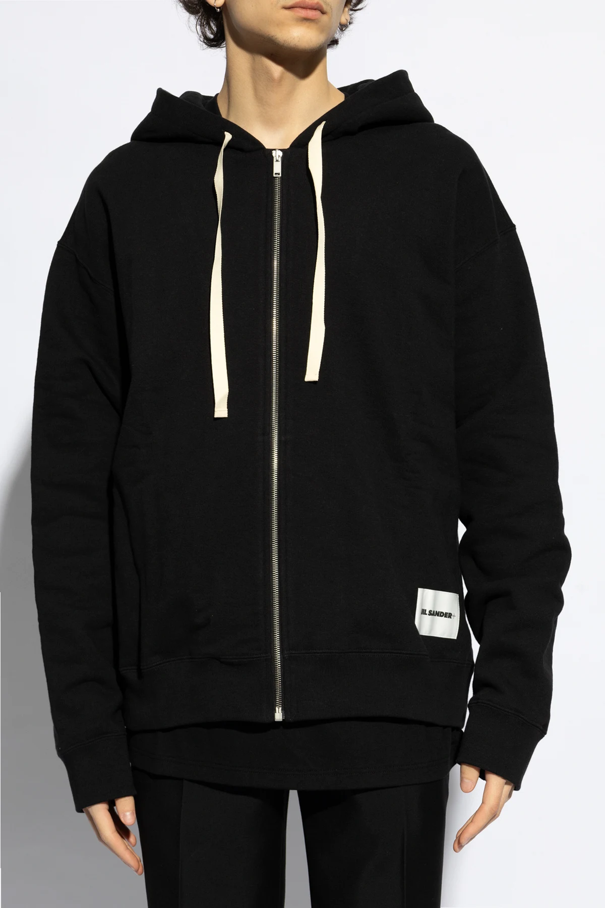 Black sweatshirt with a drawstring hood from Jil Sander+. Made from cotton, this style fastens via a zip and showcases a logo patch on the front, two slip pockets, long sleeves and ribbed trims on the bottom hem and cuffs.