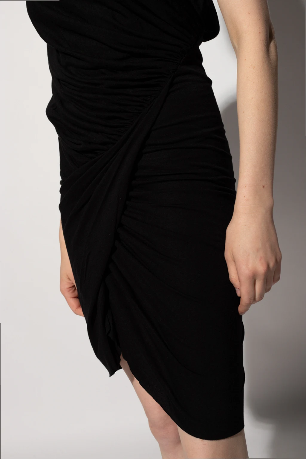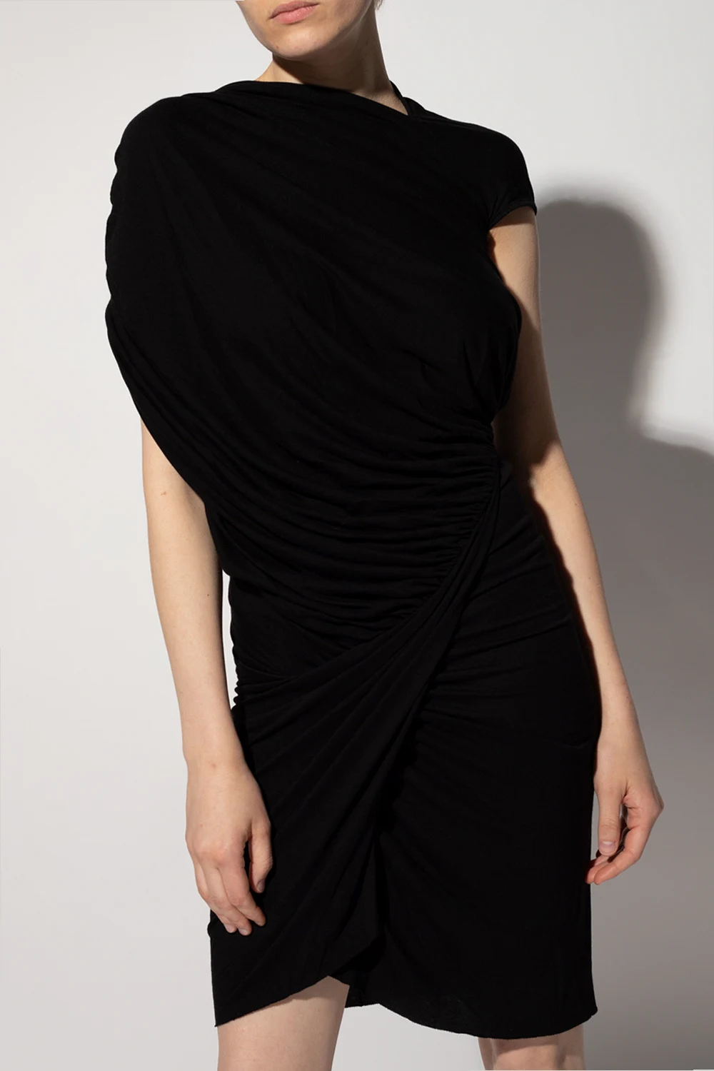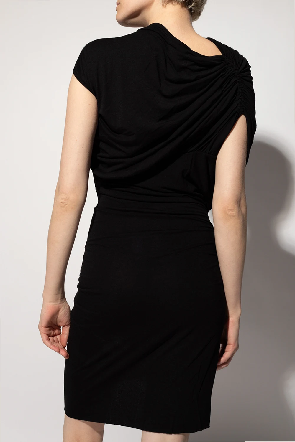 Black dress from Rick Owens Lilies. Crafted from a cotton blend, this style features a loose neck and asymmetrical seams.