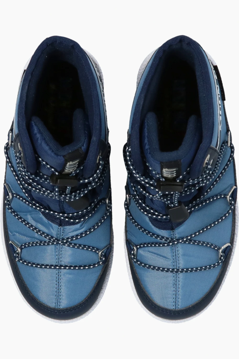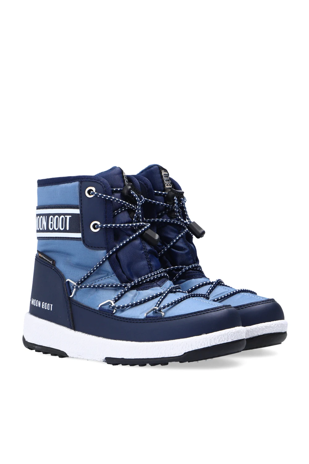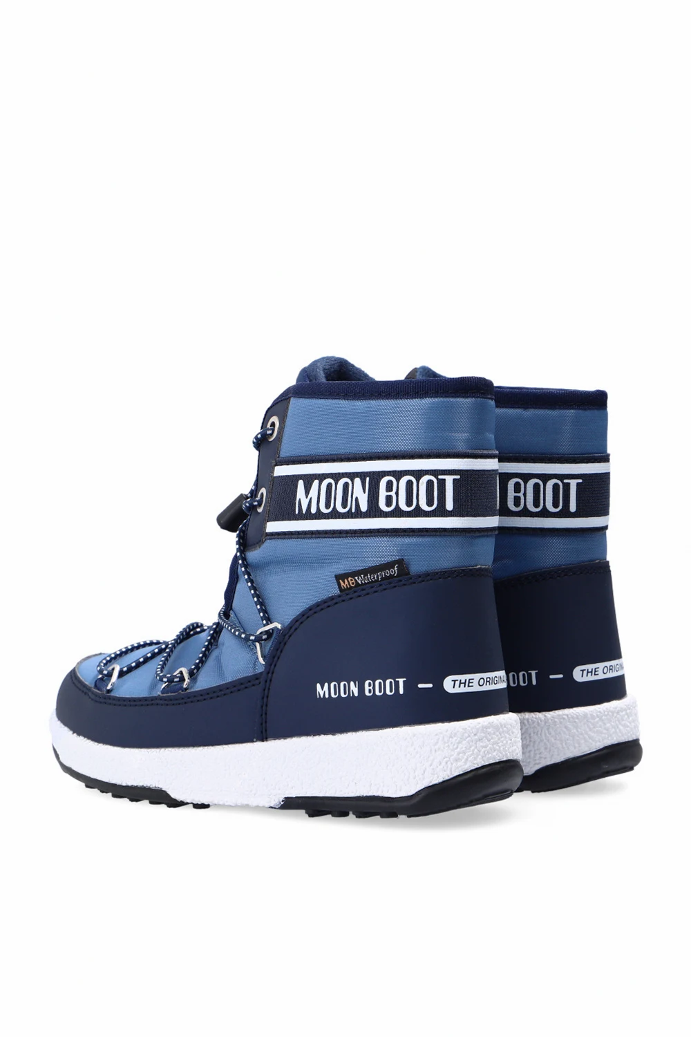 Navy and blue ‘JR Boy Soft’ snow boots from Moon Boot Kids. Fastened with drawstrings, this design features a logo detail, silver-tone metal hardware and rubber sole in black and white. Inspired by the peculiar shape and technology of the astronauts’ boots, the iconic style was designed in 1969 after the first Moon landing.