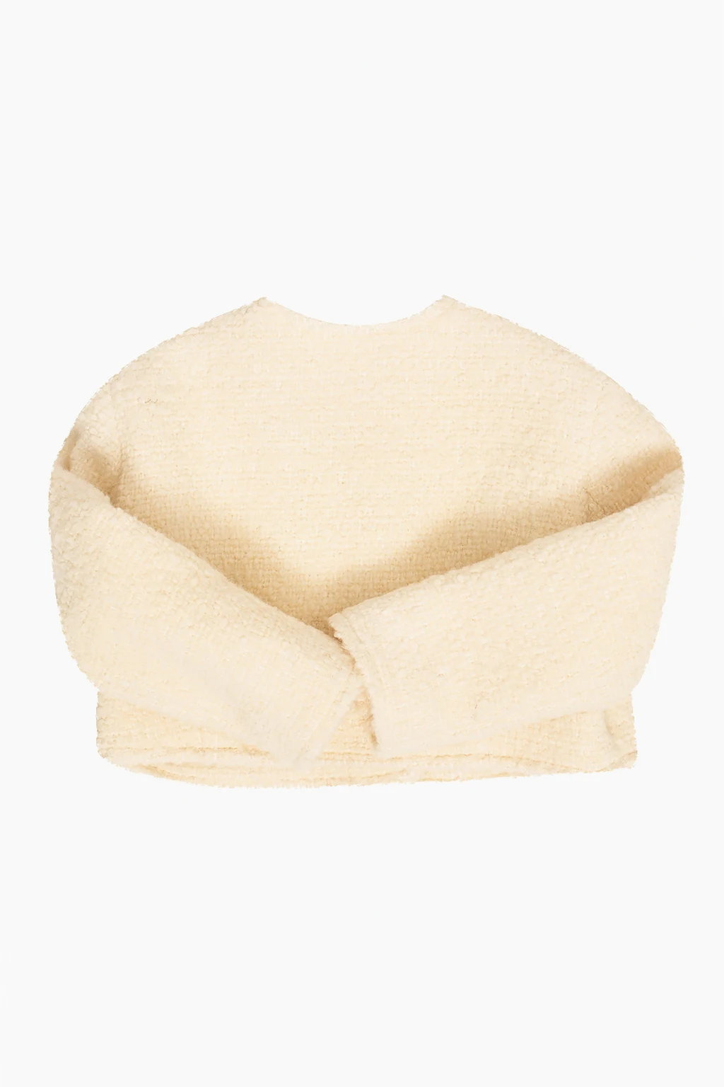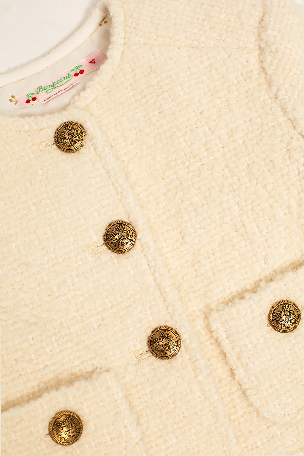 Cream jacket from Bonpoint Kids. Crafted from a wool and cotton blend, this style features button fastenings, two patch pockets and long sleeves.