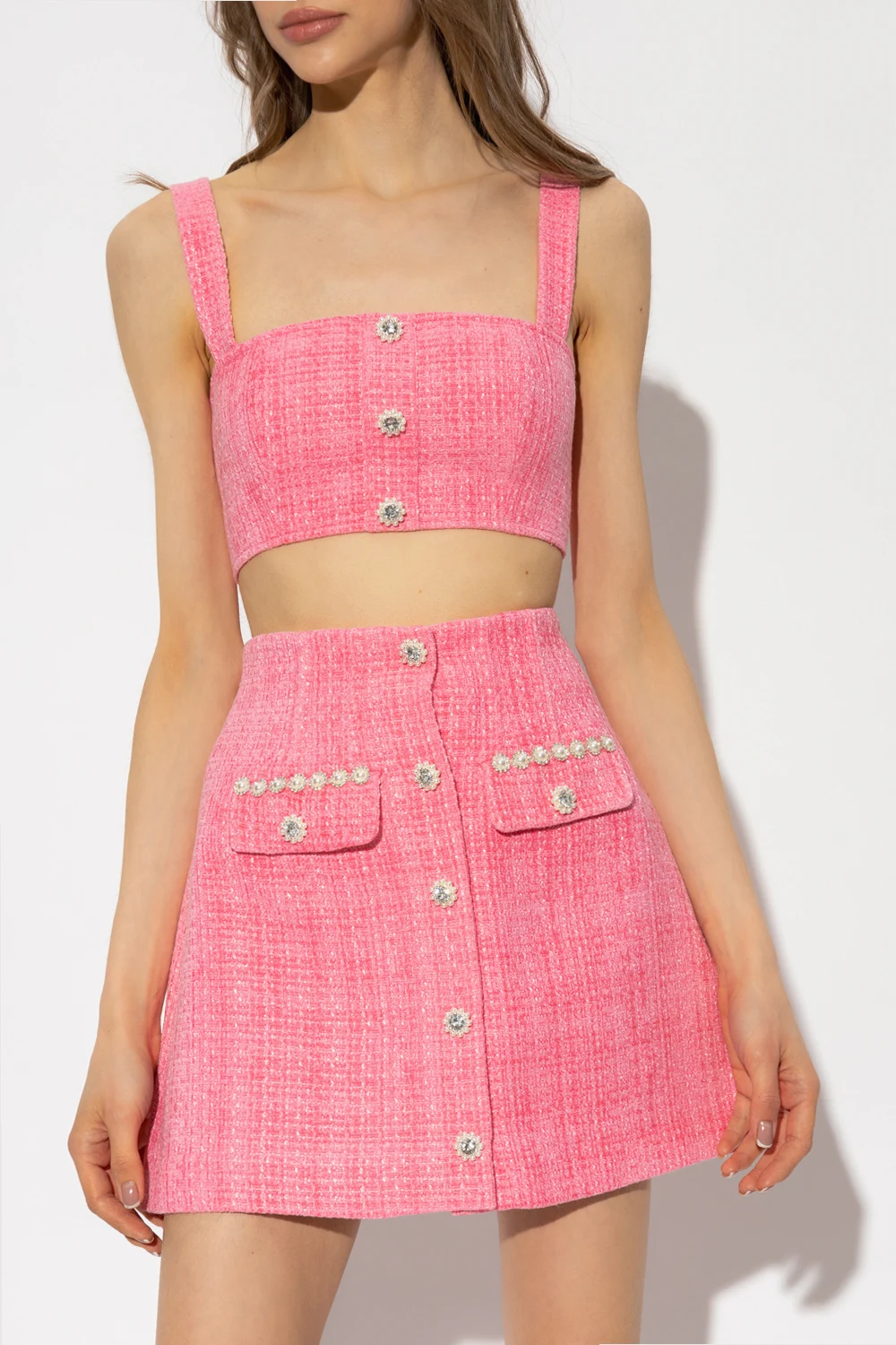 Pink cropped tank top from Self Portrait. Crafted from boucle fabric, this garment is complete with a zip and hook fastening as well a decorative buttons with crystals and glass pearls.