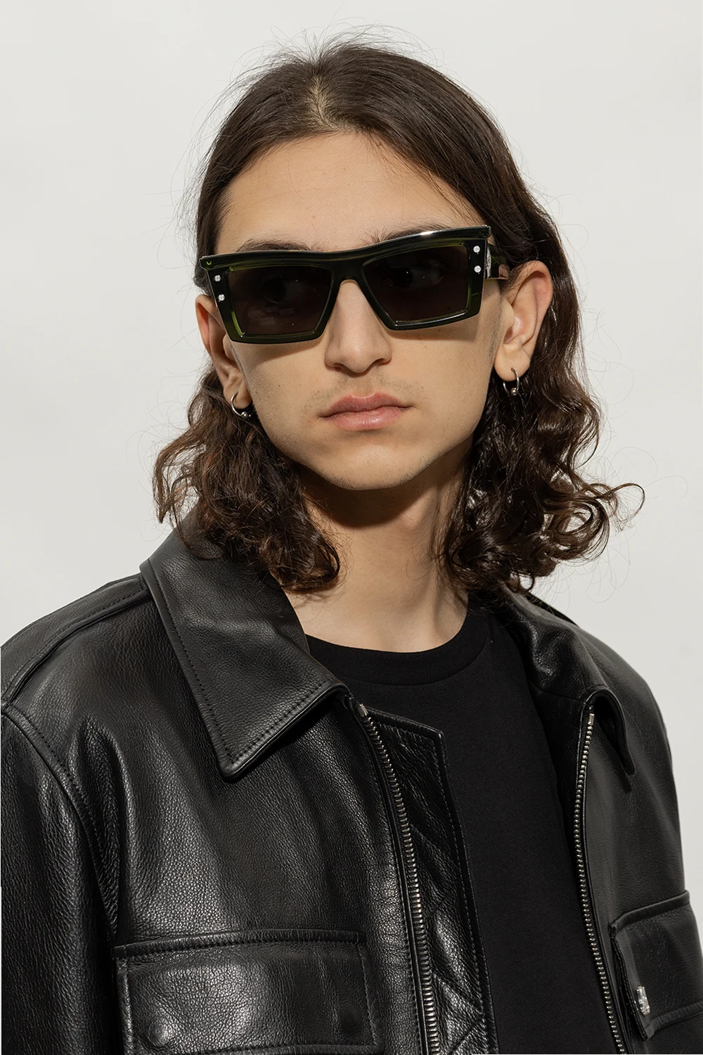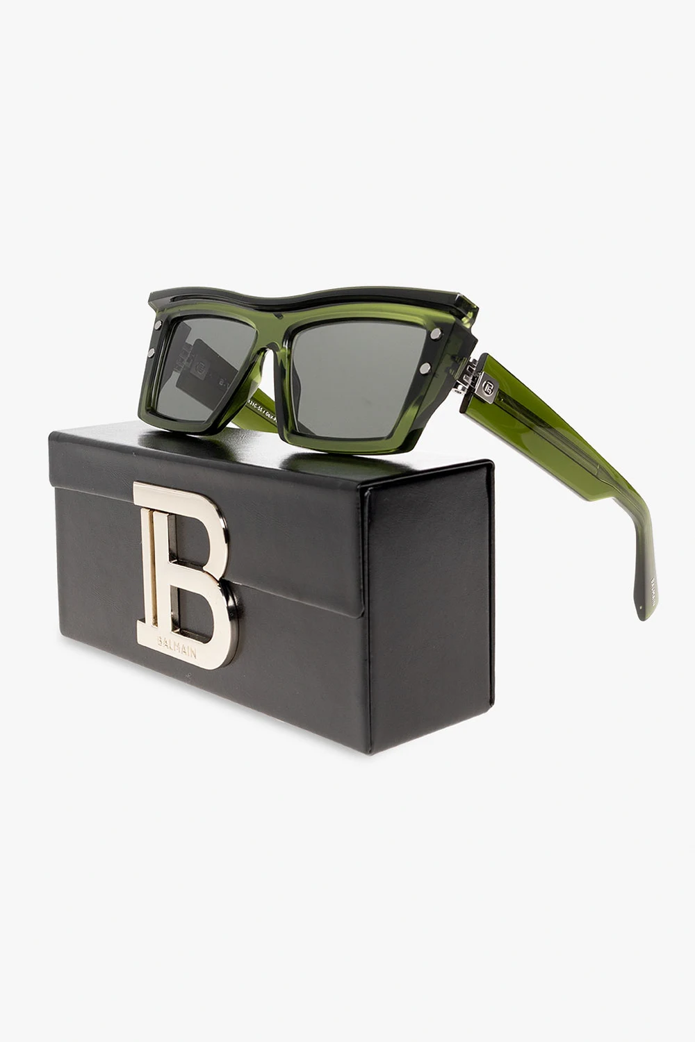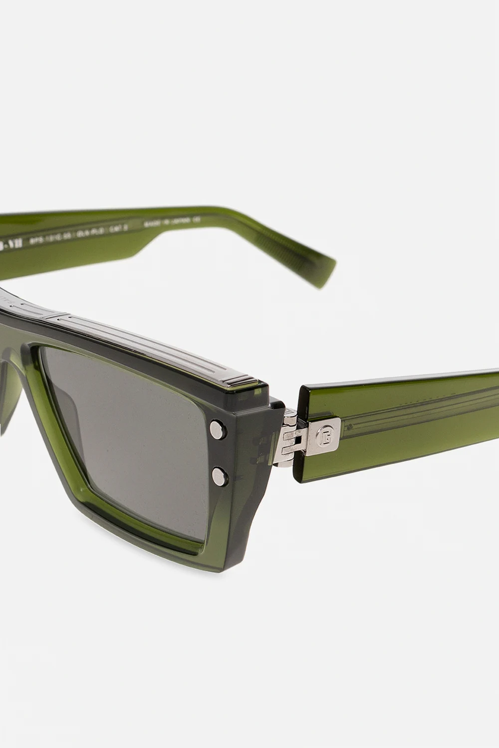 Dark green and silver-tone ‘B-VII’ sunglasses from Balmain. This pair has rectangular frames made of matte acetate, titan elements with a logo, monogram studs on the front, wide temples with decorative hinges and green gradient lenses with UV protection. Comes with a case.