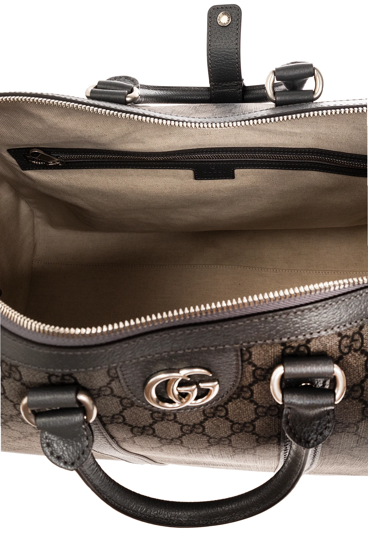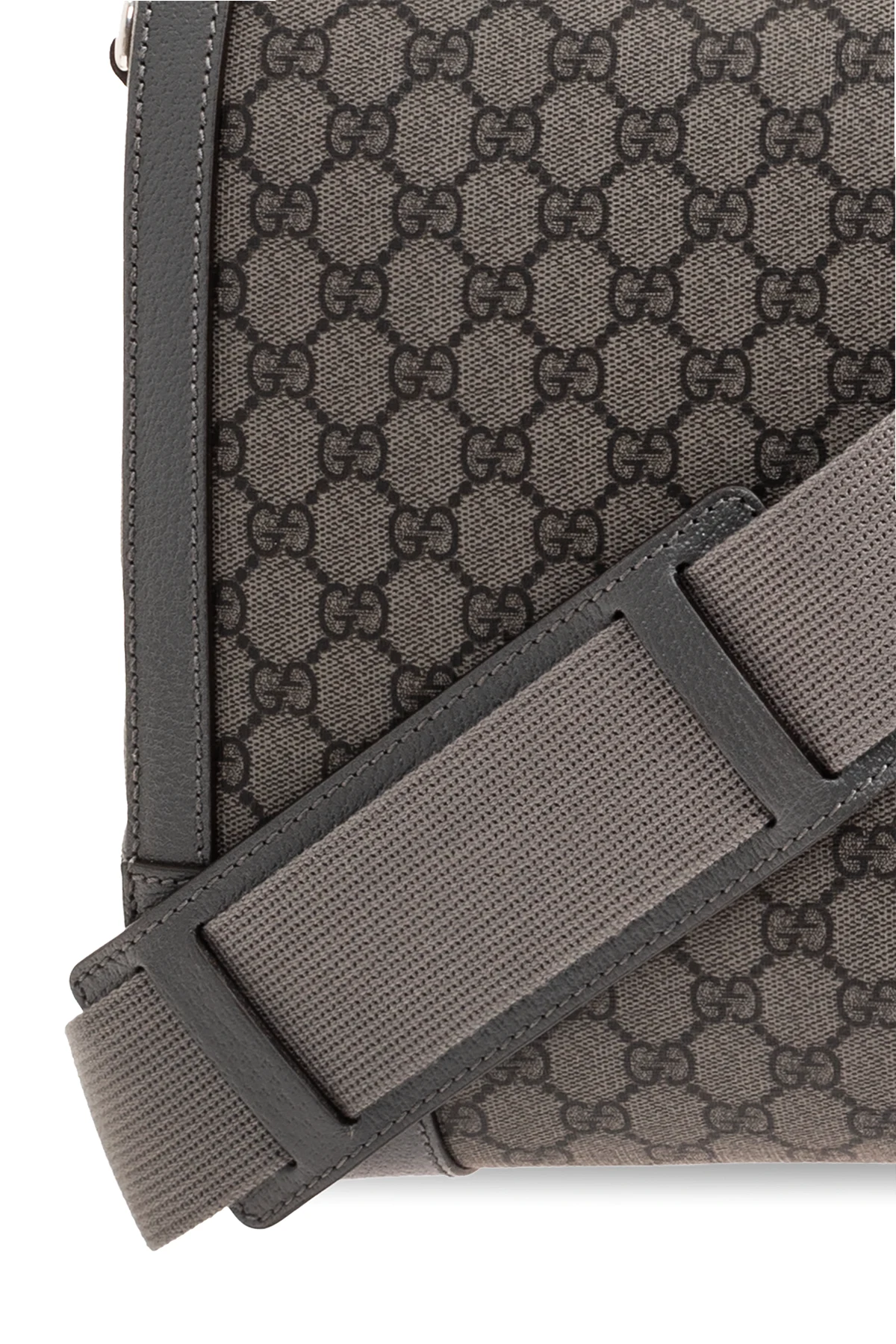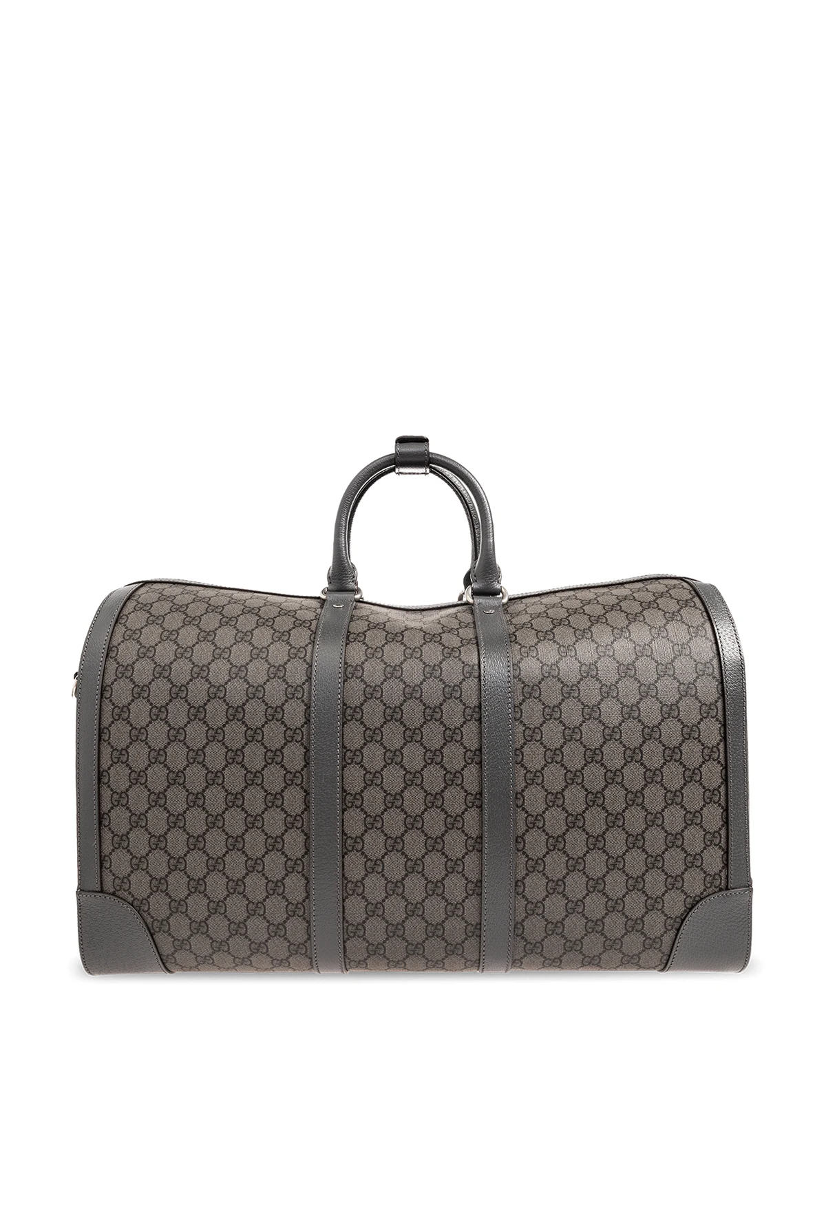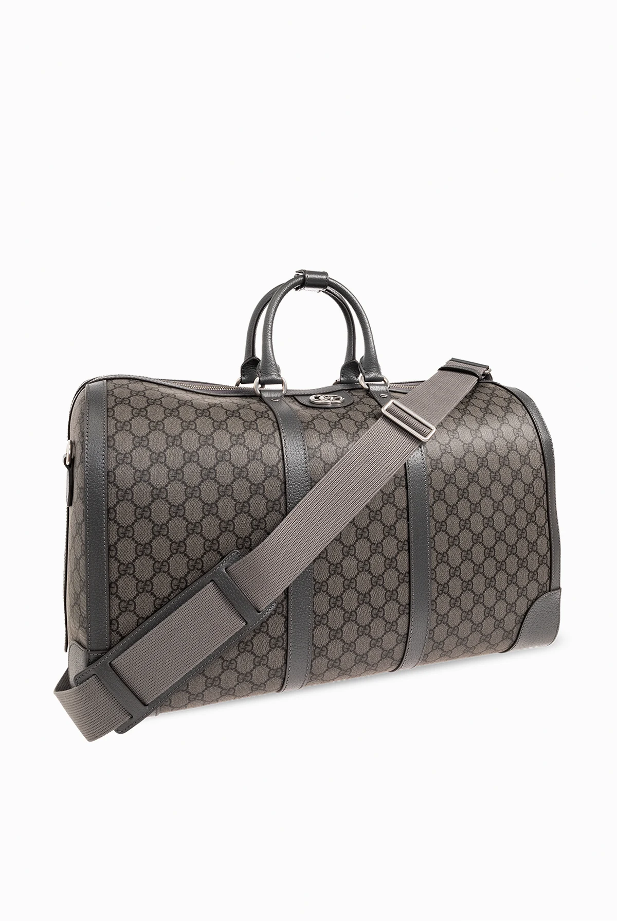 Dark grey ‘Ophidia Large’ duffel bag from Gucci. Crafted from the brand\'s signature GG Supreme canvas and trimmed with calf leather, this design fastens via a two-way zip and showcases Double G hardware, two half-round handles linked via a snap strap, silver-tone metal elements as well as a detachable and adjustable shoulder strap and one internal compartment with two zip pockets. Comes with a padlock and two detachable pendants: a keyed one and an ID tag.