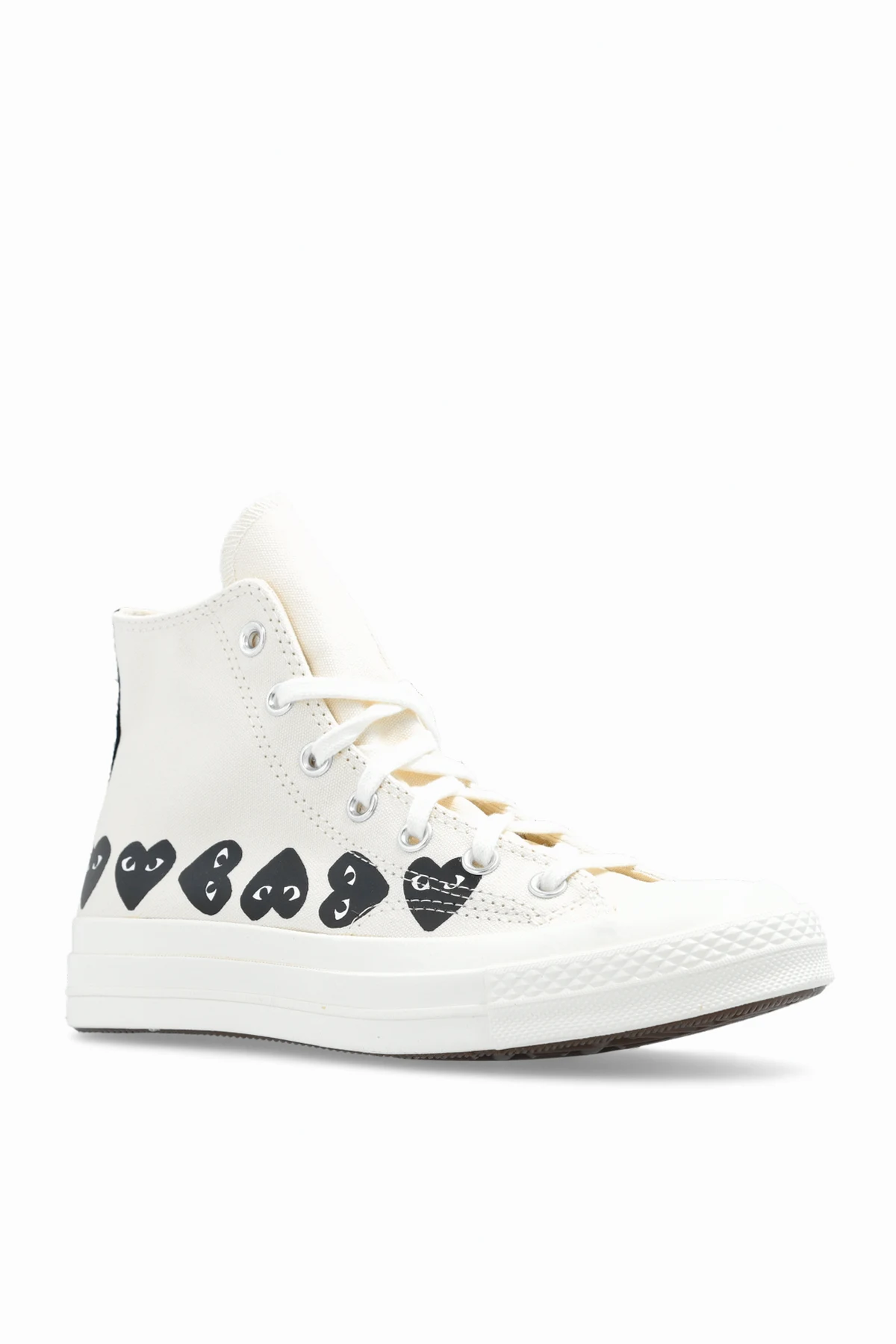 Cream and black high-top sneakers from Comme des Garçons Play X Converse. Enriched by a printed logo and hearts on the sides, this lace-up model sits on a cream rubber sole.