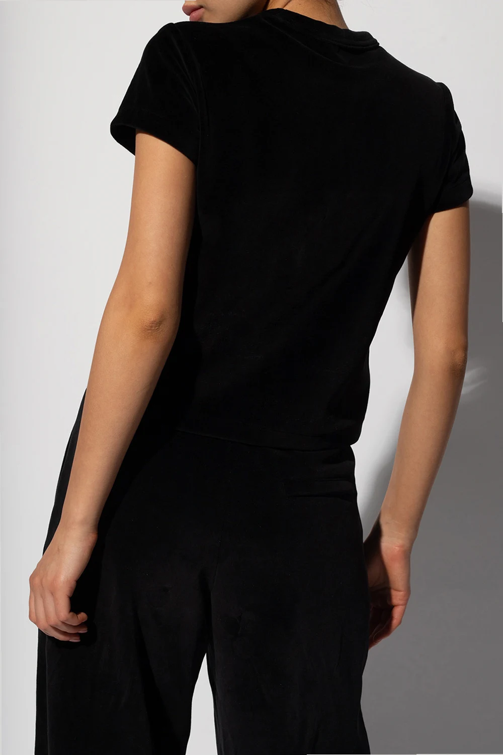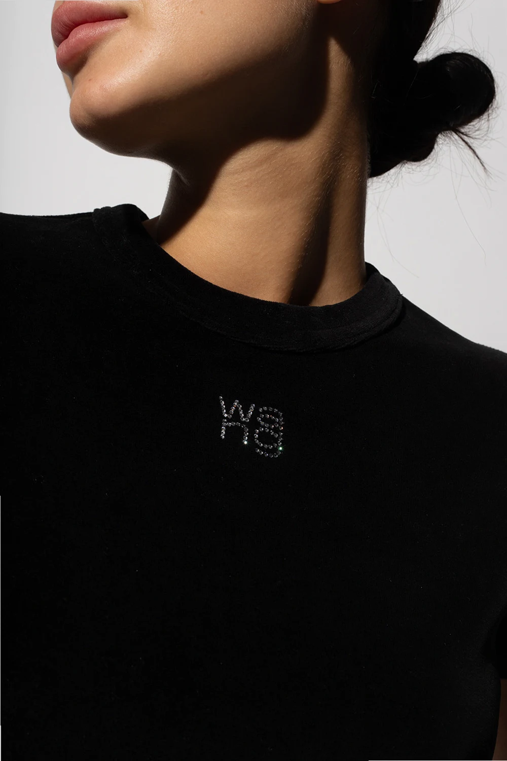 Black crewneck T-shirt from Alexander Wang. Made from velvet, this style showcases a rhinestone-encrusted logo on the front.