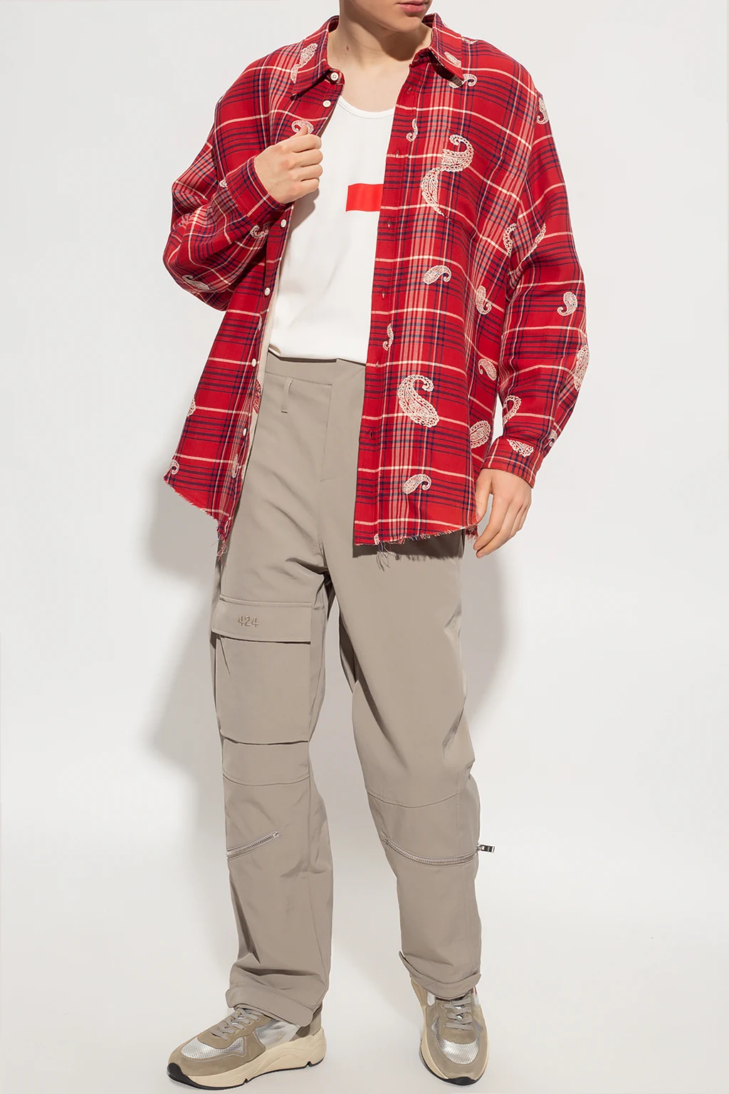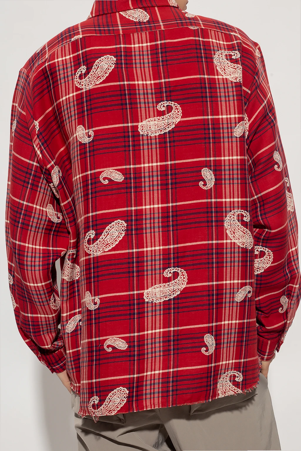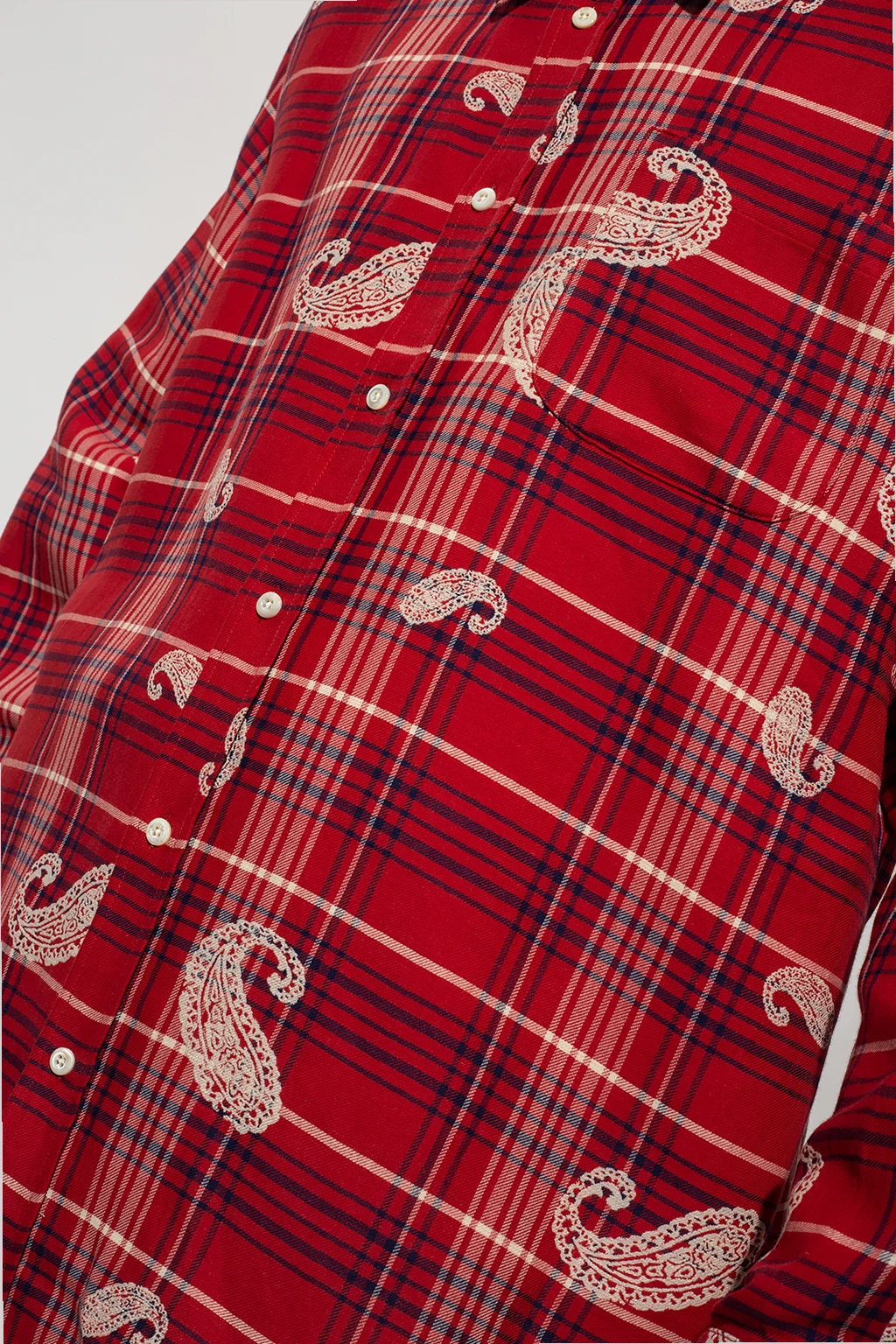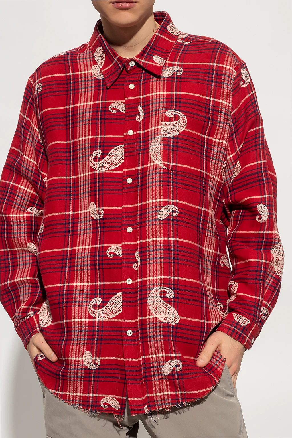 Red shirt from 424. Crafted from a cotton and linen blend, this style showcases a navy blue and cream check pattern and a distinctive cream graphic theme. It is complete with button fastenings, a slip chest pocket, long sleeves with button cuffs and a raw-trimmed bottom hem.