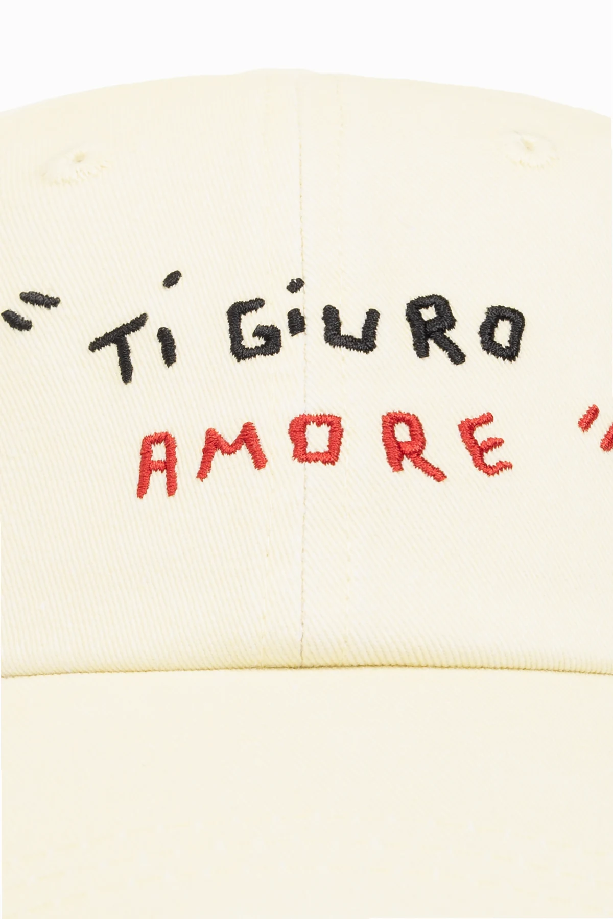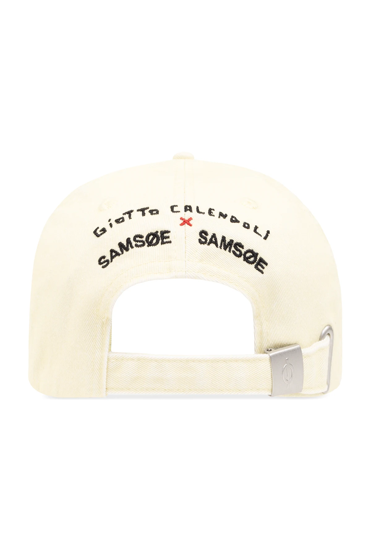 Introducing the Samsoe Samsoe x Giotto Calendoli \'Sagiotto\' cap, a unisex accessory that marries traditional craftsmanship with contemporary design. This exquisite piece features a vibrant yellow hue, emblematic of its bold and bright aesthetic. Crafted from 100% organic cotton, the cap promises not only a soft and durable wear but also an eco-conscious choice for the discerning customer. The front of the cap is adorned with the embroidered phrase \"Ti guro AMORE,\" rendered in red thread with black accents, offering a declaration of love that stands out against its sunny backdrop. On the reverse, above the adjustable strap, lies another embroidered declaration, \"Giotto Calendoli SAMSOE SAMSOE,\" marking the unique collaboration between the renowned designer and the brand. The cap\'s adjustable strap, crafted from the same premium material as the rest of the piece and secured with a metal buckle, ensures a perfect fit for any wearer. Boasting a traditional baseball cap silhouette with a rounded bill, the \'Sagiotto\' cap is both a nod to classic sportswear and a testament to modern fashion sensibilities. Its structured brim and soft panels form a comfortable fit, making it an ideal accessory for both men and women looking to add a splash of color and a touch of uniqueness to their ensemble. Why Purchase This Product? Exclusive Design: A unique collaboration piece that combines Giotto Calendoli\'s creative vision with Samsoe Samsoe\'s quality craftsmanship. Eco-Friendly Material: Made from 100% organic cotton, offering sustainability without sacrificing style. Versatile and Unisex: Perfect for anyone looking to elevate their accessory game with a pop of color and distinctive design. Adjustable for Perfect Fit: Tailor the fit to your preference with the easily adjustable strap and metal buckle closure. Standout Embroidery: Detailed embroidery that adds a personal touch and showcases the collaboration\'s uniqueness.