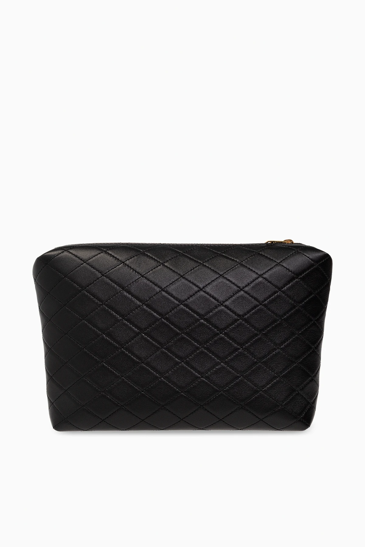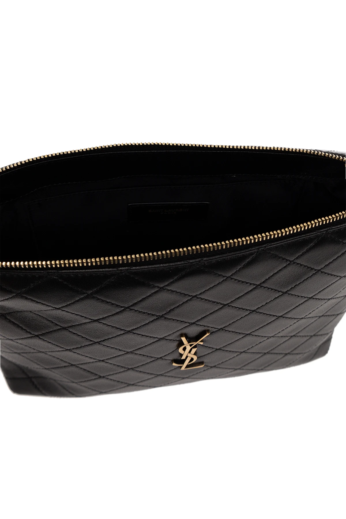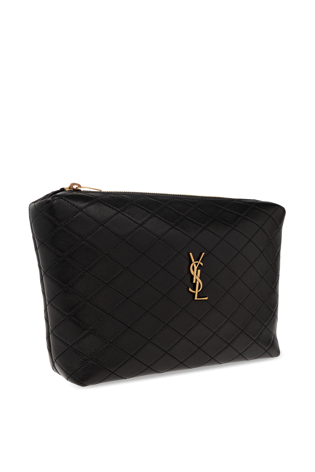Black ‘Gaby’ wash bag from Saint Laurent. Crafted from quilted lamb leather, this design secures with a zip and features antiqued gold-tone metal hardware, including a logo plaque on the front, and one internal compartment with a slip pocket.