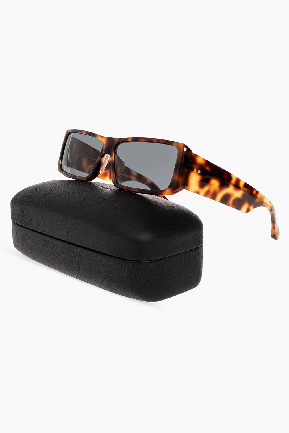 Brown, orange and black ‘157’ sunglasses from Linda Farrow x Dries Van Noten. This pair has square frames, gold-tone metal applliques on the sides and grey lenses with UV protection. Comes with a case.