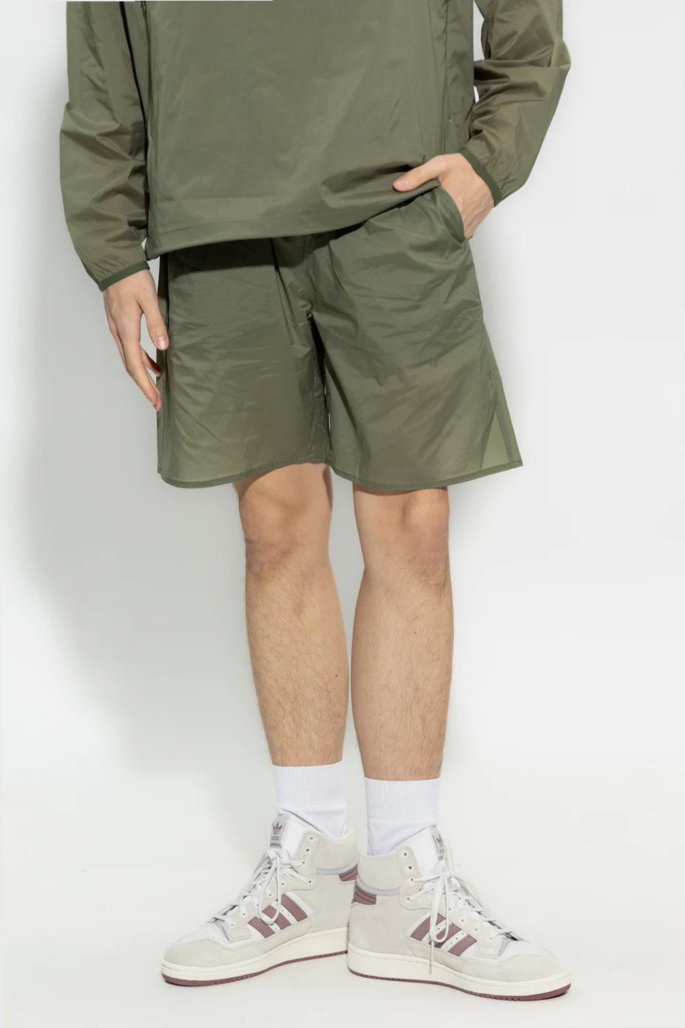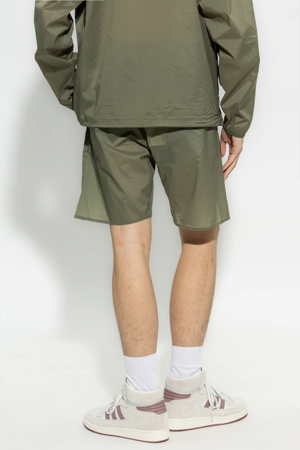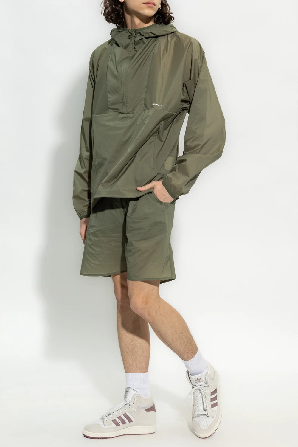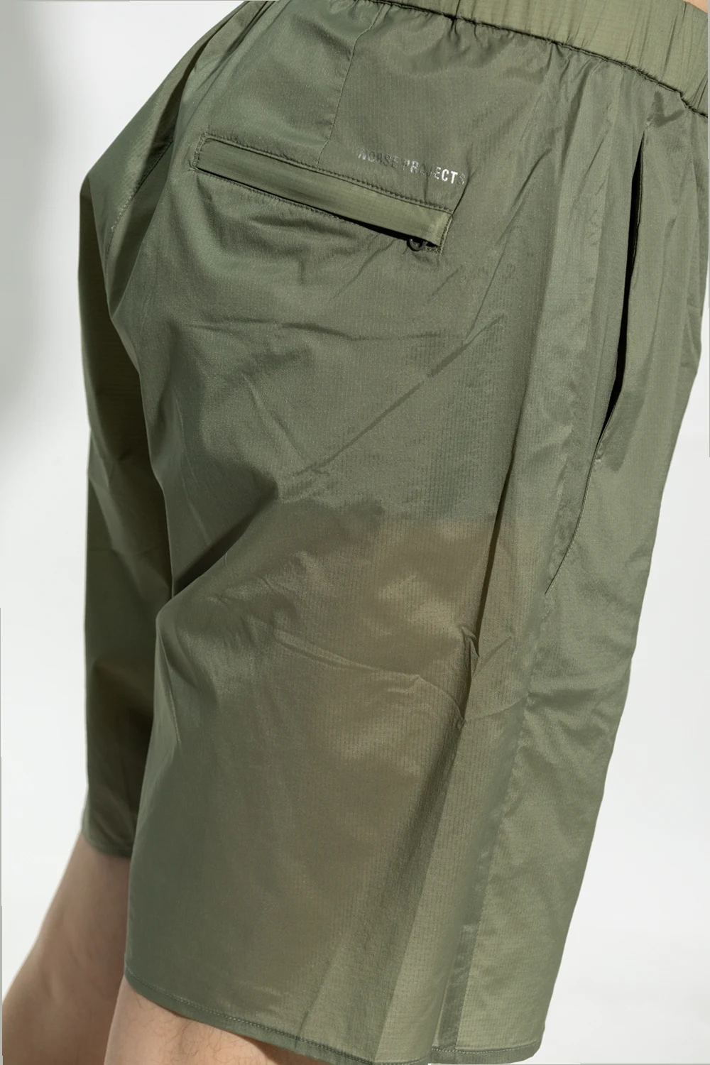 Green ‘Poul’ shorts from Norse Projects. Fastened with drawstrings, this pair features an elastic waistband, logo print at the back, two slip pockets and one zip pocket.