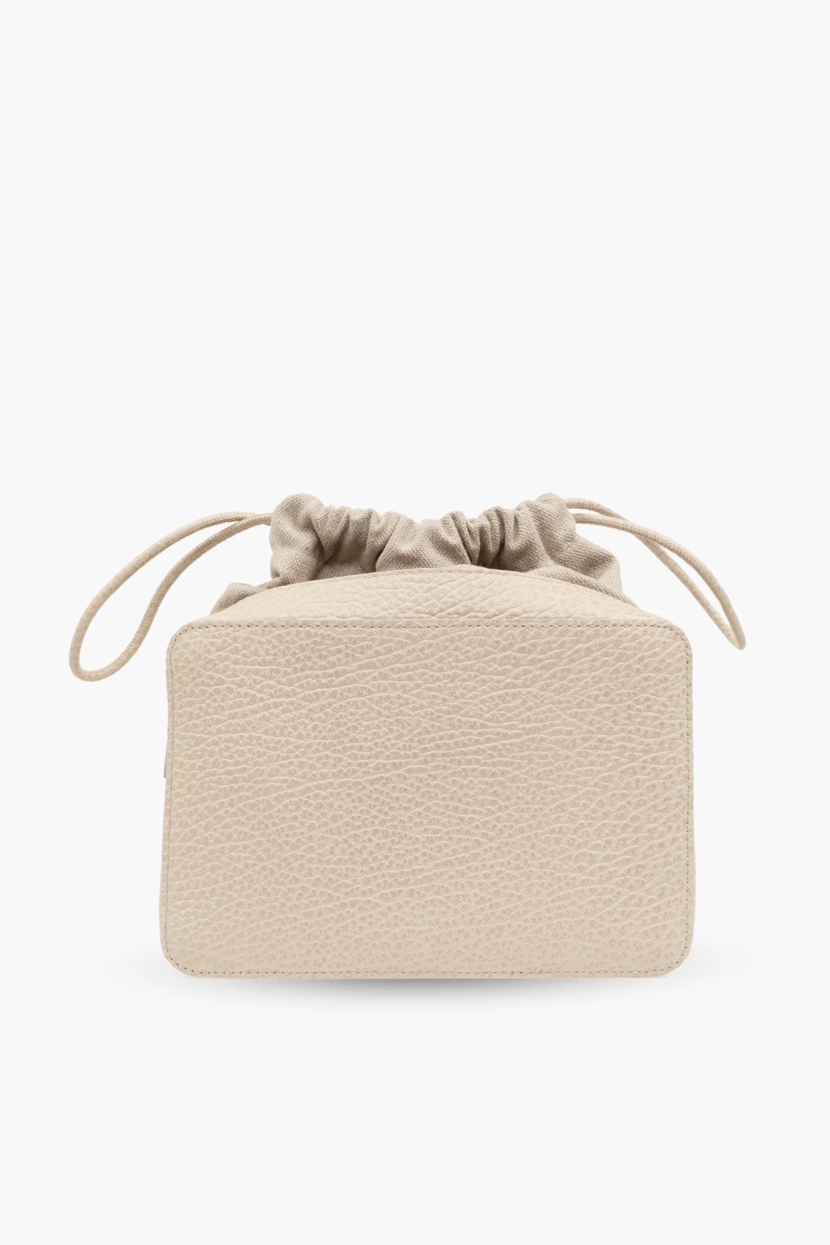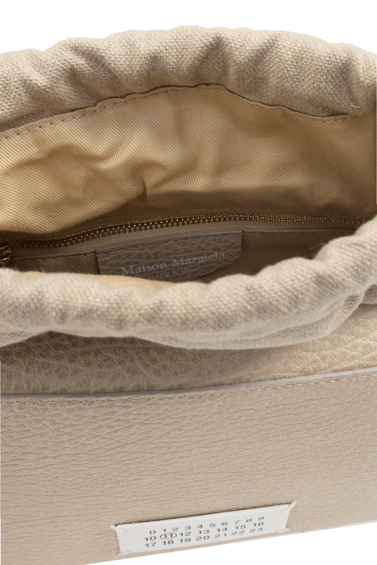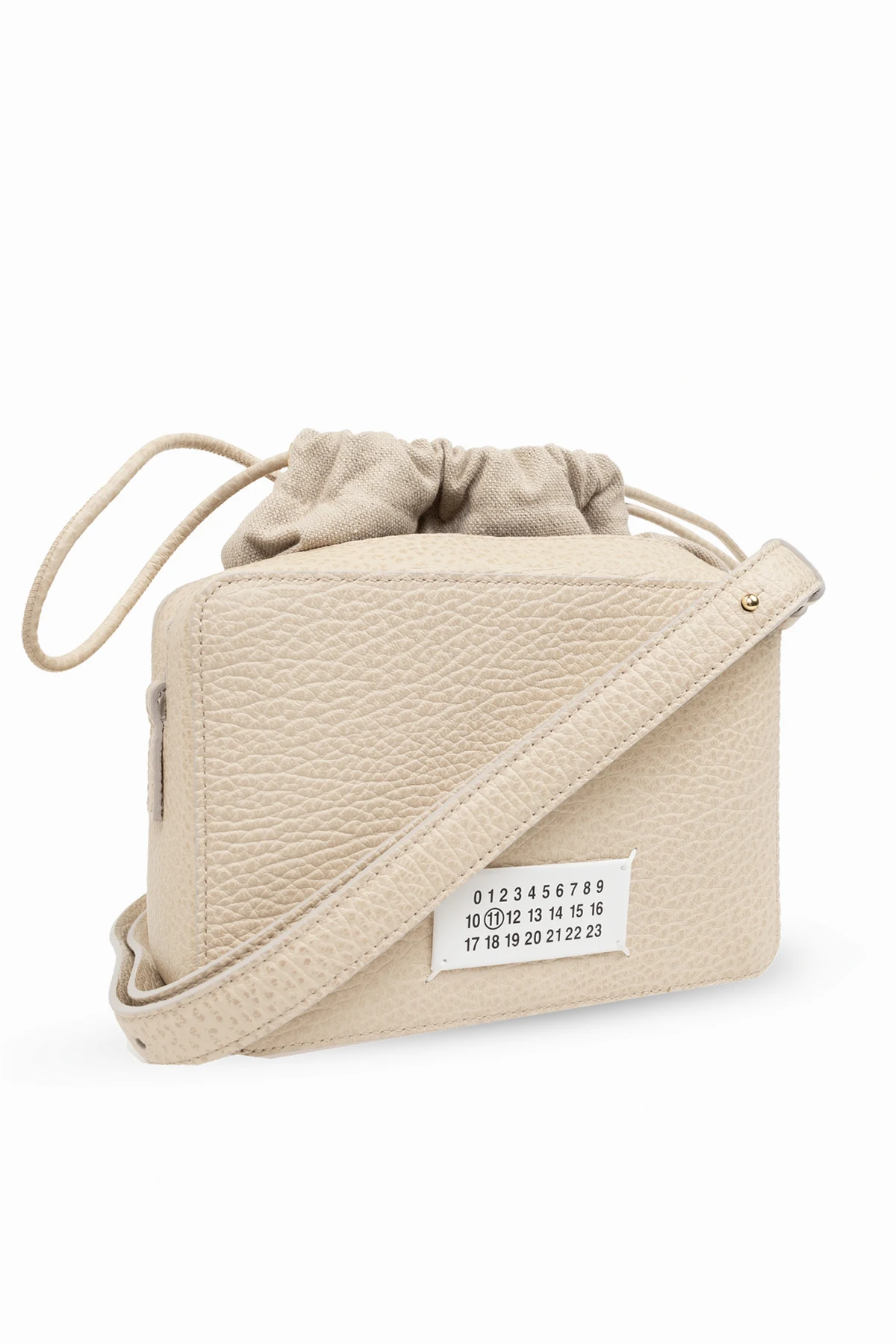 Introducing the exquisite Mini 5AC Shoulder Bag by Maison Margiela, a masterpiece of craftsmanship that melds luxury with practicality. Crafted from premium materials that mimic the texture and appearance of real leather, this bag\'s grainy surface and uniform beige hue exude an air of understated elegance. Its compact, rectangular silhouette is both modern and timeless, featuring a versatile, adjustable, and detachable leather strap that caters to your style and comfort. The bag\'s front is adorned with a distinctive white tag, bearing a series of numbers and letters, reminiscent of a nameplate, which infuses it with a unique character. This detail, along with the engraved name of the designer inside, stands as a testament to its authenticity and the exclusivity of the Maison Margiela brand. The interior reveals a thoughtfully lined beige compartment, complete with a drawstring closure for added security and a zipped pocket for essentials. The flexible opening, with its gathered edges, ensures effortless access to your belongings, marrying functionality with the bag\'s elegant design. Why Purchase This Product? Exclusivity and elegance from the renowned Maison Margiela. Luxurious, leather-like material and meticulous craftsmanship. Unique design elements, including a distinctive nameplate tag and designer engraving. Versatile strap for multiple styling options. Secure compartment with drawstring closure and zipped inner pocket.