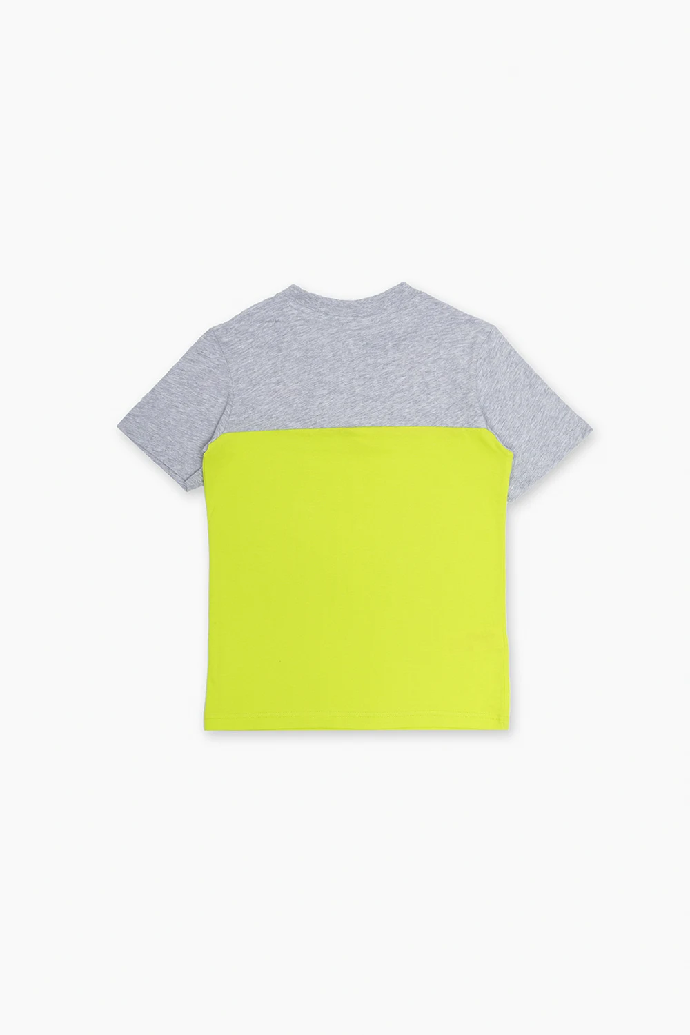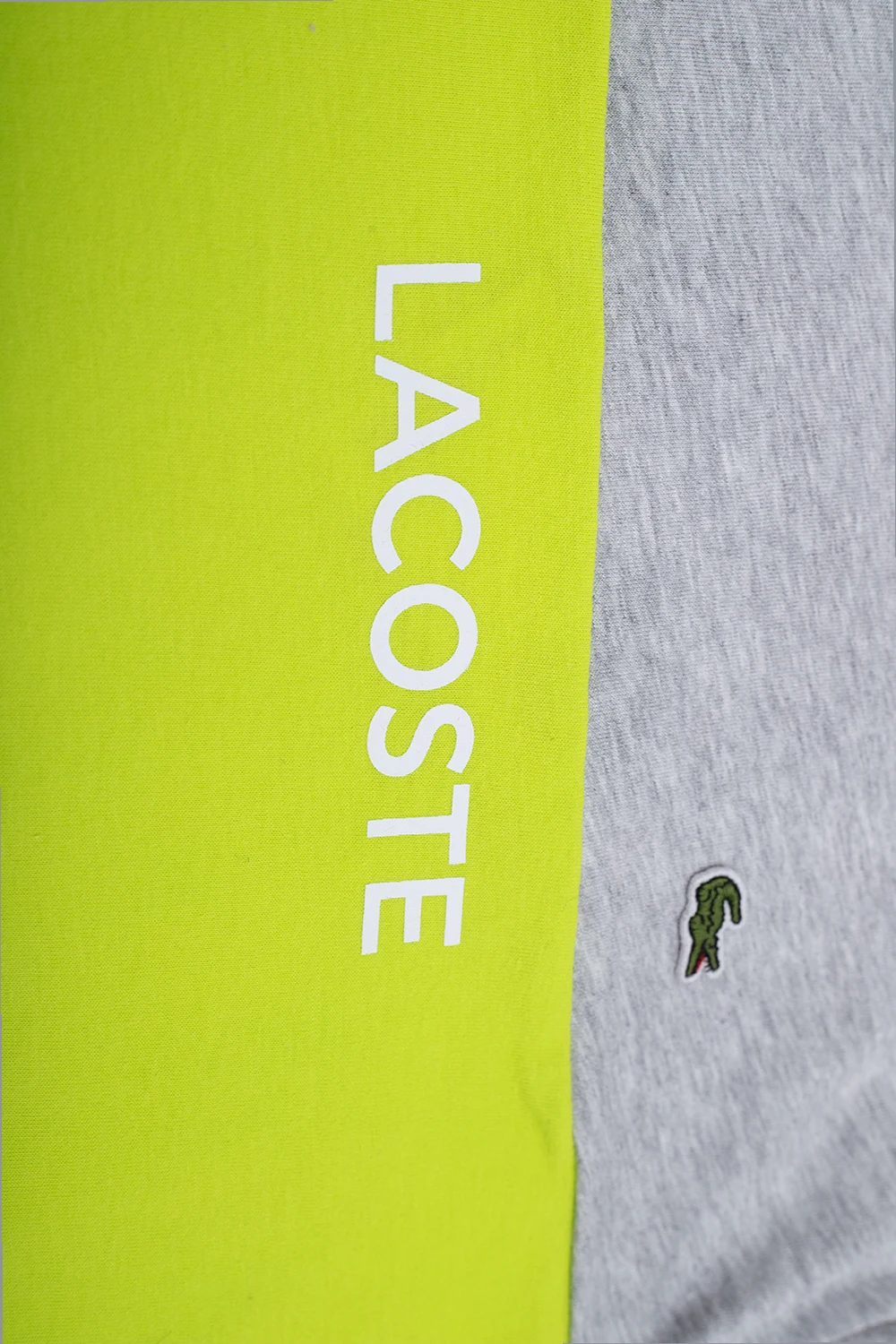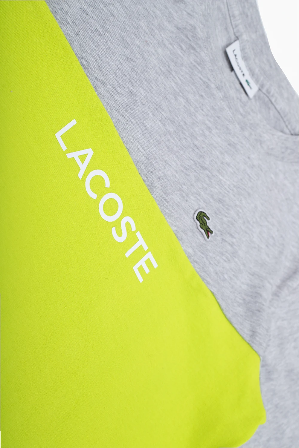Grey and green crewneck T-shirt from Lacoste Kids. Made of cotton, this short sleeve design features a white logo print and multicolored logo patch.